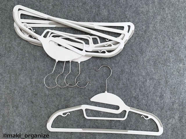 おすすめは、ニトリ「すべりにくい省スペースハンガー レディースサイズ」。ハンガーループ付きなので、スカートやワンピースも掛けることができます。もっと予算を減らしたい場合は、セリア「すべりにくいノンスリップハンガー」5本で110円(税込)も。ただし、在庫切れが多いので一気に揃えるのが難しいこともあるので要注意。
