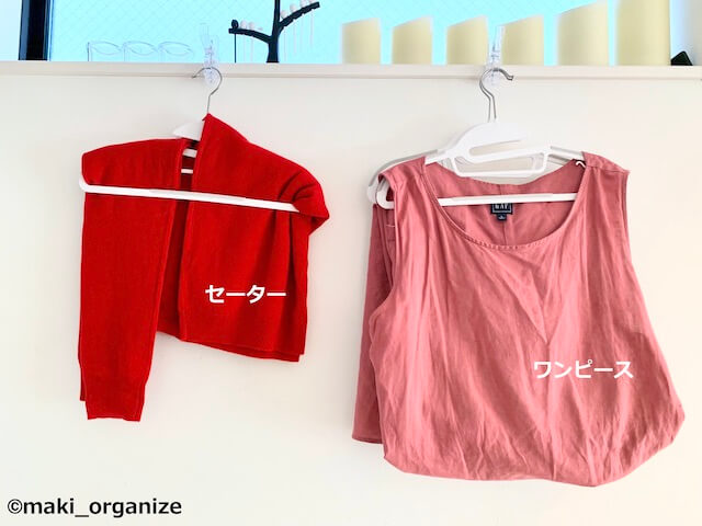 また、クローゼットの長さが足りないなら、「ワンピースを短く吊るす方法」も。セータもワンピースも、その家の空間と状況に応じたダウンサイズになります。それぞれ、調べてみると新アイデアが見つかりますよ。
