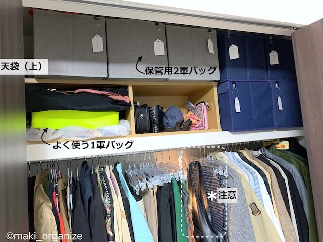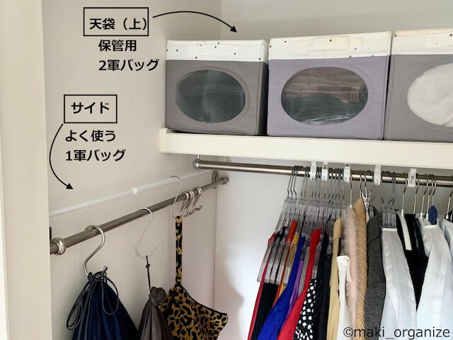 2軍は、クローゼット天袋(上段)に置いています。ここで注意したい点が、ひとつ。レザーバッグを吊るすとハンドル部分に負荷がかかるため劣化を招きます。レザーの場合は、布袋に入れると安心です。