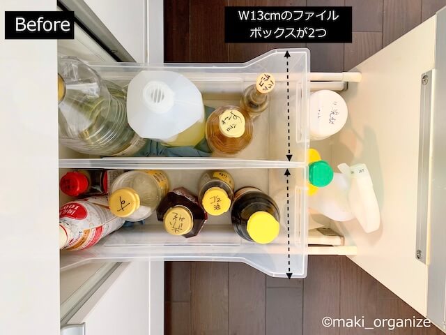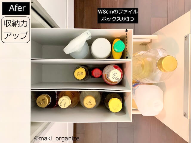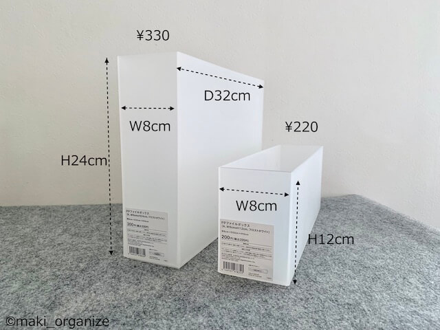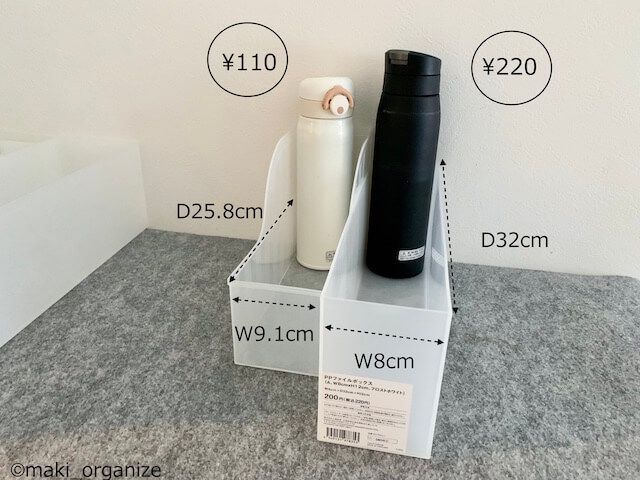 サイゾーウーマン暮らし住まいStandard Productsのコレ便利 暮らし 伊藤まきの「お片付けSOS」相談! ダイソー「Standard Products」のおすすめ! ギュウギュウのキッチンが収納力アップ 2022/09/05 19:45 伊藤まき(収納ライター) 「お片付け・お掃除SOS」伊藤まき 整理収納アドバイザーの伊藤まきが、片付けに訪問した現場で「よくやる作業」「よく伝えるおすすめ収納法」やおすすめアイテムを紹介していきます! プロの技シリーズ26回目は、ダイソーの新業態店舗「Standard Products」で買えるPPファイルボックスシリーズ。各種サイズがそろう中でも、「8cm幅」が一番便利! ありそうでなかったサイズだから、収納力を確実に増やすことができます。今回は、筆者宅のBefore&After写真を交えながらその魅力を紹介していきます。 ダイソー【Standard Products】「PPファイルボックス」シリーズ 4cm間隔のサイズ感。高さがハーフサイズもあります。(C)maki_organize 写真上は、「Standard Products」で見つけた「PPファイルボックス」シリーズです。16cmから8cmまで4cm間隔の幅展開。高さが半分のハーフサイズもあります。 それらの中でも、「8cm幅」のファイルボックスが便利! 【Standard Products】幅8cmの「PPファイルボックス」330円 ハーフサイズもそろいます(C)maki_organize こちらが8cm幅のファイルボックスです。ファイルボックスといえば、10cm幅が一般的。でも、紙モノを保管する量が減った現代は「これぐらいがちょうど良い」サイズ。 片付けで登場が多いニトリとアステージとの差(C)maki_organize 「Standard Products」の幅8cmの両脇に、片付けでよく使うサイズを並べてみました。 横幅約13cmは、ホームセンターで購入したアステージのファイルボックスです。横幅約9.7cmは、ニトリのファイルボックス。無印良品もほぼ同じサイズのものがあります。 【Standard Products】幅8cmが「水筒収納」にぴったり! ニトリのファイルボックスだと余白が多い(C)maki_organize いまでは定番になった水筒も「8cm幅」ならズレずに収まります。写真左側(横幅9.7cm)のニトリだと、空間が余るのでもったいないですよね。ちなみに、これより大きな水筒だと、横幅13cmがちょうど良いサイズです。 100均のものは奥行きも浅い(C)maki_organize 写真左は100均にある横幅約8cm前後のファイルボックス。こちらもサイズが良さそうですが、奥行きも小さくなっているため、引き出しや棚の収納に使うと空間の無駄が出がちです。 またカインズやコクヨにも横幅約8cm前後のファイルボックスはあるものの、買いそろえると予算アップに。ダイソー「Standard Products」ならお財布にも優しいので安心! ファイルボックスの幅を10cmから8cmへ。たった「2cmの差」でも、空間を詰めていくほど収納力が増します。Before→Afterの実例で見てみましょう。 【収納例 Before】スペースが詰まってストックが置けない 幅13cmのファイルボックスを使用時(C)maki_organize 筆者宅のキッチンの引き出しです。Beforeでは、キッチンの調味料入れを「13cmのファイルボックス」で仕切っていました。現状では、ストックの調味料を置く余裕さえありません。 【収納例 After】 幅8cmで収納力アップ(C)maki_organize 幅8cmに変えることで、余白が増えました! キッチン用洗剤のスペースも増えたので、ストックが用意できます。ただし、1Lサイズの調味料ボトル(幅10cm必要)は入りません。500mL前後のハーフボトルに最適です。 次ページからは、「PPファイルボックス」の他サイズ(4cm、12cm、16cm)についても紹介します。 次のページ 【Standard Products】横幅4cmはトレー収納に○ 123次のページ 関連記事 韓国ブランド「LITEM.(リテム)」のインテリア名品! 無印良品やニトリ他よりおすすめのワケ収納のプロが絶賛愛用中! ワッツ110円「メッシュバスケット」は名品です!収納のプロが買わない100均「靴収納グッズ」! 片付かない家によくあるNGアイテムは?片付けの「プロが買わない」100均の収納ボックス10選! ダイソーの○○は優秀トイレ、洗濯機など“隙間”にピッタリ!! ダイソー110円「ジョイントラック」の快適収納術8例