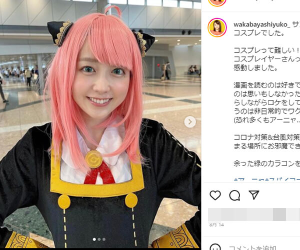 サイゾーウーマン芸能アナウンサー局アナのコスプレ画像7連発! 芸能 スライドショー 局アナのコスプレ画像集! TBS・若林有子はアーニャ、フジ・堤礼実はナミ、日テレ・安村直樹はコウメ太夫…… 2022/10/20 16:00 仲宗根由紀子(エンタメライター) 芸能ウラ情報スライドショー テレビ局のアナウンサーのタレント化が進み、今やインスタグラムの個人アカウントで自由に情報発信する時代。最近は、番組の企画で人気アニメのキャラクターやディズニープリンセスのコスプレに挑戦したことを報告するアナウンサーも目立ち、「かわいい!」「アナウンサーがすることではない」などと賛否を呼んでいます。というわけで、今回はその中から選りすぐりの7枚を紹介! 永島優美インスタグラムより■堤礼実、生田竜聖、永島優美、山本賢太、小室瑛莉子、勝野健(フジテレビ) 9月11日に放送された『FNSラフ&ミュージック2022~歌と笑いの祭典~』では、映画『ONE PIECE FILM RED』の登場人物に扮した局アナ9人がダンスを披露。放送後には、永島優美アナのインスタグラムが更新され、ウタに扮した永島に加え、堤礼実(ナミ)、生田竜聖(ルフィ)、山本賢太(シャンクス)、小室瑛莉子(ロー)、勝野健(ゾロ)の6人ショットが公開されました。 永島アナは「“声”で人を笑顔にするウタ。今回ダンスを通して、その意味を改めて考えさせられました。必死に一緒に練習した仲間たちとは、いつか宴をしようと約束しています」とつづっており、コメント欄では生田アナが「よーし!!宴だァ!!!」と返しています。 若林有子インスタグラムより■若林有子(TBS) 8月に開催されたイベント『コミックマーケット100』に、漫画『SPY×FAMILY』(集英社)のアーニャのコスプレ姿で参加したTBSの若林有子アナウンサー。「サンジャポロケにて、人生初コミケ&人生初コスプレでした」といい、「コスプレって難しい!!そして大変! コスプレイヤーさんって本当にすごいなと、間近で見て改めて感動しました」とコスプレイヤーに賛辞を送っています。 ロケ中は、「私これ大丈夫…?とずっと不安を漏らし」ていたそうですが、「自分以外の誰かになるというのは非日常的でワクワクする体験」だったとか。「余った緑のカラコンをどうしようかだけ悩み中」とのことで、コメント欄には「これからもコスプレ続けてほしい」との要望が寄せられていました。 後呂有紗インスタグラムより■後呂有紗(日本テレビ) 日本テレビの後呂有紗アナウンサーが9月30日、自身のインスタグラムを更新。「写真のコスプレ衣装は、銀魂の猿飛あやめさんです」とつづり、今月6日放送の『ぐるぐるナインティナイン』の人気企画「ダレダレ?コスプレショー」に出演した際のコスプレ姿を披露しました。 着なれない様子の後呂アナは、「やはりギョッとしますね?笑 すみません!」となぜか謝罪。コメント欄では同局・山崎誠アナが「さっちゃん!!!」と反応しています。 『バゲット』インスタグラムより■安村直樹(日本テレビ) 日本テレビの安村直樹アナウンサーは、10月6日放送の『ぐるぐるナインティナイン』の番宣のため、同日放送の『スッキリ』にコウメ太夫のコスプレで登場。司会の極楽とんぼ・加藤浩次が「誰?」とすっとぼけると、安村アナは「コウメ太夫だと思ったら~安村直樹でした~♪ チックショー!」とネタのモノマネで正体を明かしていました。 この日は、この格好のまま『バゲット』にも登場した安村アナ。『バゲット』公式Twitterでは、その勇姿を見ることができます。 斎藤ちはるインスタグラムより