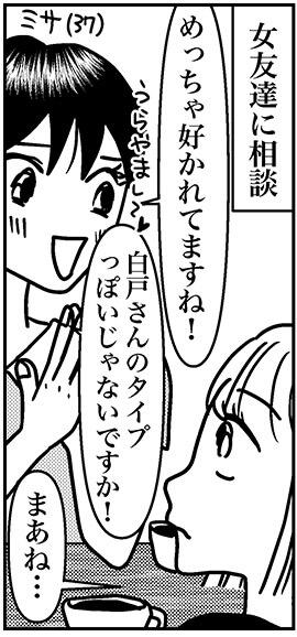 サイゾーウーマンカルチャーマンガ【アラフォー婚活ルポ】絶対付き合う流れだけど、これでいいのか? カルチャー まんが『オバサンと言われても結婚したい!』191話 【アラフォー婚活ルポ】絶対付き合う流れだけど、これでいいのか? 2022/12/07 13:30 白戸ミフル(マンガ家) オバサンと言われても結婚したい! 友達に相談 ――続きは12月11日公開! 【アラフォー婚活ルポ】2回目のデートで“スキ”とは言われたけど、○○はなし?――合コン歴20年以上、累計回数2,500回以上、30代なかばに乳がんで闘病するも、現在は絶賛婚活中のライター・漫画家の白戸ミフルが「アラフォー婚活」の実体験をほぼリアルタ...サイゾーウーマン2022.12.04 【アラフォー婚活ルポ】LINEだと積極的なデザイナーの彼! 早くも2回目のデートへ――合コン歴20年以上、累計回数2,500回以上、30代なかばに乳がんで闘病するも、現在は絶賛婚活中のライター・漫画家の白戸ミフルが「アラフォー婚活」の実体験をほぼリアルタ...サイゾーウーマン2022.11.30 ――バックナンバーはこちら 前のページ123 白戸ミフル(マンガ家) 神奈川県出身。漫画家・ライター。タレント活動の後、マスコミ系の職業を渡り歩き、現在は化粧品メーカーに勤務。合コン歴20年以上、累計回数2500回以上。女性向けwebメディアほか、男性向けメディア、旅系メディア等でライターとして幅広く執筆。著書『合コン・アンド・ザ・シティ 恋活・婚活女子の合コンマニュアル』(ごきげんビジネス出版)、 『乳がんステージ4だった私が、それでも合コンに行きまくって救われた話』(キノブックス) 記事一覧 X:@takara0722 Instagram:@tamifull0722 【アラフォー闘病&婚活記】 最終更新:2022/12/07 13:30 嫌ではないけど、大好きでもないって感じ? 関連記事 【アラフォー婚活ルポ】アプリで出会った彼氏とスピード破局! イケメンだったのに惜しいことした?【アラフォー婚活ルポ】アプリ婚活を再開! コミュニティで共通の話題のある人を探す!【アラフォー婚活ルポ】なんつーイケメン!!! 銀座に降臨した美しき婚活男性【アラフォー婚活ルポ】39歳でフラれた私は「鬼」になった! 恋愛してやる!! 【アラフォー婚活ルポ】結婚相談所の紹介は○○……アラフォー3人、2021年の婚活を振り返る! その他の作品を読む 次の記事 NEWS・小山、MCが長くなる原因 >