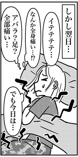サイゾーウーマンカルチャーマンガアラフォー婚活、デートなのに全身痛い カルチャー まんが『オバサンと言われても結婚したい!』200話 【アラフォー婚活ルポ】全身が痛い! 彼との久しぶりのデートなのに…… 2023/01/08 13:30 白戸ミフル(マンガ家) オバサンと言われても結婚したい! しかし翌日…… ――続きは1月11日公開! 【アラフォー婚活ルポ】年下彼氏と微妙な中、先輩と行ったクラブで○○を発見!――合コン歴20年以上、累計回数2,500回以上、30代なかばに乳がんで闘病するも、現在は絶賛婚活中のライター・漫画家の白戸ミフルが「アラフォー婚活」の実体験をほぼリアルタ...サイゾーウーマン2023.01.04 【アラフォー婚活ルポ】年下彼氏からの誘いにイラッ! 気になる大人男子とは……――合コン歴20年以上、累計回数2,500回以上、30代なかばに乳がんで闘病するも、現在は絶賛婚活中のライター・漫画家の白戸ミフルが「アラフォー婚活」の実体験をほぼリアルタ...サイゾーウーマン2023.01.01 ――バックナンバーはこちら 前のページ123 白戸ミフル(マンガ家) 神奈川県出身。漫画家・ライター。タレント活動の後、マスコミ系の職業を渡り歩き、現在は化粧品メーカーに勤務。合コン歴20年以上、累計回数2500回以上。女性向けwebメディアほか、男性向けメディア、旅系メディア等でライターとして幅広く執筆。著書『合コン・アンド・ザ・シティ 恋活・婚活女子の合コンマニュアル』(ごきげんビジネス出版)、 『乳がんステージ4だった私が、それでも合コンに行きまくって救われた話』(キノブックス) 記事一覧 X:@takara0722 Instagram:@tamifull0722 【アラフォー闘病&婚活記】 最終更新:2023/01/08 13:30 果たして彼氏とは会えるのか…… 関連記事 【アラフォー婚活ルポ】アプリで出会った彼氏とスピード破局! イケメンだったのに惜しいことした?【アラフォー婚活ルポ】アプリ婚活を再開! コミュニティで共通の話題のある人を探す!【アラフォー婚活ルポ】なんつーイケメン!!! 銀座に降臨した美しき婚活男性【アラフォー婚活ルポ】39歳でフラれた私は「鬼」になった! 恋愛してやる!! 【アラフォー婚活ルポ】結婚相談所の紹介は○○……アラフォー3人、2021年の婚活を振り返る! その他の作品を読む 次の記事 SUGIZO、自身のルーツを語る >