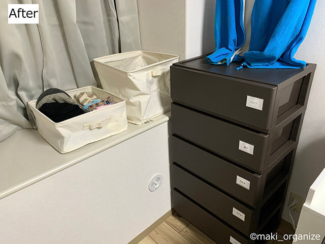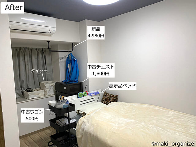 サイゾーウーマン暮らし住まい中古家具で激安部屋作り! 暮らし [連載]女たちの「煩悩部屋」ビフォーアフター 片付けのプロが「リラックスできる寝室」の作り方を徹底解説! 超簡単な洋服収納術も 2023/02/07 17:00 伊藤まき(収納ライター) 「汚部屋」ビフォーアフター 【After】中古家具で部屋作り&洋服収納術 ベッドは展示品セールで購入(C)maki_organize リフォームで壁紙と床材を交換。雰囲気がガラリと変わりますね。すべて、ベテランの職人さんが張り替えてくれたので隅まで美しい仕上がり。 リフォーム後に揃えた家具のほとんどは、中古品です。小物もセールで集めました。また、1人で部屋から運べるサイズと重さで選びました。 中古品は2月〜3月が狙いどき! 組み立ての手間を省けるのも楽!(C)maki_organize プラスチック製のチェストは、中古品で1,800円。2〜3月は、中古品が一番多く出る時期です。なお、ホームクリーニングやリフォーム会社も繁忙期が終わるので、お手入れにより時間をかけてくれる場合も。 片付けが苦手な人は「投げるだけ」がラク! 中古チェストは拭き掃除でピカピカ!(C)maki_organize 高齢の親が管理するので「1箱1種類」で収納します。引き出しの中に箱を置いて、春夏用と秋冬用にざっくり分け。毎日出し入れする下着類を上段に、下段は腰を下ろさなくてはいけないため、控えの洋服だけに分けます。 ダイソー「シンプル収納ボックス」を活用 プラスチック製ではないので処分も簡単(C)maki_organize ゴミ屋敷実家ではプラスチックケースの処分に苦戦したため、今回はダイソー「シンプル収納ボックス」を選びました。ハンカチといった小物と、脱いだ洋服入れです。 オール330円以内! 収納のプロが紹介、ダイソー布製「シンプル収納ボックス」はランドリーやカラーボックスにぴったり整理収納アドバイザーの伊藤まきが、片付けに訪問した現場で「よくやる作業」「よく伝えるおすすめ収納法」やおすすめアイテムを紹介していきます! プロの技シリーズ34回目は、...サイゾーウーマン2022.11.01 次のページ 天井の梁を生かした「吊るし収納」 前のページ123次のページ 関連記事 黒カビだらけ玄関がセリアのアレで大激変! 低予算リフォーム「ビフォーアフター」【予算660円】ウタマロ&100均アイテムでカビだらけの下駄箱が激変! プロが教えるセルフ掃除術汚部屋マンションビフォーアフター! 2,000円以内のパーツ交換で大激変&掃除も楽に掃除がラクに! 100均でも揃う「汚れ予防」グッズ3選&プロが教える活用法とは?【万能】「クリーナー30」使用例&ビフォーアフター! コレ1本で10種類の汚れスッキリ