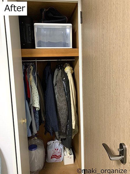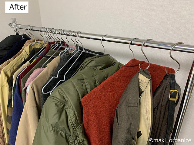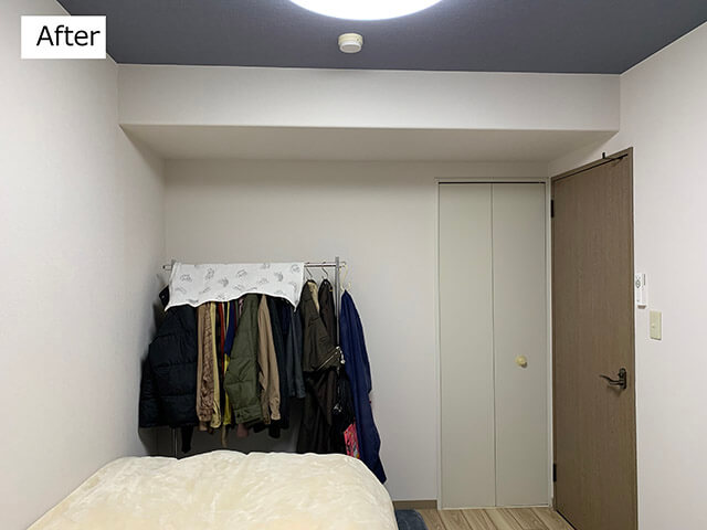 サイゾーウーマン暮らし住まい中古家具で激安部屋作り! 暮らし [連載]女たちの「煩悩部屋」ビフォーアフター 片付けのプロが「リラックスできる寝室」の作り方を徹底解説! 超簡単な洋服収納術も 2023/02/07 17:00 伊藤まき(収納ライター) 「汚部屋」ビフォーアフター 天井の梁を生かした「吊るし収納」 室内干しも、かっこいい感じに(C)maki_organize 天井に設置した「ウォールハンガー」のみ、新品で購入。5.5畳と狭く、小さなクローゼットだけの部屋なので、天井の梁(凸)を使って「吊るし収納」にしました。下地の強度工事が必要な場合もあるので、設置する際はリフォーム会社に相談をすると◎。 中古のキャスター付き「ハンガーラック」 ダメージがない洋服だけ残し、すべて洗濯(C)maki_organize 洋服の収納には、キャスター付きハンガーラック(中古で2,000円)も使いました。ラックには、今シーズンの洋服だけ並べます。 ハンガーは100均で揃えます(C)maki_organize ズボン用のハンガーを使うとコーデ管理がしやすいですが、両手を使うので高齢の親には難しい……。写真上のようにS字フックに「ベルトループ」をかければ、片手で済むので簡単。高齢者の場合、背中を丸めることなく「置くだけ」「掛けるだけ」のやさしい収納です。 開閉しにくいクローゼットは、あえて使わない 衣替えの洋服と冠婚葬祭用のみ(C)maki_organize 折戸の扉で出し入れが難しいクローゼット。使いにくいので「使用頻度の低い」モノ入れにしました。これがもし子ども部屋なら、扉を外してカーテンに変えるなどの方法もアリ。リフォーム予算があれば、隣の部屋とつなげてクローゼットを作り直すなど「使い方」も変わります。 黒カビだらけ玄関がセリアのアレで大激変! 低予算リフォーム「ビフォーアフター」中古マンション再生! 連載企画「汚部屋 ビフォーアフター」は、筆者の「新しい実家」です。実家じまいを経て、中古マンションへと住み替えました。築30年分の汚れを、部分リフォー...サイゾーウーマン2023.01.31 前のページ123 伊藤まき(収納ライター) 収納ライター・兼・整理収納アドバイザー1級。クリンネスト2級。おがくず工場に生まれ、ホテル清掃員、国鉄系レストランの厨房、内装会社、デパートの搬入搬出など“家事の土台”を極めた生活を経て、出版社入社ののち独立、現在に至る。モノを手放すほど「幸運」が舞い込むジンクスを何度も体感! 貧乏神と決別した実体験をもって、整理収納の威力をお伝えします。 記事一覧 Instagram:@maki_organize 最終更新:2023/02/07 17:00 パンツ収納のS字フックは今すぐ実践したい 関連記事 黒カビだらけ玄関がセリアのアレで大激変! 低予算リフォーム「ビフォーアフター」【予算660円】ウタマロ&100均アイテムでカビだらけの下駄箱が激変! プロが教えるセルフ掃除術汚部屋マンションビフォーアフター! 2,000円以内のパーツ交換で大激変&掃除も楽に掃除がラクに! 100均でも揃う「汚れ予防」グッズ3選&プロが教える活用法とは?【万能】「クリーナー30」使用例&ビフォーアフター! コレ1本で10種類の汚れスッキリ 次の記事 キンプリ・平野の秘密とは >