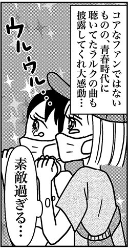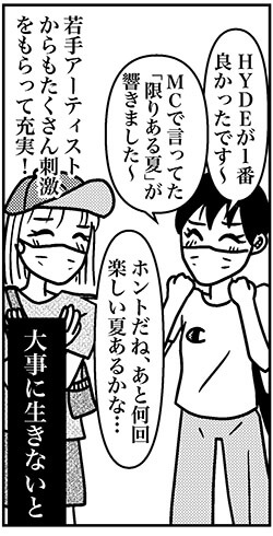 サイゾーウーマンカルチャーマンガアラフォー婚活、夏フェスで歌手の美に感動 カルチャー まんが『オバサンと言われても結婚したい!』221話 【アラフォー婚活ルポ】50歳過ぎてるよね? 夏フェスであの歌手の美しさに感動! 2023/03/22 13:30 白戸ミフル(マンガ家) オバサンと言われても結婚したい! 刺激をもらって充実! ――続きは3月26日公開! 【アラフォー婚活ルポ】年上男子と試しにデート……見た目は普通だけど楽しい!――合コン歴20年以上、累計回数2,500回以上、30代なかばに乳がんで闘病するも、現在は絶賛婚活中のライター・漫画家の白戸ミフルが「アラフォー婚活」の実体験をほぼリアルタ...サイゾーウーマン2023.01.29 【アラフォー婚活ルポ】アプリで出会った彼氏の結婚願望を聞く! 返ってきた答えは……――合コン歴20年以上、累計回数2,500回以上、30代なかばに乳がんで闘病するも、現在は絶賛婚活中のライター・漫画家の白戸ミフルが「アラフォー婚活」の実体験をほぼリアルタ...サイゾーウーマン2023.01.22 ――バックナンバーはこちら 前のページ123 白戸ミフル(マンガ家) 神奈川県出身。漫画家・ライター。タレント活動の後、マスコミ系の職業を渡り歩き、現在は化粧品メーカーに勤務。合コン歴20年以上、累計回数2500回以上。女性向けwebメディアほか、男性向けメディア、旅系メディア等でライターとして幅広く執筆。著書『合コン・アンド・ザ・シティ 恋活・婚活女子の合コンマニュアル』(ごきげんビジネス出版)、 『乳がんステージ4だった私が、それでも合コンに行きまくって救われた話』(キノブックス) 記事一覧 X:@takara0722 Instagram:@tamifull0722 【アラフォー闘病&婚活記】 最終更新:2023/03/22 13:30 HYDEは現在54歳! 関連記事 【アラフォー婚活ルポ】アプリで出会った彼氏とスピード破局! イケメンだったのに惜しいことした?【アラフォー婚活ルポ】アプリ婚活を再開! コミュニティで共通の話題のある人を探す!【アラフォー婚活ルポ】なんつーイケメン!!! 銀座に降臨した美しき婚活男性【アラフォー婚活ルポ】39歳でフラれた私は「鬼」になった! 恋愛してやる!! 【アラフォー婚活ルポ】結婚相談所の紹介は○○……アラフォー3人、2021年の婚活を振り返る! その他の作品を読む 次の記事 キンプリ岸の“後釜”にふさわしい人トップ3 >
