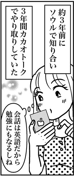 サイゾーウーマンカルチャーマンガアラフォー婚活、韓国男子と再会なるか カルチャー まんが『オバサンと言われても結婚したい!』222話 【アラフォー婚活ルポ】韓国男子と再会なるか……2年ぶりの海外旅行へ! 2023/03/26 13:30 白戸ミフル(マンガ家) オバサンと言われても結婚したい! 海外婚活で知り合った…… 次のページ 1人でも行こう 前のページ123次のページ 関連記事 【アラフォー婚活ルポ】アプリで出会った彼氏とスピード破局! イケメンだったのに惜しいことした?【アラフォー婚活ルポ】アプリ婚活を再開! コミュニティで共通の話題のある人を探す!【アラフォー婚活ルポ】なんつーイケメン!!! 銀座に降臨した美しき婚活男性【アラフォー婚活ルポ】39歳でフラれた私は「鬼」になった! 恋愛してやる!! 【アラフォー婚活ルポ】結婚相談所の紹介は○○……アラフォー3人、2021年の婚活を振り返る! その他の作品を読む