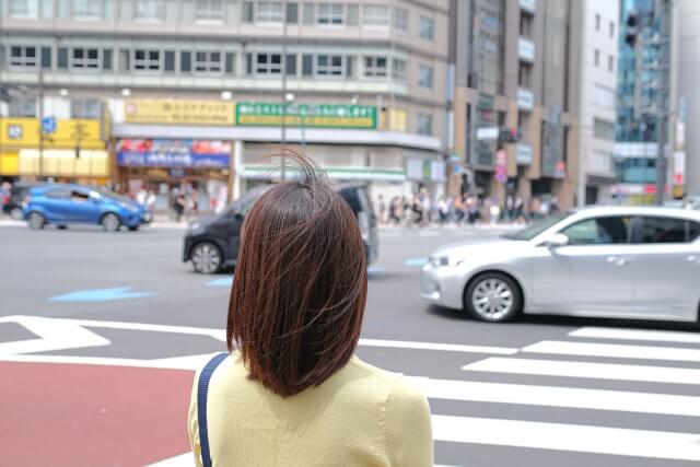 横断歩道で立ち止まっている女性の後ろ姿の画像
