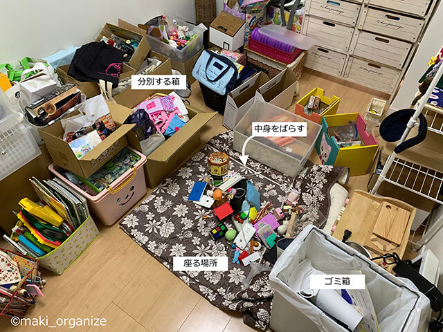 サイゾーウーマン暮らし住まい散らかった部屋の片付け手順10ステップ 暮らし [連載]女たちの「煩悩部屋」ビフォーアフター 【汚部屋】散らかった部屋の片付け手順10ステップ! 専門家が写真付きで詳しく解説 2023/07/18 17:00 伊藤まき(収納ライター) 「汚部屋」ビフォーアフター 【片付け手順ステップ1】分別作業がはかどる「ポジション作り」 箱や袋の中身をぜんぶ出して、とことん仕分ける(C)maki_organize 作業できる空間をキープしたら、バスタオルなど大きな布を床に敷きます。そして、作業する自分の右側にゴミ箱を。左側に「分別用の箱」と「売る箱」を置きました。 【片付け手順ステップ2】ぜんぶ出して、ざっくり「種類別に分ける」 箱の中にごちゃ混ぜのモノがいっぱい(C)maki_organize まずは、ざっくりと「同じグループのモノ」をまとめます。例えば、缶など(赤丸)は「小箱」として括り、携帯やコード(緑丸)などはガジェット類へ。メモ帳(紫丸)は文房具類、その他はすべて、フィギュアコレクションといった感じです。なお、白丸は処分するモノです。 【片付け手順ステップ3】本人以外も片付け作業に参加 小物は座りながら楽しく作業しやすい(C)maki_organize ざっくりと、種類別に分けた箱たちです。今回は、筆者が分けてからDさんに中身を確認してもらう場面もあり、そのほうが、モノを減らすスピードも早くなります。本人が分けながら捨てたり、家族がまとめてから捨てモノを出すといったやり方もできますよ。 【片付け手順ステップ4】家から出すモノの分類 地味な作業ですが、手放す力がアップします(C)maki_organize 「譲るモノを入れる箱」「売るモノを入れる箱」なども用意して、家から出すモノも仕分けましょう。分け方に迷う場合は「その他」の箱を用意しても可。作業が進むほど判断力がつくので、最後にジャッジすればOKです。 次のページ 【片付け手順ステップ5】モノの山を崩す作業をひたすら繰り返す 前のページ1234次のページ 関連記事 【汚部屋片付け】大量カバンの収納術を専門家が写真で解説! 種類分けは「4つ」がポイントIKEAの「ハンギング収納」徹底解説! 片付け専門家が教える「たたまない」クローゼットの作り方【クローゼット収納】片付けのプロが「ニトリのハンガー」選ぶ理由――ビフォアフター徹底解説「狭いクローゼット」収納アイデア8選! プロが教える「洋服を捨てない」片付け術片付けのプロが指摘する「クローゼットのNG収納」! 服の脱ぎ散らかしはコレで解決