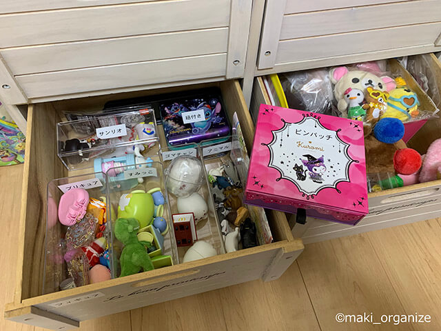 サイゾーウーマン暮らし住まい散らかった部屋の片付け手順10ステップ 暮らし [連載]女たちの「煩悩部屋」ビフォーアフター 【汚部屋】散らかった部屋の片付け手順10ステップ! 専門家が写真付きで詳しく解説 2023/07/18 17:00 伊藤まき(収納ライター) 「汚部屋」ビフォーアフター 【片付け手順ステップ9】収納空間に「種類分けしたモノ」をまとめる コレクショングッズを中心に収納(C)maki_organize 引き出しの中に、コレクション雑貨の「フィギュア」と「キャラグッズ」を収納しました。空き箱を使って、さらに「ジャンル分け」していきます。また、入っているモノがわかるように「透明の袋」にぬいぐるみをまとめました。たくさんあった可愛い缶も、「ラベル」を貼って使います。 【片付け手順ステップ10】引き出しには外ラベルも必要! 小さな家電コーナーを作るのもおすすめ(C)maki_organize 引き出しの中身をぜんぶ入れ替え、「外側のラベル」も貼りました。開ける前から、引き出しの中身がわかるようにします。収納方法も、上から見渡せるようにすると◎。重ねたり埋もれたりしないように入れるのがポイントです。 最後に、片付けた場所のBefore・Afterです。 【片付け比較】Before→After:部屋の中にスペースが! [Before]埃まみれの小物は洗って乾かしました(C)maki_organize [After 途中経過]不要になった本は、買取額約500円(C)maki_organize どんなに小さなモノでも、挫折せずにとことん「処分」「残す」「分別」した結果、部屋の中にスペースを作ることができました。長い間、持っているだけなら「見直す作業」でスッキリ。 なお、白いチェスト以外はすべて、この部屋から出す予定です。片付けの最終日には空っぽになるので、最後までお楽しみに! 【汚部屋片付け】大量カバンの収納術を専門家が写真で解説! 種類分けは「4つ」がポイント連載企画『「汚部屋」ビフォーアフター』新シーズンがスタート! 第7回目の片付けモニターの応募に当選したのは、東京都中野区・3LDKのマンションに家族と暮らすDさん(40歳)...サイゾーウーマン2023.07.11 前のページ1234 伊藤まき(収納ライター) 収納ライター・兼・整理収納アドバイザー1級。クリンネスト2級。おがくず工場に生まれ、ホテル清掃員、国鉄系レストランの厨房、内装会社、デパートの搬入搬出など“家事の土台”を極めた生活を経て、出版社入社ののち独立、現在に至る。モノを手放すほど「幸運」が舞い込むジンクスを何度も体感! 貧乏神と決別した実体験をもって、整理収納の威力をお伝えします。 記事一覧 Instagram:@maki_organize 最終更新:2023/07/18 17:00 床が見えるようになった! 関連記事 【汚部屋片付け】大量カバンの収納術を専門家が写真で解説! 種類分けは「4つ」がポイントIKEAの「ハンギング収納」徹底解説! 片付け専門家が教える「たたまない」クローゼットの作り方【クローゼット収納】片付けのプロが「ニトリのハンガー」選ぶ理由――ビフォアフター徹底解説「狭いクローゼット」収納アイデア8選! プロが教える「洋服を捨てない」片付け術片付けのプロが指摘する「クローゼットのNG収納」! 服の脱ぎ散らかしはコレで解決 次の記事 嵐・二宮、ラジオの待遇に不満 >