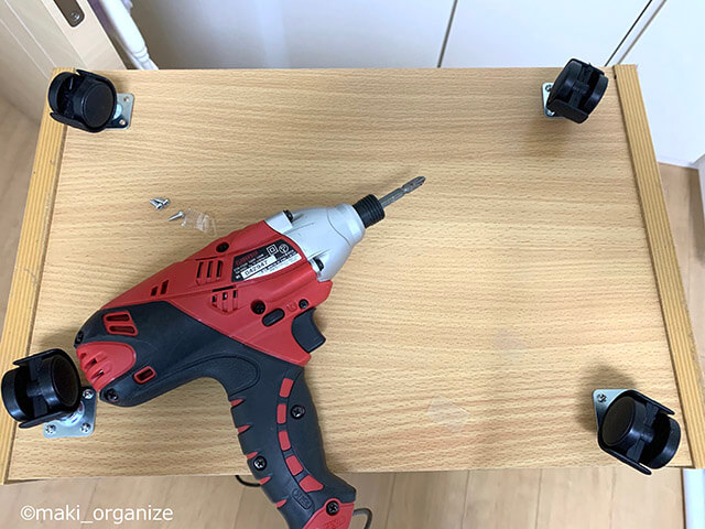 サイゾーウーマン暮らし住まい「片付けたくなる」おもちゃ収納アイディア! 暮らし [連載]女たちの「煩悩部屋」ビフォーアフター 「片付けない」おもちゃ収納術をプロが伝授! カラボと100均だけでオシャレにスッキリ 2023/07/25 17:00 伊藤まき(収納ライター) 「汚部屋」ビフォーアフター 【おもちゃ収納の作り方1】ドライバーでキャスターを固定 ネジ付きなのはダイソーだけ(C)maki_organize カラーボックスの天地を反対にして底面側に、ダイソー「プレート双輪キャスター30mm(2個入)」を取り付けます。今回は電動ドリルを使用しましたが、手動のドライバーでの取り付けも簡単です。 【おもちゃ収納の作り方2】100均グッズでカスタム 100均の「ジオラマグッズ」が簡単(C)maki_organize カラボ本体が楽しい道具になるよう、好きな色、柄の生地を貼ってリメイクします。今回は「お人形遊びグッズの収納」なので、セリアの「LAWN STYLE Remake Sheet」を芝生に見立てて使いました。100均のフェルトやタイルシールなど、質感で遊ぶのも◎です。 カラボ組み立て前に貼るとよりキレイに(C)maki_organize また、カラボの背面にセリアのリメイクシート(ピンク)を貼りました。マスキングテープや壁紙のサンプルなどカラフルな絵柄を一緒に選んでも良いですね。子どもが好きな色、選んだ色なら愛着も増します。 キャンドゥのリメイクシート 色味がはっきりしているほど子どもウケ◎(C)maki_organize カラボの背面にリメイクシートを貼る場合は、組み立て前に行います。キャンドゥの壁紙シートの場合、カラボの背面サイズと同じぐらいの大きさなので1枚で済みます。ほか、SHEIN(シーイン)の「インテリア ステッカー 壁紙」から選ぶと、派手で可愛い色と柄がみつかります。 キャスターを付けてリメイクを楽しんだら、人形遊びグッズを飾りながら子どもに収納してもらいましょう! 次のページ 【おもちゃ収納のBefore】空いている場所を探して遊んでいた 前のページ123次のページ 関連記事 【汚部屋】散らかった部屋の片付け手順10ステップ! 専門家が写真付きで詳しく解説【汚部屋片付け】大量カバンの収納術を専門家が写真で解説! 種類分けは「4つ」がポイントIKEAの「ハンギング収納」徹底解説! 片付け専門家が教える「たたまない」クローゼットの作り方【クローゼット収納】片付けのプロが「ニトリのハンガー」選ぶ理由――ビフォアフター徹底解説「狭いクローゼット」収納アイデア8選! プロが教える「洋服を捨てない」片付け術
