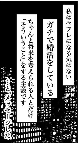 サイゾーウーマンカルチャーマンガアラフォー婚活、セフレにはならない! カルチャー まんが『オバサンと言われても結婚したい!』259話 【アラフォー婚活ルポ】セフレになる気はない! 「けじめ」のメッセージに対する返信は…… 2023/08/02 13:30 白戸ミフル(マンガ家) オバサンと言われても結婚したい! メッセージを送る ――続きは8月6日公開! 【アラフォー婚活ルポ】イケメンだった彼の変わり果てた姿にびっくり! 2カ月でそんなに……――合コン歴20年以上、累計回数2,500回以上、30代なかばに乳がんで闘病するも、現在は絶賛婚活中のライター・漫画家の白戸ミフルが「アラフォー婚活」の実体験をほぼリアルタ...サイゾーウーマン2023.07.26 【アラフォー婚活ルポ】普段は優しい彼なのに……ホテルの前での一言に困惑――合コン歴20年以上、累計回数2,500回以上、30代なかばに乳がんで闘病するも、現在は絶賛婚活中のライター・漫画家の白戸ミフルが「アラフォー婚活」の実体験をほぼリアルタ...サイゾーウーマン2023.07.30 ――バックナンバーはこちら 前のページ123 白戸ミフル(マンガ家) 神奈川県出身。漫画家・ライター。タレント活動の後、マスコミ系の職業を渡り歩き、現在は化粧品メーカーに勤務。合コン歴20年以上、累計回数2500回以上。女性向けwebメディアほか、男性向けメディア、旅系メディア等でライターとして幅広く執筆。著書『合コン・アンド・ザ・シティ 恋活・婚活女子の合コンマニュアル』(ごきげんビジネス出版)、 『乳がんステージ4だった私が、それでも合コンに行きまくって救われた話』(キノブックス) 記事一覧 X:@takara0722 Instagram:@tamifull0722 【アラフォー闘病&婚活記】 最終更新:2023/08/02 13:30 誤解とは……? 関連記事 【アラフォー婚活ルポ】アプリで出会った彼氏とスピード破局! イケメンだったのに惜しいことした?【アラフォー婚活ルポ】アプリ婚活を再開! コミュニティで共通の話題のある人を探す!【アラフォー婚活ルポ】なんつーイケメン!!! 銀座に降臨した美しき婚活男性【アラフォー婚活ルポ】39歳でフラれた私は「鬼」になった! 恋愛してやる!! 【アラフォー婚活ルポ】結婚相談所の紹介は○○……アラフォー3人、2021年の婚活を振り返る! その他の作品を読む 次の記事 『それスノ』性加害問題の影響は…… >