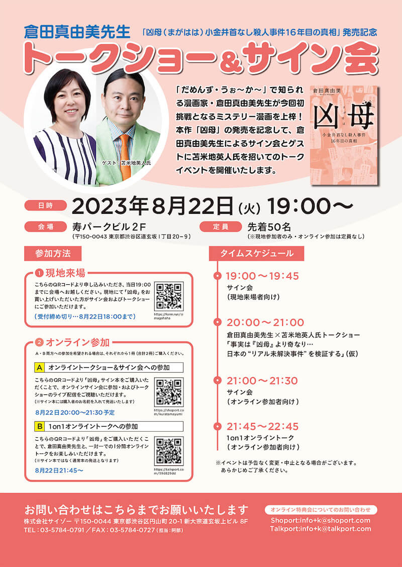 サイゾーウーマン倉田真由美&苫米地英人トークショーも! 『凶母』オンラインサイン会が8月22日に開催決定 その他 倉田真由美&苫米地英人トークショーも! 『凶母』オンラインサイン会が8月22日に開催決定 2023/08/09 17:00 サイゾーウーマン編集部(@cyzowoman) 倉田真由美先生『凶母』発売記念トークショー&サイン会が開催決定! 「だめんず・うぉ~か~」で知られる漫画家・倉田真由美先生が今回初挑戦となるミステリー漫画を上梓! 本作「凶母」の発売を記念して、倉田真由美先生によるサイン会と、ゲストに苫米地英人氏を招いてのトークイベントを開催いたします。ライブ配信も行いますので、遠方にお住まいの方もふるってお申し込みください。 イベント詳細 【日時】2023年8月22日(火)19:00~ (開場は18:30を予定しております) 【会場】寿パークビル2F (〒150-0043 東京都渋谷区道玄坂1丁目20-9) 【定員】先着50名 (※現地参加者のみ・オンライン参加は定員なし) 【対象書籍】『凶母(まがはは)小金井首なし殺人事件 16年目の真相』 定価1,980円(本体 1,800円) 【参加方法】 1.現地来場 下記URLより申し込みいただき、当日19:00までに会場へお越しください。 現地にて「凶母」をお買い上げいただいた方がサイン会およびトークショーにご参加いただけます。(受付締め切り…8月22日18:00まで) ▶お申し込みはこちらから 2.オンライン参加 A・B両方への参加を希望される場合は、それぞれから1冊(合計2冊)ご購入ください。 A……オンライントークショー&サイン会への参加 下記URLより「凶母」サイン本をご購入いただくことで、オンラインサイン会に参加・およびトークショーのライブ配信をご視聴いただけます。(※サイン本には購入者のお名前を入れて発送いたします) ▶お申し込みはこちらから B……1on1オンライントークへの参加 下記URLより「凶母」をご購入いただくことで、倉田真由美先生と、一対一での1分間オンライントークをお楽しみいただけます。(※サイン本ではなく通常本の発送となります) ▶お申し込みはこちらから 【タイムスケジュール】 ◯19:00~19:45 サイン会(現地来場者向け) ◯20:00~21:00 倉田真由美先生×苫米地英人氏トークショー 「事実は『凶母』より奇なり…日本の“リアル未解決事件”を検証する」(仮) ◯21:00~21:30 サイン会(オンライン参加者向け) ◯21:45〜22:45 1on1オンライントーク(オンライン参加者向け) ※イベントは予告なく変更・中止となる場合がございます。あらかじめご了承ください。 お問い合わせ 株式会社サイゾー 〒150-0044 東京都渋谷区円山町20-1 新大宗道玄坂上ビル 8F TEL:03-5784-0791/ FAX:03-5784-0727(担当:阿部) オンライン特典会についてのお問い合わせ Shoport:info+k@shoport.com Talkport:info+k@talkport.com 最終更新:2023/08/09 17:00 次の記事 なにわ大橋への「嘘つき」発言が物議 >