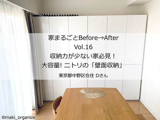 サイゾーウーマン暮らし住まい壁面収納の正解はニトリ! プロのアイデア実例で散らかったリビングが劇的スッキリ 暮らし [連載]女たちの「煩悩部屋」ビフォーアフター 壁面収納の正解はニトリ! プロのアイデア実例で散らかったリビングが劇的スッキリ 2023/08/15 17:00 伊藤まき(収納ライター) 「汚部屋」ビフォーアフター 連載企画『「汚部屋」ビフォーアフター』新シーズンがスタート! 第7回目の片付けモニターの応募に当選したのは、東京都中野区・3LDKのマンションに家族と暮らすDさん(40歳)です。 テーブルの横だから使い勝手抜群!(C)maki_organize 前回の続き、ニトリの「壁面収納・中身編」を紹介します。Dさんの家中に散らかっていた生活雑貨、小物、写真、道具のすべてを3つの大きなキャビネットに収納。テレビ周りや物置部屋にあったゴチャゴチャもすべて、まとまっています。 前回の記事はこちら 絶対に散らからないリビング収納はコレ! 片付けのプロが教える「壁面収納」のやり方連載企画『「汚部屋」ビフォーアフター』新シーズンがスタート! 第7回目の片付けモニターの応募に当選したのは、東京都中野区・3LDKのマンションに家族と暮らすDさん(40歳)...サイゾーウーマン2023.08.08 ニトリ商品番号(3132485)サイズ(W80×D42×H191cm)(C)maki_organize 数ある「壁面収納」の商品の中から選んだのは、ニトリ「キャビネット(ポルテ 80DD WH)」5万円(税込)です。食卓テーブル奥の壁面(W242×D43×H193cm)に、3つのキャビネット(W240×D42×H191cm)がぴったり配置できました。 モノが増えたら、棚板を増やすことも可能!(C)maki_organize 今回は、「ゾーン別(棚の空間ごとに)収納」を簡単に説明して、Dさん本人が片付けました。キャビネット1個につき7つの空間があるので、全部で21個のゾーン別収納ができます。 例えば、最上段は「使用頻度の低いモノ」を置くゾーンです。上から2番目は、家族の写真や宝物など飾るモノを(Aゾーン)。頻繁に出し入れするモノ(毎日使う文房具、郵便書類、アイロンやミシンなど)は、床から90cmほどの高さ(Bゾーン)といった感じです。 次より、それぞれのキャビネット内のポイントを解説していきます。 次のページ 【リビング収納】棚(1)の上段は開閉しやすいゴールデンゾーン 1234次のページ 関連記事 絶対に散らからないリビング収納はコレ! 片付けのプロが教える「壁面収納」のやり方リビングが劇的に片付く! プロが教える4つの「散らかる理由」&おすすめ収納グッズ「片付けない」おもちゃ収納術をプロが伝授! カラボと100均だけでオシャレにスッキリ【汚部屋】散らかった部屋の片付け手順10ステップ! 専門家が写真付きで詳しく解説【汚部屋片付け】大量カバンの収納術を専門家が写真で解説! 種類分けは「4つ」がポイント