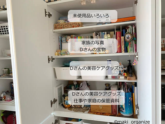 サイゾーウーマン暮らし住まい壁面収納の正解はニトリ! プロのアイデア実例で散らかったリビングが劇的スッキリ 暮らし [連載]女たちの「煩悩部屋」ビフォーアフター 壁面収納の正解はニトリ! プロのアイデア実例で散らかったリビングが劇的スッキリ 2023/08/15 17:00 伊藤まき(収納ライター) 「汚部屋」ビフォーアフター 【リビング収納】棚(2)上段はママさんの私物を仕舞う 保湿剤をすぐ使える位置に配置するなど◎(C)maki_organize 2番目、真ん中の棚の前には、食卓テーブルがあるので左側にある棚より出し入れがしにくい場所にあります。そのため、管理するママ(Dさん)の私物が望ましいです。毎晩の美容ケアなどを、手に取りやすく配置しました。 【リビング収納】棚の下段はざっくり余裕スペースに 扉の内側も収納に使えます◎(C)maki_organize この棚の下段には、何も入っていない「ざっくりボックス」を3つ用意しました。急な来客時でも、散らかったモノをサッと回収することができます。ぎゅうぎゅうに詰め込まず、棚1〜2段分、空いた空間(余裕)があると安心です。 ダイソーの箱が内寸幅(W75cm)にぴったり ダイソーの収納箱(商品番号:4549131985665)(C)maki_organize ニトリの棚なのでニトリの収納箱が適応しますが、予算を安く済ませるのであればダイソーの「フタ付収納ボックス」300円(税抜)でOK。棚の内寸(W75×D39cm)に対して(W25×D33.6cm)なので、ぴったり3つ入りました。 次のページ 【リビング収納】棚(3)上段は腰を曲げずに出し入れできる場所 前のページ1234次のページ 関連記事 絶対に散らからないリビング収納はコレ! 片付けのプロが教える「壁面収納」のやり方リビングが劇的に片付く! プロが教える4つの「散らかる理由」&おすすめ収納グッズ「片付けない」おもちゃ収納術をプロが伝授! カラボと100均だけでオシャレにスッキリ【汚部屋】散らかった部屋の片付け手順10ステップ! 専門家が写真付きで詳しく解説【汚部屋片付け】大量カバンの収納術を専門家が写真で解説! 種類分けは「4つ」がポイント