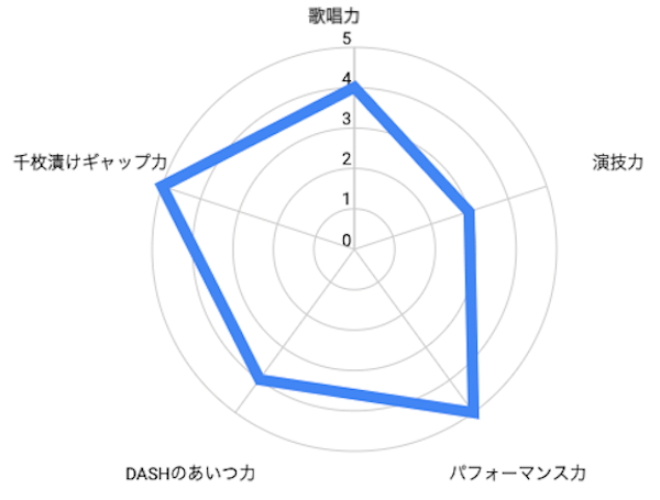グループのバンドパフォーマンスで担当するサックスも、中学時代に所属した吹奏楽部仕込みの確かな腕を持ち、歌唱力も高い。さらにデザインセンスも高く、コンサートグッズの制作を担当することもあるなど、多彩な魅力が強みだ。
