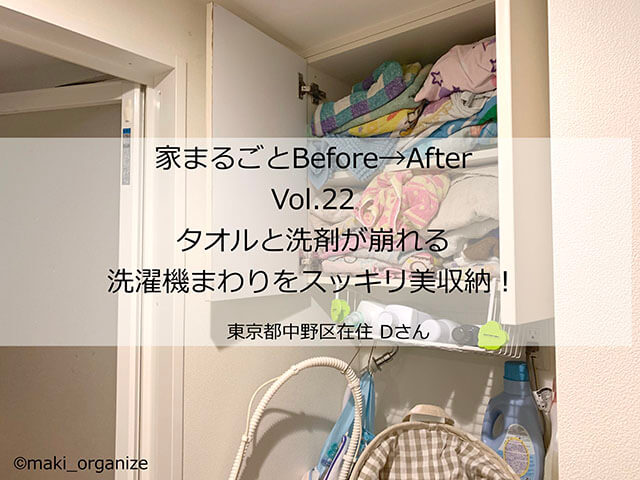 サイゾーウーマン暮らし住まい狭い洗濯機周りがスッキリ美収納に 暮らし [連載]女たちの「煩悩部屋」ビフォーアフター 「狭い」洗濯機周りの収納力が劇的アップ! プロが教える100均アイテム活用実例&ビフォーアフター 2023/09/26 17:00 伊藤まき(収納ライター) 「汚部屋」ビフォーアフター 連載企画『「汚部屋」ビフォーアフター』新シーズンがスタート! 第7回目の片付けモニターの応募に当選したのは、東京都中野区・3LDKのマンションに家族と暮らすDさん(40歳)です。 お悩み:洗剤ボトルやタオルが崩れて困ります(C)maki_organize Dさん宅の洗濯機周りの収納は、「上戸棚だけ」です。都心に多い狭めの洗面所ですが「無駄のないシンプルな洗面所」になるメリットも。収納が少ない場合は「使用頻度1軍のみ」に絞って入れ方を整えれば、収納力が劇的アップしますよ。 今回は、タオルと洗濯グッズを「崩れないように」「出しやすいように」配置します。まずは「全体のBefore」から確認しましょう。 洗濯機周りの収納全体の【Before】 タオルが崩れる、洗剤がこぼれるとお困り(C)maki_organize 収納スペースは、洗濯機上の「吊り戸棚」だけです。洗濯機は1日2〜3回使うということで、Dさんなりにかなり工夫しているそうですが、出すときにタオルや洗剤が倒れてしまいます。収納が限られている場合はまず、「隙間が使えるか」を確認します。 洗濯機サイド収納の【Before】 「隙間ラック9cm」と検索すれば必要サイズに出会える(C)maki_organize 洗濯機のサイドには、約12cm程度の隙間がありました。12cmもあれば、活用できる隙間収納グッズが多数ありますが、お風呂の残り湯用の給水ホースがあるので、今回は収納は諦めて「埃ブロック」だけを作ります。 次のページ 洗濯機サイド収納の【After】 1234次のページ 関連記事 片付け専門家が教える洗濯機まわり収納術! 「約5,000円」で可動棚をDIY100均「プラダン」で激変! 洗濯機、ホコリまみれの「防水パン」が3ステップで収納空間に使いにくい「洗濯機まわり」がスッキリ! 収納力アップには「○○の延長」とキャスター付きのアレ【洗面所収納】目的のモノを1回で出せる! 100均グッズ活用「引き出し仕切り術」をプロが伝授【洗面台下収納】100均グッズでごちゃごちゃがスッキリ! プロが選んだ収納ケース&ラックは?