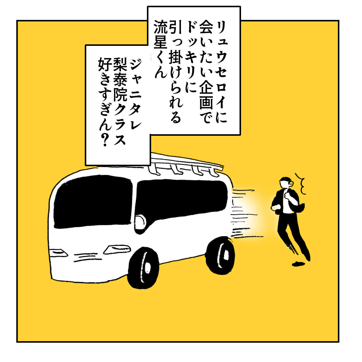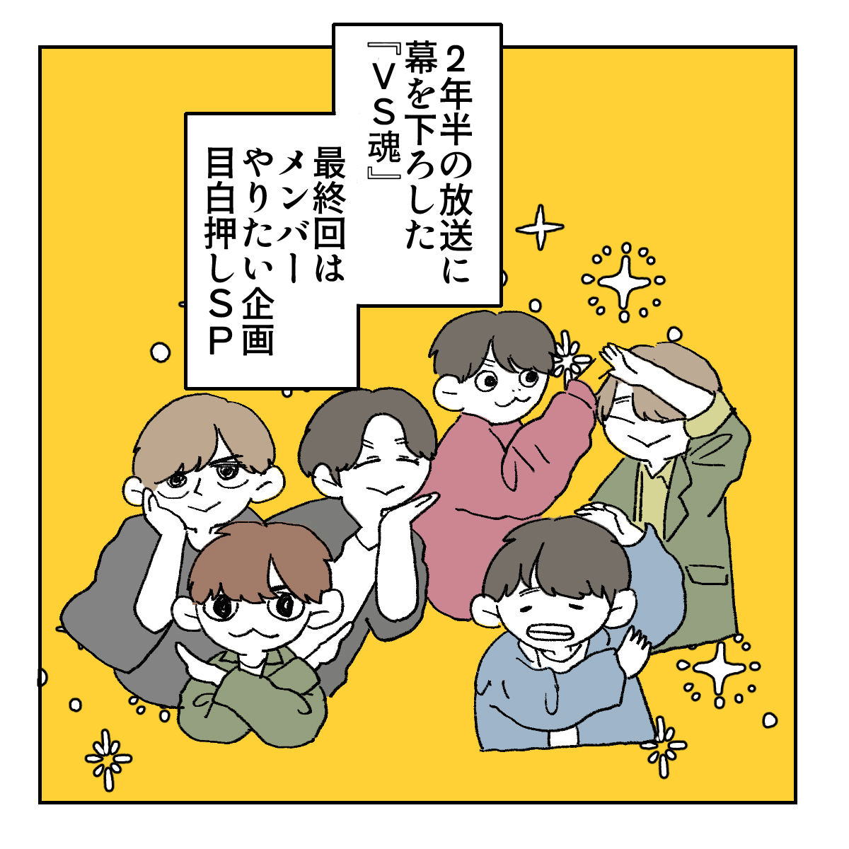 サイゾーウーマン男性アイドルSTARTO(旧ジャニーズ)元ジャニーズTOBENumber_i岸優太『VS魂』最終回名シーン 男性アイドル [ジャニオタ漫画家・竜田トキヒロの“推し事”見聞録]vol.26 【ジャニオタマンガ】相葉雅紀に容赦ない岸優太、風間俊介がCDデビュー! 『VS魂』最終回名シーン 2023/10/04 21:00 竜田トキヒロ(マンガ家) 相葉雅紀岸優太竜田トキヒロの“推し事”見聞録 ――Twitterで日々、ジャニーズタレントにまつわるイラストを投稿中のジャニオタ漫画家・竜田トキヒロが、現場レポートからドラマや映画、番組レビューまで、“推し事”の様子をお届け! 今回は、9月28日放送分で最終回を迎えたバラエティ番組『VS魂グラデーション』(フジテレビ系)の「VS魂ファイナル みんなで思い出作ろうSP」の模様をプレイバック! 同番組は、2020年12月をもって活動休止した嵐の冠番組『VS嵐』の後継番組として、21年1月に『VS魂』としてスタートしたのち、22年4月のリニューアルに伴い、『VS魂グラデーション』へと改題。嵐・相葉雅紀、風間俊介、ジャニーズWEST・藤井流星、Sexy Zone・佐藤勝利、岸優太、ジャニーズJr.・美 少年の浮所飛貴というグループの垣根を超えた“魂メンバー”が、毎週ゲストとさまざまなゲームでバトルしてきました。 最終回では、番組を支えてきたアンタッチャブル・山崎弘也、ずん・飯尾和樹と共に、6人のやりたいことを実現するロケを敢行。8人で東京ディズニーランドを訪れたり、小型船舶の免許を持つ浮所が操縦する船に乗って海釣りに出かけり、相葉のリクエストに応え、藤井が韓国ドラマ『梨泰院クラス』の主人公パク・セロイに扮するおなじみのキャラ、リュウ・セロイとして登場したり……などなど、メンバーは大はしゃぎ。 また、相葉がプロ野球・千葉ロッテマリーンズ対東北楽天ゴールデンイーグルスの試合で始球式を務めた際の裏側も公開されたほか、千葉の豪華プライベートヴィラで佐藤が手料理を振る舞ったり、9月29日に28歳の誕生日を迎えた岸を総額1000万円の桃のケーキでお祝いするシーンも。最後は番組恒例のババ抜き『BABA魂』で6人が対決するなど、本当に盛りだくさんの内容でした! そんな3時間スペシャルの名シーンを、イラストで振り返っていきます! 『VS魂グラデーション』最終回、岸優太が相葉雅紀に容赦なし? 次のページ 岸優太、1000万円のケーキで白目に 12次のページ 関連記事 【ジャニオタマンガ】山田涼介の美貌とコントが交互に! 賛否両論の映画『大怪獣のあとしまつ』レビュー【ジャニオタマンガ】井上瑞稀、矢花黎、西村拓哉の演技が光った、ドラマ『なれの果ての僕ら』レビュー【ジャニオタマンガ】映画『禁じられた遊び』、ヒロインは橋本環奈ではなくジャニーズWEST・重岡大毅だった【ジャニオタマンガ】中村嶺亜は「不動の皇帝」矢花黎は「軍師」! 7 MEN 侍ステマシート【ジャニオタマンガ】映画『Gメン』は“愛されキャラ”岸優太にピッタリ! 門松勝太にみんなメロメロ