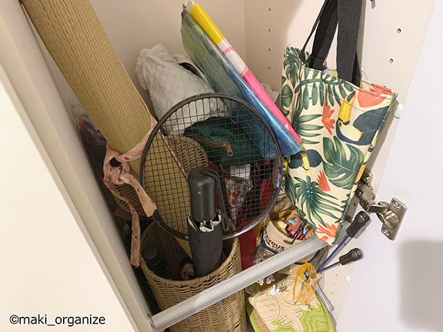 サイゾーウーマン暮らし住まい玄関の雨具収納方法を解説! 暮らし [連載]女たちの「煩悩部屋」ビフォーアフター 傘収納は100均の〇〇を活用! 狭い玄関でもサッと出し入れ可能な空間に 2023/10/10 17:00 伊藤まき(収納ライター) 「汚部屋」ビフォーアフター 傘の収納【手順1】空間に対して7割未満の量に直す 長年使っていないモノもどっさり(C)maki_organize 長い傘を取り出しても、「外で使うモノ」がギュウギュウに詰まっています。モノを詰め込むほど、奥の空間にカビが発生しやすくなります。空間に対して入れるモノの量は、通気性をキープできる「7割未満」を意識しましょう。 傘の収納【手順2】使うモノの数と状態を確認する 入っているモノの状態を確認し減らす(C)maki_organize クローゼットの中身をすべて出しました。傘のほか、ピクニックシート、学校用スリッパ、ラケット、凧上げなど「外で使うモノ」が沢山。玄関に置いておくと便利ですが、Dさん宅は空間が狭いので「よく使うモノ」だけを残します。 傘の収納【手順3】空間のサイズを測って掃除をする 化粧板の黒ずみはメラミンスポンジで落ちる(C)maki_organize カビはゼロでしたが砂の汚れが多かったので、掃除と換気を実施。掃除後は空間のサイズを測りました。 傘の収納【手順4】傘受けトレーを100均のゴミ箱に変更 JANコード(4965534333016)(C)maki_organize 備え付けの「傘受けトレー」を外して、セリアのゴミ箱「Recycled PLASTIC MATERIAL」100円(税抜)を活用。クローゼットの横幅が約W32cmなので、ゴミ箱(約W14×H24cm)が2つ入ります。トレーより深さがあるため、傘が安定します。 次のページ 傘の収納【手順5】突っ張り棒で「陳列の誘導」を作る 前のページ1234次のページ 関連記事 【下駄箱収納】100均グッズは「買ってはいけない」? 6つのNG例&収納力アップの手順を解説「狭い」洗濯機周りの収納力が劇的アップ! プロが教える100均アイテム活用実例&ビフォーアフターコスメ収納はダイソーの⚪︎⚪︎を活用すべし! 片付けのプロおすすめアイテムは?ゴミ屋敷になった実家を予算5万円で片付け! 粗大ゴミを処分する方法【10パターン】【洗面所の鏡裏】コレを増やすだけでスッキリ片付く! リバウンドなしの収納法をプロが解説