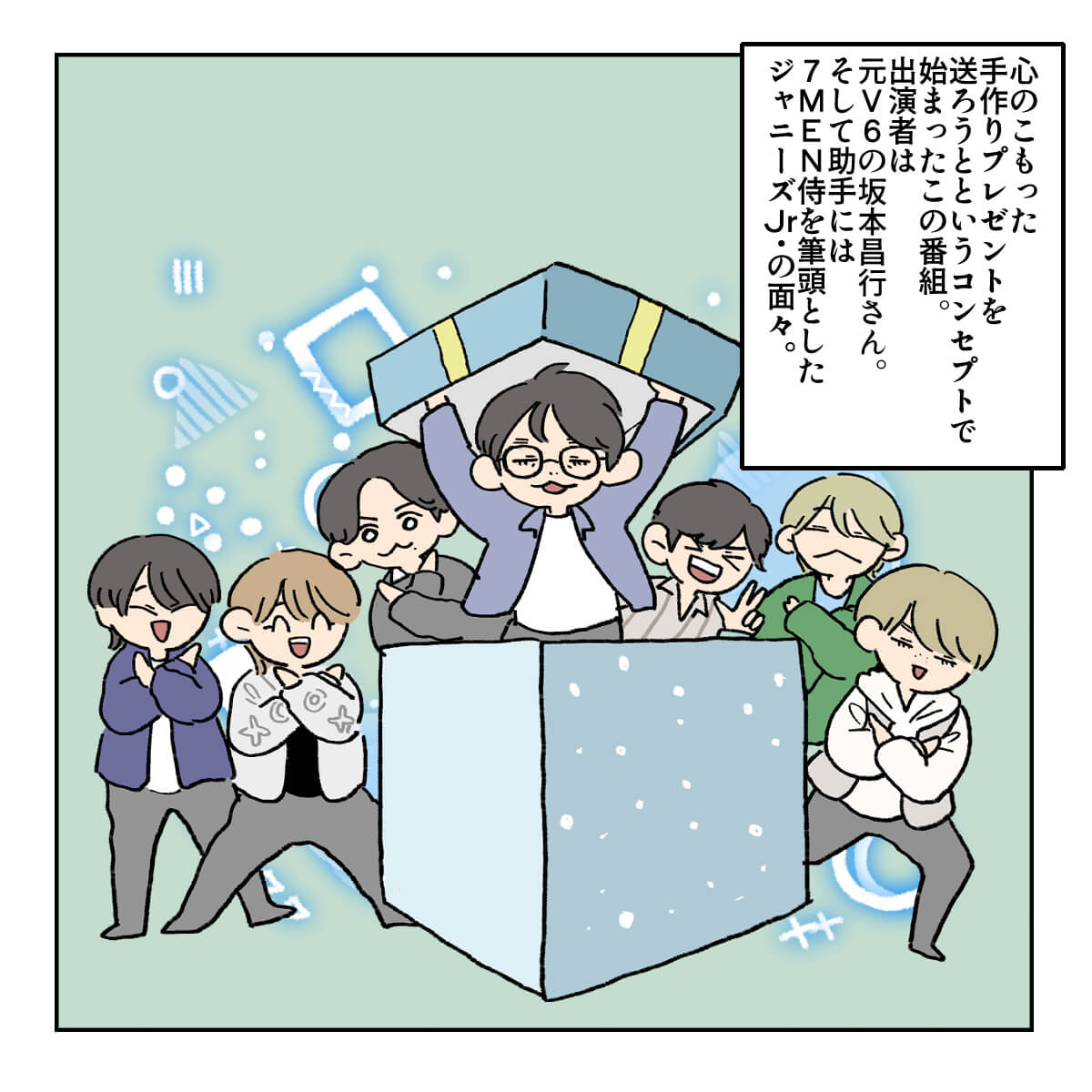 サイゾーウーマン男性アイドルSTARTO(旧ジャニーズ)ジュニア7 MEN 侍坂本昌行、7 MEN 侍の“パパ”に 男性アイドル [ジャニオタ漫画家・竜田トキヒロの“推し事”見聞録]vol.27 【ジャニオタマンガ】坂本昌行と7 MEN 侍がまるで“親鳥とヒヨコ”! 『GIFT for X』の見どころ 2023/10/11 21:00 竜田トキヒロ(マンガ家) 7 MEN 侍竜田トキヒロの“推し事”見聞録坂本昌行 ――Twitterで日々、ジャニーズタレントにまつわるイラストを投稿中のジャニオタ漫画家・竜田トキヒロが、現場レポートからドラマや映画、番組レビューまで、“推し事”の様子をお届け! 今回は、元V6で現在は20th Centuryとして活動中の坂本昌行の冠バラエティ番組『坂本昌行 GIFT for X』をピックアップ! ひかりTVが制作する同番組は、坂本が今ギフトをあげたいゲストのために、ジャニーズJr.の7 MEN 侍メンバーらと一緒にギフトを手作りするというコンセプトで、2021年11月9日から先行配信がスタート。テレビ東京系でも同28日から22年3月20日まで放送されました。 そして、今年4月18日より、映像配信サービス・Leminoで『SEASON 2』が配信中。坂本は引き続き、7 MEN 侍の中村嶺亜、菅田琳寧、本高(正しくははしごだか)克樹、佐々木大光、今野大輝、矢花黎の6名とアットホームな雰囲気の中で、プレゼント作りを行っており、キャスト同士の距離もグッと縮まった様子。 番組の収録を兼ねて、7 MEN 侍が7月23日~8月8日までTOKYO DOME CITY HALLにて開催した単独ライブを見学した坂本は、急きょステージに上がり、自身のソロ曲「Shelter」(04年2月4日発売のアルバム『Replay ~Best of 20th Century~』収録)を彼らとコラボしたこともあったとか。 ちなみに、『GIFT for X』は、Leminoの有料会員でないと視聴できないため、「番組の存在自体、知らなかった」という人もいることでしょう。そんな人に向けて、7 MEN 侍ファンの竜田トキヒロが、この番組の魅力を紹介していきます! 『GIFT for X』で坂本昌行が7 MEN 侍の“パパ”に! 次のページ 『GIFT for X』の7 MEN 侍が、まるで“親鳥を追いかけるヒヨコ” 123次のページ 関連記事 【ジャニオタマンガ】相葉雅紀に容赦ない岸優太、風間俊介がCDデビュー! 『VS魂』最終回名シーン【ジャニオタマンガ】山田涼介の美貌とコントが交互に! 賛否両論の映画『大怪獣のあとしまつ』レビュー【ジャニオタマンガ】井上瑞稀、矢花黎、西村拓哉の演技が光った、ドラマ『なれの果ての僕ら』レビュー【ジャニオタマンガ】映画『禁じられた遊び』、ヒロインは橋本環奈ではなくジャニーズWEST・重岡大毅だった【ジャニオタマンガ】中村嶺亜は「不動の皇帝」矢花黎は「軍師」! 7 MEN 侍ステマシート