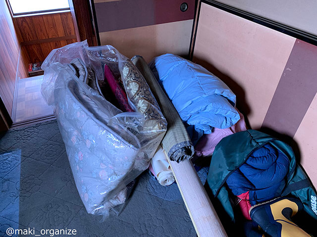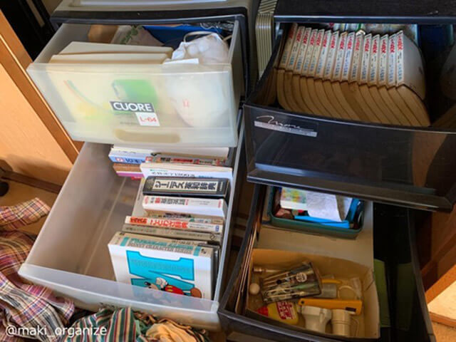 サイゾーウーマンコラム実家の納戸がゴミ屋敷化で愕然 コラム 編集部コラム 実家の納戸がゴミ屋敷化で愕然! リフォーム控え、数年ぶりに扉を開けた結果…… 2023/11/03 19:00 サイゾーウーマン編集部 編集部コラム サイゾーウーマン編集部員が週替わりで近況をつづっていく「編集部コラム」。半径1メートルの身近な話からジャニーズや芸能ニュースのネタまで縦横無尽に話題が飛び出します! 入り口から見た納戸(C)サイゾーウーマン こんばんは、編集Nです。この連休で実家に帰ってきました。今、実家には母と妹夫婦が生活しているんですが、近々部屋をリフォームすると言うんですね。春先に他界した祖母が使っていた部屋をきれいにして、母が使うことにすると。 で、その祖母の部屋。うちではほぼ魔窟扱いされていまして……。さらに、その隣にある納戸は開かずの間で、もう最後に扉を開けたのはいつだっけ? といった状態。それゆえ、今回のリフォームでついに納戸に手を入れるときがきた! と思われましたが、「あ〜、あそこはそのまま」(母)とのこと。 それで思い出したのは、サイゾーウーマンの連載陣、整理収納アドバイザー・伊藤まきさんがまとめてくださった「実家のゴミ屋敷を片付ける」シリーズの記事。 実家がゴミ屋敷化! 片付け・処分が大変だったモノベスト20&実際かかった費用と時間は? 汚家をまるごと片付けます! 連載企画「汚部屋 ビフォーアフター」今回のクライアントは、筆者(伊藤まき)の「実家」です。さながらゴミ屋敷だった実家ですが、紆余曲折を経て「生...サイゾーウーマン2022.11.22 実家がゴミ屋敷化、今すぐ片づけるべき? 5つのチェック&生前整理の流れを解説 汚家をまるごと片付けます! 連載企画「汚部屋 ビフォーアフター」今回のクライアントは、筆者(伊藤まき)の「実家」です。さながらゴミ屋敷だった実家ですが、紆余曲折を経て「生...サイゾーウーマン2022.11.29ゴミ屋敷になった実家、「予算5万円」で片付けできた! 【粗大ゴミの処分方法10】 汚家をまるごと片付けます! 連載企画「汚部屋 ビフォーアフター」。今回のクライアントは、筆者の「実家の片付け」です。紆余曲折を経て「生前処分」を実施してきました。...サイゾーウーマン2024.03.15 リフォームでは手が入らないにせよ、とりあえず納戸の現状を知るべく、今回数年ぶりに扉を開けてきたので公開させていただきます! 納戸の入り口。扉が半分しか開かない……(C)サイゾーウーマン そもそも扉が全部開かない(荷物が入り口まで積み重なってる)ことに愕然! そして目の前にタンスと衣類や布物の山々がズデーン。 食器棚から崩れ落ちてる桶(C)サイゾーウーマン 食器棚。食器は処分するのが大変だと、伊藤さんの記事にも書かれていました。 かわいいけど使わない(C)サイゾーウーマン かわいい食器類は今も使えるんですけど、場所をとるから不要なんですよね。 隠しメッセージがいろんなところに(C)サイゾーウーマン 「このタンスは奥にかくしがある ◯◯(祖母の名前)も知らなかった」――棚に貼られていた祖母からのメッセージ。隠しスペース、気になる……。 書籍もたくさんあると重くなる(C)サイゾーウーマン 『未年生まれは、超運の人』の著者、橋幸夫にびっくり。あの歌手の橋幸夫でしょうか? 『なぜ猫は可愛いのか』。これも非常に気になるタイトル。 ラベル収納はやっていた(C)サイゾーウーマン 祖母もラベリング収納をしていたようです。ハンカチとか布物は捨てる、ですね。 粗大ごみでしかない(C)サイゾーウーマン こうした掛け軸系もドサッとそこらに置いてあるんですよね。 掛け軸系?(C)サイゾーウーマン 価値がわからない美術品も処分に困ると記事にありました。大切で価値があるものは、それとわかるように置いておいてもらえると助かりますね。 これらのほか、マンガの全集とかレコードなども大量に発見。そう遠くない未来に、これらものをすべて処分しなければならないと思うと早くも徒労感に襲われます……。 最後に、伊藤さんの記事から「片付け・処分が大変だったモノベスト20」をまとめたものを紹介します。同じように実家で悩んでいる方、ともに頑張りましょう! ゴミ屋敷の片付け、処分が大変だったものベスト20 第1位:分別が必要な液体残量がある缶や瓶といった「液体の分別」が一番大変でした。一つひとつ中身を出して、缶に穴を開ける作業を繰り返します。自治体によっては、中身を水で洗浄するなど細かいルールがあるところも。このほか、果実酒、化粧品、調味料などの残った液体も処分しました。 第2位:解体と分別が必要な素材額縁に入れて飾ってある写真、賞状、絵画、免許、美術品などは、一つひとつ分解して、木・ガラス・紙に分別します。捨てがたい思い出は、写真に記録して処分すると◎。 第3位:30cm以上のプラスチック製品小さな衣装ケースも、30cmを超えれば「粗大ゴミ=有料」。柔らかいプラスチックケースなら、細かく切り刻んで小さくすれば可燃ゴ