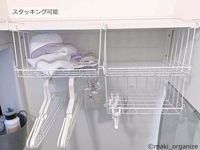 洗濯機まわりのデッドスペースに、投げ込み式のラックとして活用できます。ハンキングピンチやカードリングで、いろいろなモノをぶら下げることも。ほか、タオル、トイレットペーパー、ドライヤー、スニーカー、常温の野菜室などマルチに使い回せるアイテムです。