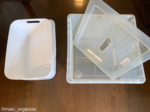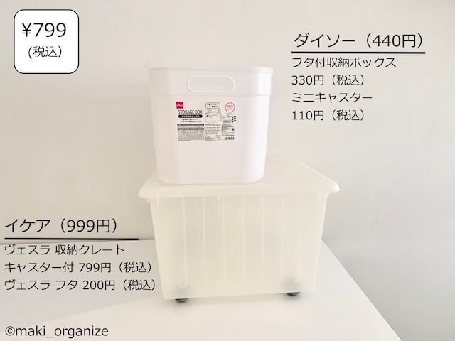 ダイソーの収納ボックスを同じ条件(フタ、キャスター付き)にしてサイズを比較してみました。大きめの衣類、おもちゃ、雑貨、日用品を収めるならIKEA「ヴェスラ」の容量が安心です。バッグやランドセルの定位置ボックスにも使えるサイズです。