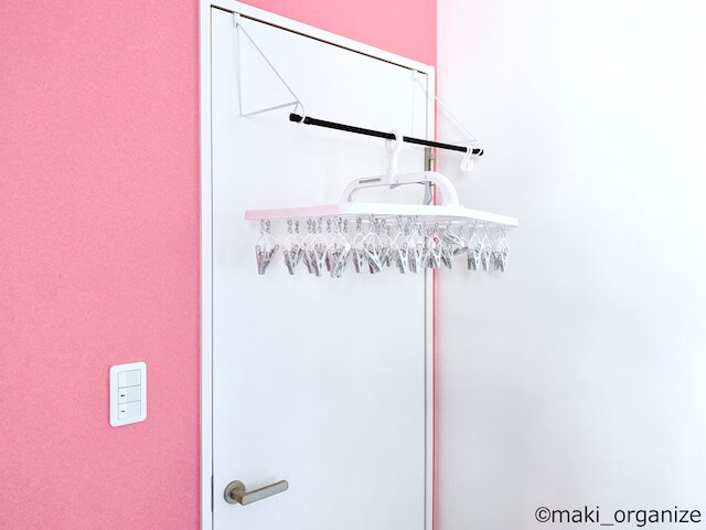 サイゾーウーマン暮らし100均・雑貨【ダイソー】110円「ドア裏」収納グッズ 暮らし 収納力アップの「ドア裏」活用テクニック 【ダイソー】110円、「ドア裏」収納グッズ! プロおすすめ3通りの使用例 2023/11/20 13:00 伊藤まき(収納ライター) 伊藤まきの「お片付けSOS」相談 (C)GettyImages 整理収納アドバイザー・伊藤まきさんがサイゾーウーマンで連載中の「『お片付けSOS』相談!」。今回は550円以下でできる「ドア裏」収納法を紹介します。収納が少なくて家が狭いとお悩みなら、ドアを利用した壁収納が便利。壁に穴を開けたくない! 大きな家具や箱を増やしたくない! 簡単に設置したい! というニーズも全て満たすアイテムを紹介していきます。 ※2022年9月12日公開の記事を再編集したものです。 ※写真に記載の金額は、22年9月時点のものです。最新価格は本文内に記載。 ※最新情報は公式サイトでご確認ください。 「ドアフックハンガー」110円(税込み) 洗濯ハンガーがドアにぶつからない(C)maki_organize 写真上のように、部屋のドアを使えば「予算をかけたくない」「壁に穴を開けたくない」といった問題も心配無用。しかも、洗濯物干しだけじゃない使い方ができるのも魅力です。 現在はダイソーで1Pから販売中(C)maki_organize 部屋のドアに使えるのは、THREEPPY「ドアフックハンガー」です。同じ商品が、3COINS(スリーコインズ)にもあります。ともに、店頭在庫に限りがあるように思うのでご注意を。 ※編注:23年11月現在、THREEPPYと3COINSでの販売を確認できません。現在はダイソーにて「ドアフックハンガー」(税込110円)を取り扱い中。 ドアフックハンガー使用例.1:簡単パイプハンガーに! 上着の部屋干し、洋服の一時置き場にも重宝!(C)maki_organize 厚み3〜3.5cmの部屋ドアに、「ドアフックハンガー」を設置して、100均の突っ張り棒を通すだけでパイプハンガーに! 洗濯ハンガーはもちろん、タオルも乾かすことができます。部屋干しで場所が足りない時も、簡単着脱で増やすことができます。 ドアフックハンガー使用例.2:1本でも衣類掛けに! ドアを保護する、フェルトシールを貼っています(C)maki_organize 1個ずつ単品で使う手もあり! ほかのドアフックよりたくさん衣類を掛けることができます。これもまた、1個で使うと不安定なので保護パッドが必要です。 ドアフックハンガー使用例.3:木材を使えば、オシャレなインテリアバーに! 写真上は、流木を使ったイメージです(C)maki_organize ちょっとこだわって「木材の丸棒」を使うのもおすすめ。季節のオーナメントや、エアプランツ、モビールなどを飾って楽しむことができます。ちょっと雰囲気があれば、出しっぱなしでも気になりません。ただし、開ける方向は危ないので滅多に使わないドアで様子を見ながら確認ください。 壁収納に便利な「ドアフックハンガー」ですが、そのまま使うのは注意。建具を傷めないために、次のアイテムを用意しましょう。 [ポイント]フックの内側に、保護パットを用意しましょう ぐらつきの調整にも役立つ(C)maki_organize 「ドアフックハンガー」は、鉄製なのでそのままドアに使うと傷つけてしまいます。100均で買える「クッションシール」と「フェルト製の保護パッド」をドアに触れる面に付けます。 [ポイント]壁にぶつかる部分の保護も忘れずに! 壁紙のスリ傷が付かないように!(C)maki_organize ドア開閉時に突っ張り棒が壁にぶつかるので、壁紙と触れる部分の保護が必要です。さらに、壁紙に「保護パッド」を直接貼ると壁紙が剥がれる恐れがあるので「マスキングテープ」を下地に付けると安心。 ダイソー収納アイデア&アイテム人気記事10(※画像クリックで記事に飛びます) ダイソー「蓋付き収納 BOX」商品番号:4549131634921ダイソーの「蓋付き収納 BOX」。大型クローゼットや押入れがない家でも機能的に収納ができる、便利なアイテムです。ジッパー付きの軽量サイズ(182g/ライター調べ)だから、高い場所に置いても片手で降ろせます。価格は330円(税込)ですが、無印良品の「ポリエステル綿麻混・ソフトボックス」(1,490円/同)の5分の1。 ダイソー「強力吸盤フック」「ミニ突っ張り棒」ダイソーの「強力吸盤フック」耐荷5kg(2P)と耐荷2kg(4P)、そしてミニ突っ張り棒(2P)。この2グッズがあるだけで、家中の困ったコトにかなり役立ちます。この強力吸盤フックは、ツルツルした面(タイル、ガラス、琺瑯など)に適しているので、トイレに使うのも便利。生理用品を入れたポーチや、流せるトイレブラシを吊り下げます。ミニ突っ張り棒は、床下から20〜30cmの場所がベスト。 ダイソー「ホッピングバッグ」商品番号:4549131306484ダイソーの「ホッピングバッグ」なら、使わない時は畳めて「かさばらない」ので、狭い空間を奪いません。イレギュラーなモノが増えた時も、サッと広げるだけで便利な収納ボックスへと変わります。ブランケットや羽織の収納ボックスとして。 あちこちに脱ぎ散らかした衣類も、簡単に回収できます。キッチンペーパーやトイレットペーパー