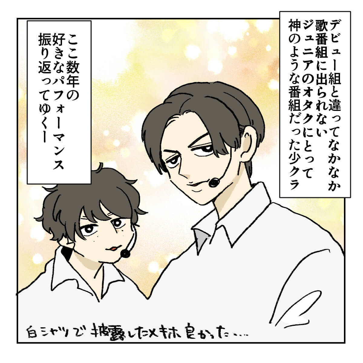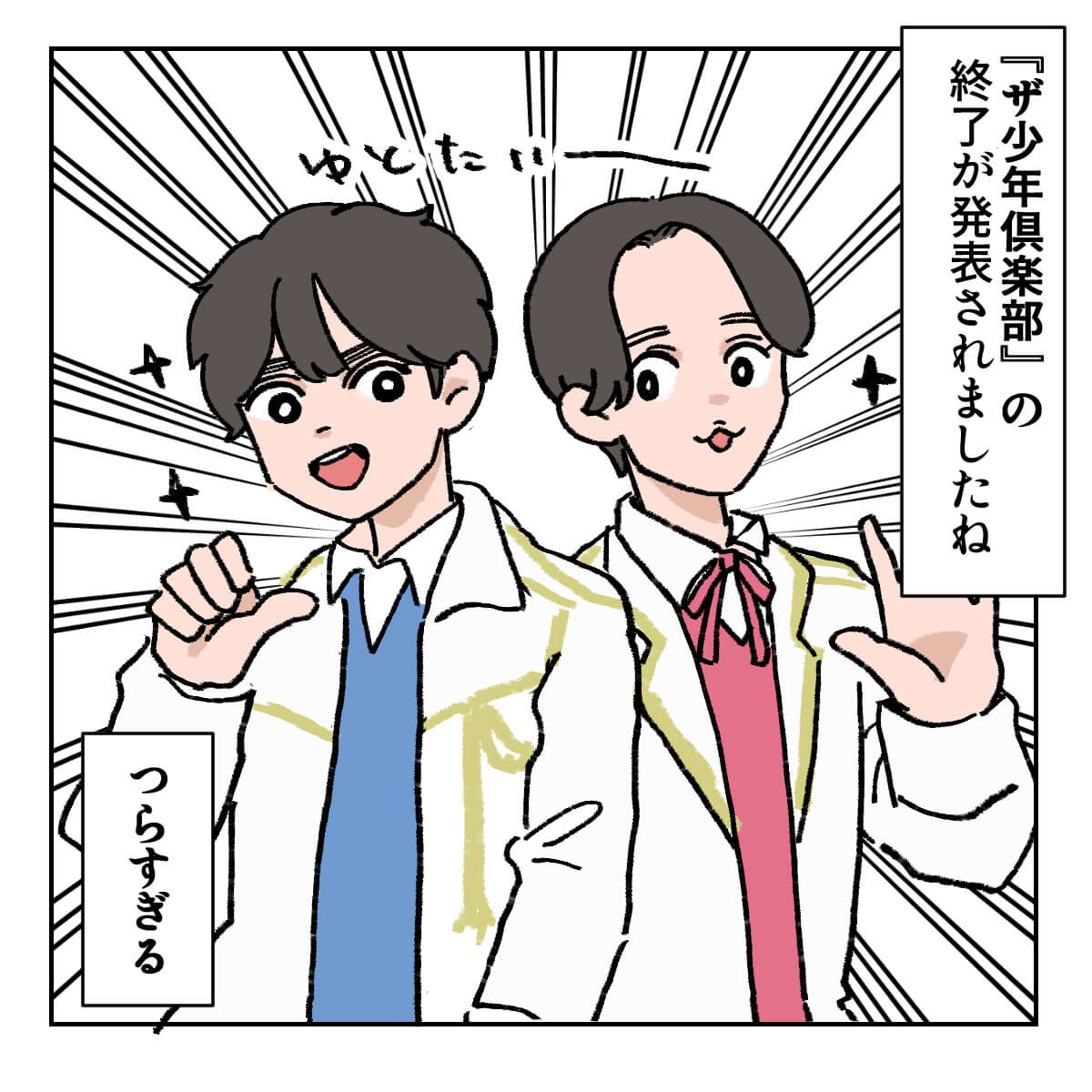 サイゾーウーマン男性アイドルSTARTO(旧ジャニーズ)King&Prince永瀬廉『ザ少年倶楽部』ベストパフォーマンス5選 男性アイドル [ジャニオタ漫画家・竜田トキヒロの“推し事”見聞録]vol.32 【ジャニオタマンガ】神番組だった『ザ少年倶楽部』ベストパフォーマンスをプレイバック 2023/11/22 21:30 竜田トキヒロ(マンガ家) 竜田トキヒロの“推し事”見聞録永瀬廉King&Prince ――Twitterで日々、ジャニーズタレントにまつわるイラストを投稿中のジャニオタ漫画家・竜田トキヒロが、現場レポートからドラマや映画、番組レビューまで、“推し事”の様子をお届け! 今回は、若手のデビュー組やジュニアがNHKホールで番組独自のステージショーを繰り広げる音楽バラエティ『ザ少年倶楽部』(NHK BS)の思い出をプレイバック! 1993年10月に『アイドルオンステージ』というタイトルでスタートし、97年4月に『ミュージック・ジャンプ』へと名前を変え、2000年4月より『ザ少年倶楽部』として長きにわたりファンに愛されてきた同番組。 露出の少ないデビュー前のジュニアがパフォーマンスやトークをする貴重な場であり、登竜門的存在の番組として親しまれてきましたが、SMILE-UP.(旧ジャニーズ事務所)創業者・ジャニー喜多川氏(19年に死去)の性加害問題の影響で、11月以降の放送が見送りに。 そして今月15日には、NHKが番組名を『ニュージェネ!』にリニューアルし、「未来のスターを夢見る次世代(ニュー・ジェネレーション)の男女のアイドルやアーティスト、パフォーマーが集結し、その魅力を紹介する番組」(番組公式サイトより)に内容を変更すると発表。放送時期や出演者の詳細は明かされていないものの、この大きな方向転換に、ネット上ではジャニーズファンから不満が噴出しました。 今回は、そんな『ザ少年倶楽部』の近年のベストパフォーマンスを、イラストで振り返っていきます。 『ザ・少年倶楽部』は、ジュニアのオタクにとっての「神番組」! 次のページ ジャニオタ漫画家が選ぶ『少クラ』ベストパフォーマンス5選! 12次のページ 関連記事 【ジャニオタマンガ】映画『法廷遊戯』で気づいた、キンプリ・永瀬廉の“声”の良さ【ジャニオタマンガ】嵐・相葉雅紀主演『今日からヒットマン』、既視感の正体は魔法少女アニメ!?【ジャニオタマンガ】ドラマ『マイハル』、なにわ男子・道枝駿佑の顔面だけで見る価値アリ!?【ジャニオタマンガ】ふぉ~ゆ~の“ギャップ”にメロメロ! ライブ『HAPPY 4U.HOUR』レポ【ジャニオタマンガ】坂本昌行と7 MEN 侍がまるで“親鳥とヒヨコ”! 『GIFT for X』の見どころ
