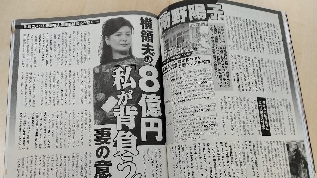 サイゾーウーマンコラム神林広恵「女性週刊誌ぶった斬り」南野陽子、“凄腕の詐欺師”夫となぜ今まで離婚しなかったのか? ようやく決断した納得できる「理由」 コラム “噂の女”神林広恵の女性週刊誌ぶった斬り!【第676回】 南野陽子、“凄腕の詐欺師”夫となぜ今まで離婚しなかったのか? ようやく決断した納得できる「理由」 2023/11/29 12:30 神林広恵(ライター) 女性週刊誌ぶった斬り! 「女性自身」12月12日号 下世話、醜聞、スキャンダル――。長く女性の“欲望”に応えてきた女性週刊誌を、伝説のスキャンダル雑誌「噂の真相」の元デスク神林広恵が、ぶった斬る! 作家の伊集院静氏が逝去した。73歳。若い。その直前、「週刊文春」(文藝春秋)で長年続いた人生相談コラムが終了し、ジャニーズ問題では東山紀之を絶賛しひんしゅくを買ったが、その裏で深刻な病と闘っていたとは。筆者も「噂の真相」時代、伊集院氏に関する記事を書いたことを思い出す。数奇な人生を歩んだ伊集院氏に合掌したい。 今週の女性週刊誌ランキング:第676回(11/23〜11/28発売号より) 1位「南野陽子 横領夫の8億円『私が背負う!』妻の意地」(「女性自身」12月12日号) 2位「スクープ撮 木村一八 倉科カナ似美女とお泊まりデート&来年1月結婚へ!」(「週刊女性」12月12日号) 3位「羽生結弦 懊悩 元妻と母『凍った関係』」(「女性自身」12月12日号) ※「女性セブン」は合併号休み 11月27日、南野陽子が離婚を発表し、大きな話題になっている。もちろん“夫の逮捕”という衝撃的な出来事が原因だ。いや、実は衝撃的でもなんでもない。南野の夫・金田充史容疑者は2011年に南野と結婚した直後から、何度も金銭トラブルや女性スキャンダルを報じられてきた人物だったから。今週の「女性自身」では、南野前夫のそうした過去を振り返っているのだが、あらためて見るとすごい(いろんな意味で)。 今回逮捕された容疑は、福祉法人の口座から自身と共犯者の関係会社の口座に1,500万円を送金した業務上横領容疑で、被害額が数千万円に上るといわれる。が、ほかもそれ以上の高額なトラブルばかり。結婚から1カ月に発覚したのは、4億8,000万円を医療関係会社社長から騙し取ったというトラブル。 さらに18年には、赤坂のクリニックから9,000万円以上の使途不明金があると刑事告発され、その翌年には、銀座のクリニックでの1億8,000万円の使途不明金が。さらに今年8月には、学校法人の理事長が理事だった金田氏に4,200万円の借金を負わされたと告発するトラブルも起きていたという。そして今回の逮捕――。 これまでなぜ逮捕されなかったのか不思議なくらいで、これら金銭トラブルをどう解決したのかも、報道がないので不明だが、凄腕の詐欺師といっていい“実績”の数々だ。「自身」では取り上げていないが、ほかにも家賃滞納トラブルや、従業員に対する暴力事件、銀座クラブママとの“隠し子騒動”もあった。そして、その出産費用も“滞納”している、とも。 こうしたトラブルが報じられるたび、マスコミはこんな疑問を呈してきた。“なぜ南野は離婚しないのか”と。その疑問は当然だろう。今回「自身」では、その謎について南野の実父の存在が大きかったと指摘している。実母亡き後、東京に父を引き取った南野だが、糖尿病を患い車椅子生活となった父、そして仕事と介護で苦しんだ南野を支えてきたのが前夫だった、と。 確かにそうなのだろう。そして前夫の金銭トラブル歴や南野の夫擁護以上に、今回の「自身」記事もまたすごいのだ。というのも、この記事は南野が離婚を発表する前に書かれたもの。よって離婚を「自身」は知らない。にもかかわらず、記事には“これまで離婚しなかった南野が今回決断したであろう理由”が随所に散らばっているのだ。 以下「自身」の記述を見てほしい。 「実父は昨年5月、85歳で亡くなった」 「金田容疑者は南野さんの舞台にいろんな人を連れてきては楽屋で南野さんを紹介していたそうです。彼の“手口”なのでしょう」(ともに南野の知人のコメント) 「今年から金田容疑者は南野さんの個人事務所のマネージャーとして働いていました」 「金田容疑者の逮捕により、来年はコンプライアンスを重んじるテレビ局からのオファーは厳しいです。彼女の仕事に大きな支障が出てくるんです」(ともにテレビ局関係者のコメント) ね、すべて離婚の理由となるでしょ。恩義を感じていた父の存在もなくなってしまった。そんな中での夫の逮捕で、このまま婚姻関係を続ければ、南野自身も夫の広告塔、共犯関係などと批判される可能性も高い。さらに逮捕当時は夫をマネジャーにしていたという南野。自身にも損害賠償の可能性もある。さらに、これまでは夫をかばってきたが、コンプライアンスが厳しくなっている現在の芸能界にあって、今回ばかりは自分の仕事に大きな影響があることは必至――。 「自身」の指摘は結果的に、南野の離婚の原因としては納得することばかりだった。 「週刊女