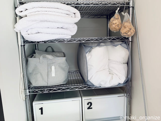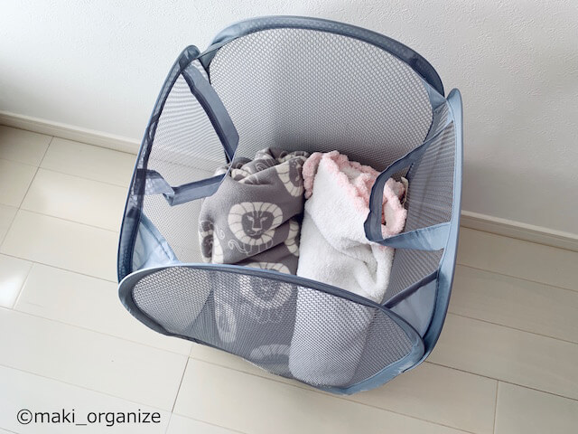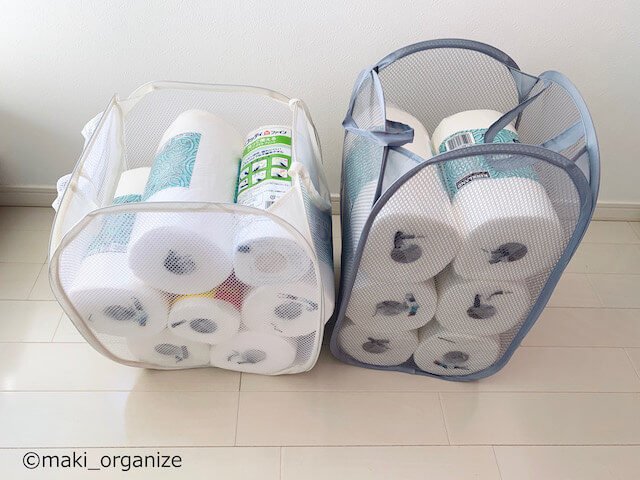 サイゾーウーマン暮らし100均・雑貨【ダイソー】110円「ホッピングバッグ」 暮らし 【ダイソー】収納アイデア 【ダイソー】110円「ホッピングバッグ」、冬のあったかグッズ収納に◎! プロの活用実例4 2023/12/01 13:00 伊藤まき(収納ライター) 伊藤まきの「お片付けSOS」相談 (C)GettyImages 整理収納アドバイザー・伊藤まきさんがサイゾーウーマンで連載中の「『お片付けSOS』相談!」。今回はダイソーのおすすめ商品「ホッピングバッグ」を再掲します。プロの収納実例は? ※2020年10月1日の記事を再編集したものです。 ※最新情報は公式サイトでご確認ください。 ダイソー「ホッピングバッグ」110円(税込み) セリアでも販売中(C)maki_organize ダイソーの「ホッピングバッグ」です。重たい硬質タイプの収納ボックスより「軽くて便利」なうえ、110円なので、使わなくなった時に手放しやすい価格。もののストック量が増えた家にも◎です。「ホッピングバッグ」は、四隅に針金が仕込んであるので「自立できない不安定なモノ」をしっかり支えてくれます。 セリア(白)は、ワンタッチでポップアップできます(C)maki_organize 硬い収納ボックスは、中身を見直して量を減らしても、“空気”を入れたままです。ダイソーの「ホッピングバッグ」なら、使わない時は畳めて「かさばらない」ので、狭い空間を奪いません。イレギュラーなモノが増えた時も、サッと広げるだけで便利な収納ボックスへと変わります。色は黒 、白 、グレーの3色です。 ダイソー「ホッピングバッグ」使用実例1:ブランケットや羽織の収納ボックス 引っ掛かって糸がほつれる心配もなし(C)maki_organize 急な寒さに慌てて出した、ブランケットや羽織の収納ボックスとして。冬のあったかグッズも、置く場所を決めれば散らからずに済みます。家族みんなが、あちこちに脱ぎ散らかした衣類も、簡単に回収できます。 ちなみに、仕様書には「持ち運び」の使用はNGとあるので自己判断でお願いします。 ダイソー「ホッピングバッグ」使用実例2:キッチンペーパーなど在庫入れ 容量はセリア。安定感はダイソー(個人的な感想)(C)maki_organize キッチンペーパーやトイレットペーパーなど、収納棚に入りきれなかったストック品もまとまります。ペットシーツやおむつの在庫入れなど、紙モノに最適。ほかにも、子どもの工作グッズ、外遊びグッズ、分別ゴミ、フリマの梱包グッズがまとまります。 ダイソー「ホッピングバッグ」使用実例3:おもちゃ収納 吊り下げNGですが、耐荷重が割と頑丈です(C)maki_organize おもちゃ収納にも◎。ペットの「いたずら対策」にもなります。触って欲しくないモノを、上に吊るして置くだけ。とはいえ、ダイソーの「ホッピングバッグ」の使用説明には、重たいもの、詰め込み、吊り下げ、持ち運びに使わないでくださいとあるので自己判断でお願いします。 ダイソー「ホッピングバッグ」使用実例4:冬用布団の収納 布団収納にも(C)maki_organize 筆者宅では、冬用布団のスタンバイにも活用しています。布モノ、紙モノ、一時的なモノの収納に軽くて便利な「ホッピングバッグ」が万能です。 収納のプロが絶賛愛用中! ワッツ110円「メッシュバスケット」は名品です!整理収納アドバイザーの伊藤まきが、片付けに訪問した現場で「よくやる作業」「よく伝えるおすすめ収納法」を紹介していきます! ワッツ「メッシュバスケット」 プロの技シリー...サイゾーウーマン2022.08.01 ダイソー収納アイデア&アイテム人気記事10(※画像クリックで記事に飛びます) ダイソー「蓋付き収納 BOX」商品番号:4549131634921ダイソーの「蓋付き収納 BOX」。大型クローゼットや押入れがない家でも機能的に収納ができる、便利なアイテムです。ジッパー付きの軽量サイズ(182g/ライター調べ)だから、高い場所に置いても片手で降ろせます。価格は330円(税込)ですが、無印良品の「ポリエステル綿麻混・ソフトボックス」(1,490円/同)の5分の1。 ダイソー「強力吸盤フック」「ミニ突っ張り棒」ダイソーの「強力吸盤フック」耐荷5kg(2P)と耐荷2kg(4P)、そしてミニ突っ張り棒(2P)。この2グッズがあるだけで、家中の困ったコトにかなり役立ちます。この強力吸盤フックは、ツルツルした面(タイル、ガラス、琺瑯など)に適しているので、トイレに使うのも便利。生理用品を入れたポーチや、流せるトイレブラシを吊り下げます。ミニ突っ張り棒は、床下から20〜30cmの場所がベスト。 ダイソー「ホッピングバッグ」商品番号:4549131306484ダイソーの「ホッピングバッグ」なら、使わない時は畳めて「かさばらない」ので、狭い空間を奪いません。イレギュラーなモノが増えた時も、サッと広げるだけで便利な収納ボックスへと変わります。ブランケットや羽織の収納ボックスとして。 あちこちに脱ぎ散らかした衣類も、簡単に回収できます。キッチンペーパーやトイレットペーパーなど、収納棚に入りきれなかったストック品もまとまります。ペットシーツやおむつの在庫入れなど、紙モノに最適 ダイソー