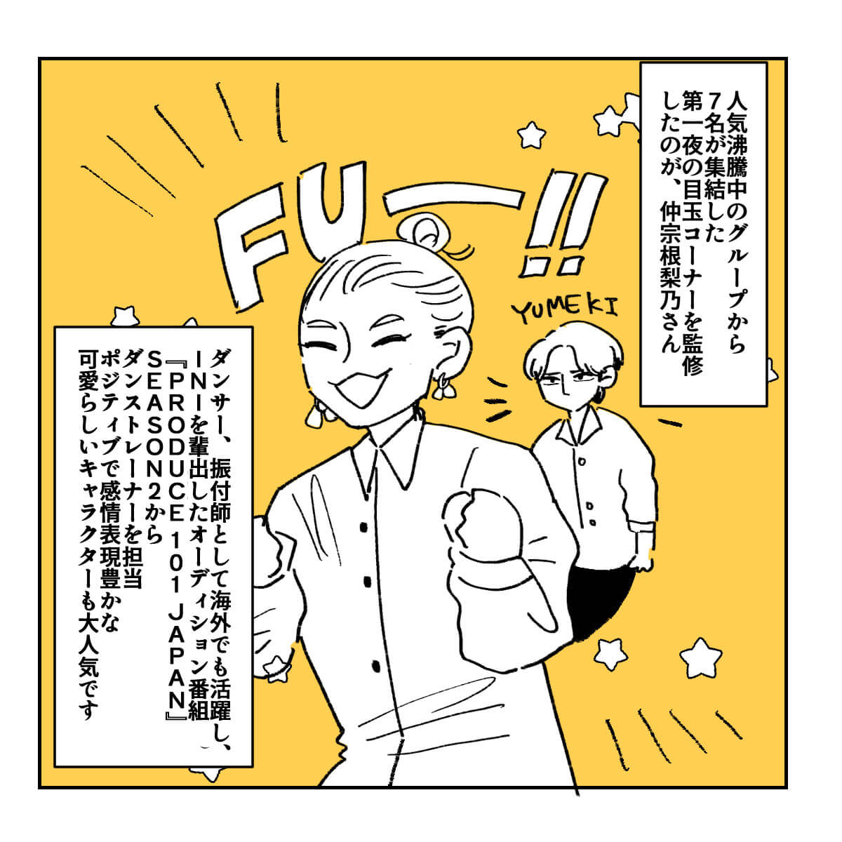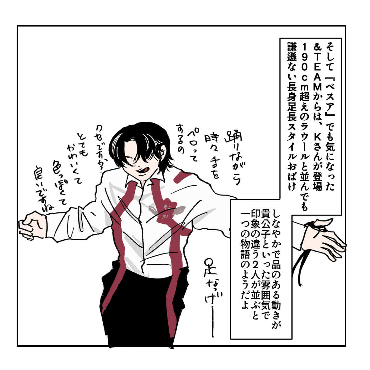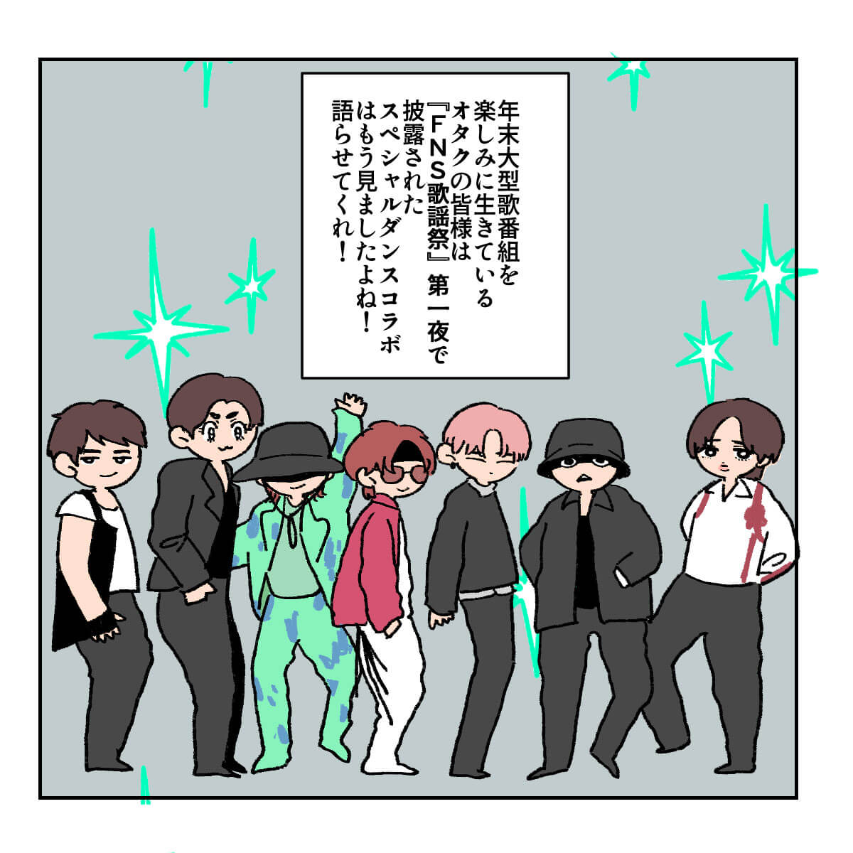 サイゾーウーマン男性アイドルBE:FIRST『FNS歌謡祭』ダンスコラボ7名の魅力 男性アイドル [ジャニオタ漫画家・竜田トキヒロの“推し事”見聞録]vol.35 BE:FIRST・SOTA、Snow Manラウールら『FNS歌謡祭』ダンスコラボ7名の魅力とは? 2023/12/13 21:53 竜田トキヒロ(マンガ家) Snow ManBE:FIRST竜田トキヒロの“推し事”見聞録 ――Twitterで日々、ジャニーズタレントにまつわるイラストを投稿中のジャニオタ漫画家・竜田トキヒロが、現場レポートからドラマや映画、番組レビューまで、“推し事”の様子をお届け! 今回は、12月6日に生放送された音楽特番『FNS歌謡祭』第1夜(フジテレビ系)をプレイバック! 嵐・相葉雅紀と永島優美アナウンサーが総合司会を務め、2週連続で約4時間半にわたり放送される同番組。16日放送の第1夜では、総勢52組の豪華アーティストが、さまざまなヒットソングを披露しました。 その中で、目玉コーナーとして行われたのが、「仲宗根梨乃監修 ダンス企画」。世界的ダンサー兼振付師の仲宗根氏監修のもと、 EXILE NAOTO(EXILE、 三代目 J SOUL BROTHERS from EXILE TRIBE)、KENZO(DA PUMP)、中務裕太(GENERATIONS from EXILE TRIBE、以下「GENERATIONS」)、ラウール(Snow Man)、川尻蓮(JO1)、SOTA(BE:FIRST)、K(&TEAM)7名が、所属事務所やグループの垣根を越えて、ダンスでコラボレーションした。 「繋がる」をコンセプトに、東京ゲゲゲイの「G120&醜いシンデレラ -FNS Remix-」に合わせ、ソロパートでは個性豊かな表現でそれぞれの持ち味を発揮し、最後は7人で息の合った圧巻のパフォーマンスで視聴者を魅了。X(旧Twitter)上では、「ダンスコラボ」など関連ワードがトレンド入りを果たすなど、大反響を呼びました。 今回は、そんな同企画に参加した7名それぞれの印象や魅力を、イラストで振り返っていきます! 『FNS歌謡祭』ダンスコラボ、ラウール&Kコンビが“スタイルおばけ” 次のページ 『FNS歌謡祭』GENERATIONS・中務裕太の肉体美がすごい! JO1・川尻蓮は猫のよう? 123次のページ 関連記事 Snow Manから&TEAM、JO1まで……『ベストアーティスト』名場面をプレイバック!KAT-TUN・亀梨和也のYouTube、“後輩”Snow Man・目黒蓮がかわいすぎ!?【ジャニオタマンガ】神番組だった『ザ少年倶楽部』ベストパフォーマンスをプレイバック【ジャニオタマンガ】映画『法廷遊戯』で気づいた、キンプリ・永瀬廉の“声”の良さ【ジャニオタマンガ】嵐・相葉雅紀主演『今日からヒットマン』、既視感の正体は魔法少女アニメ!?