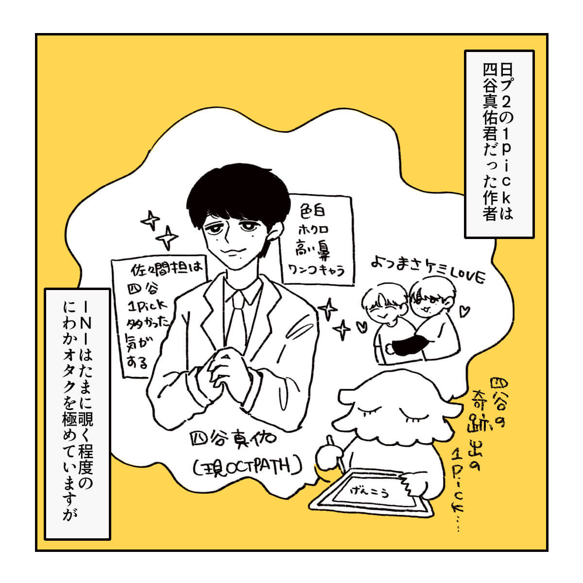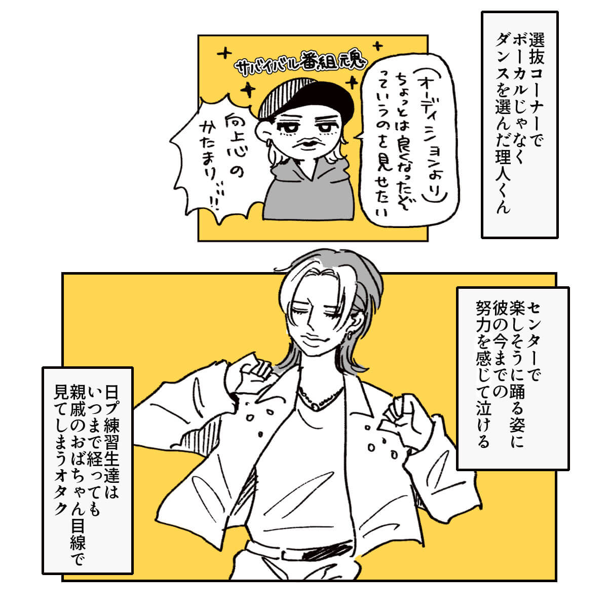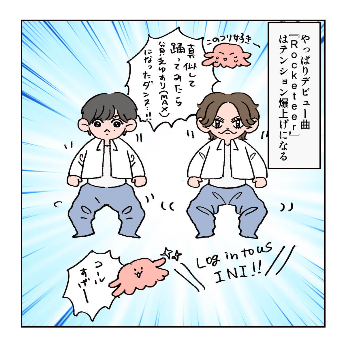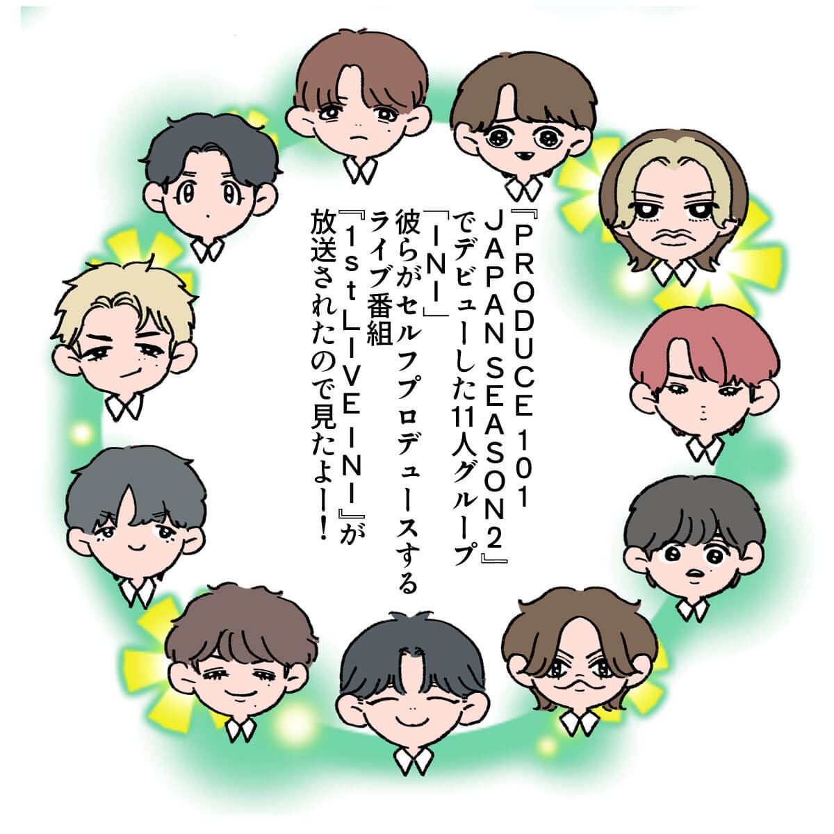 サイゾーウーマン男性アイドルINIINIのパフォーマンスは新鮮! STARTOアーティストとの違いとは? 男性アイドル [ドルオタ漫画家・竜田トキヒロの“推し事”見聞録]vol.36 INIのパフォーマンスは新鮮! STARTOアーティストとの違いとは? 2023/12/20 22:00 竜田トキヒロ(マンガ家) INI竜田トキヒロの“推し事”見聞録 ――Twitterで日々、ジャニーズタレントにまつわるイラストを投稿中のジャニオタ漫画家・竜田トキヒロが、現場レポートからドラマや映画、番組レビューまで、“推し事”の様子をお届け! 今回は、12月9、15日に放送された、グルーバルボーイズグループ・INIの地上波冠番組『1st LIVE INI』(テレビ朝日系)をプレイバック! 2021年4~6月に動画配信サービス・GYAO!とTBS系で配信・放送された、韓国発のサバイバルオーディション番組『PRODUCE 101』の日本版『PRODUCE 101 JAPAN SEASON2』から誕生したINI。 熾烈なオーディションを勝ち抜いた池崎理人、尾崎匠海、木村柾哉、後藤威尊、佐野雄大、許豊凡、高塚大夢、田島将吾、西洸人、藤牧京介、松田迅の11人で構成され、同年11月にデビューシングル「A」をリリースしました。 『1st LIVE INI』では、そんな彼らが初のセルフプロデュースライブを開催し、デビュー曲「Rocketeer」や最新シングル「TAG ME」収録曲を歌唱。 また、番組側から出された要望に応え、池崎、後藤、田島、西、松田の5人がここでしか見られないダンスパフォーマンスを披露し、尾崎、木村、佐野、許、高塚、藤牧はback numberの名曲「クリスマスソング」(15年)をカバー。 さらに、ファン投票で選ばれた「ライブでしか見ることが出来ない“INI 私の神曲”」ベスト3も発表されるなど、スペシャルなステージとなりました。 今回は、番組で印象的だったシーンを、イラストで振り返っていきます! 次のページ INI・木村柾哉の誠実さあふれる“キリングパート”に感動 123次のページ 関連記事 BE:FIRST・SOTA、Snow Manラウールら『FNS歌謡祭』ダンスコラボ7名の魅力とは?Snow Manから&TEAM、JO1まで……『ベストアーティスト』名場面をプレイバック!KAT-TUN・亀梨和也のYouTube、“後輩”Snow Man・目黒蓮がかわいすぎ!?【ジャニオタマンガ】神番組だった『ザ少年倶楽部』ベストパフォーマンスをプレイバック【ジャニオタマンガ】映画『法廷遊戯』で気づいた、キンプリ・永瀬廉の“声”の良さ