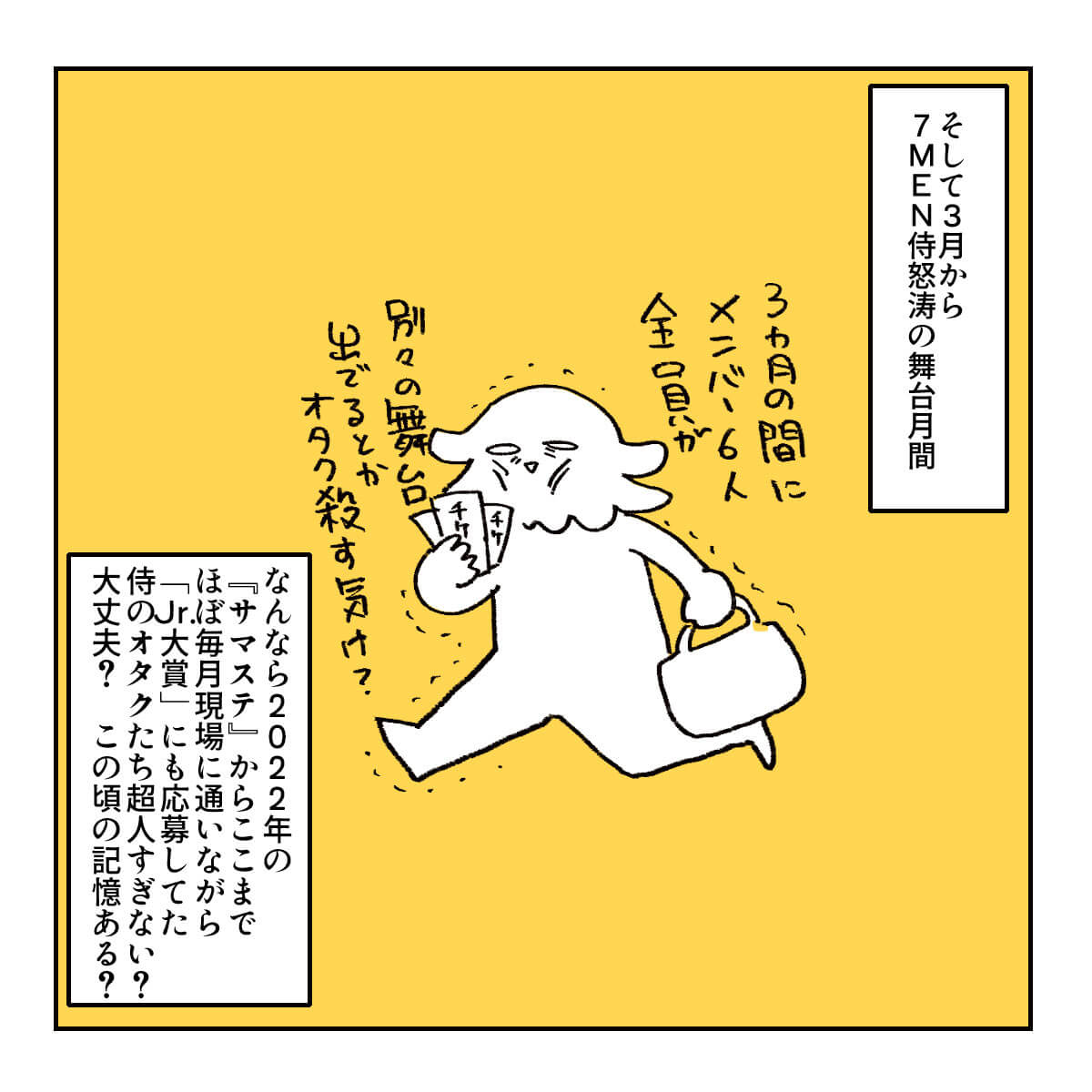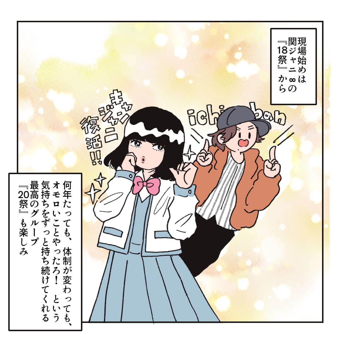 サイゾーウーマン男性アイドルSTARTO(旧ジャニーズ)関ジャニ∞からSixTONES、Snow Man、ジュニアまで……2023年の現場回顧録 男性アイドル [ドルオタ漫画家・竜田トキヒロの“推し事”見聞録]vol.37 関ジャニ∞からSixTONES、Snow Man、ジュニアまで……2023年の現場回顧録 2024/01/05 20:50 竜田トキヒロ(マンガ家) 竜田トキヒロの“推し事”見聞録STARTO ――Twitterで日々、STARTO ENTERTAINMENT(旧ジャニーズ事務所)のタレントをはじめとしたイラストを投稿中のドルオタ漫画家・竜田トキヒロが、現場レポートからドラマや映画、番組レビューまで、“推し事”の様子をお届け! 今回は、昨年1月に行われた関ジャニ∞のデビュー18周年記念ドームツアー『18祭』をはじめ、東西のジュニア(当時はジャニーズJr.)約200人が集結した8月の『ALL Johnnys’ Jr. 2023 わっしょいCAMP! in Dome』など、デビュー組からJr.まで、竜田氏が2023年に足を運んだ現場の所感を年末にあらためて振り返ってもらいました。 過去の連載記事でレポートを掲載している公演もありますので、まだチェックされていない方は、この機会にぜひご覧ください! 7 MEN 侍・矢花黎への“直感”が“確信”に変わった舞台とは? 【ジャニオタマンガ】7 MEN 侍・佐々木大光に全人類が恋!? 『GYPSY』観劇レポ――Twitterで日々、ジャニーズタレントにまつわるイラストを投稿中のジャニオタ漫画家・竜田トキヒロが、現場レポートからドラマや映画、番組レビューまで、“推し事”の様子を...サイゾーウーマン2023.05.17 次のページ SixTONES、Snow Manのドーム公演で感じた“共通点” 123次のページ 関連記事 INIのパフォーマンスは新鮮! STARTOアーティストとの違いとは?BE:FIRST・SOTA、Snow Manラウールら『FNS歌謡祭』ダンスコラボ7名の魅力とは?Snow Manから&TEAM、JO1まで……『ベストアーティスト』名場面をプレイバック!KAT-TUN・亀梨和也のYouTube、“後輩”Snow Man・目黒蓮がかわいすぎ!?【ジャニオタマンガ】神番組だった『ザ少年倶楽部』ベストパフォーマンスをプレイバック