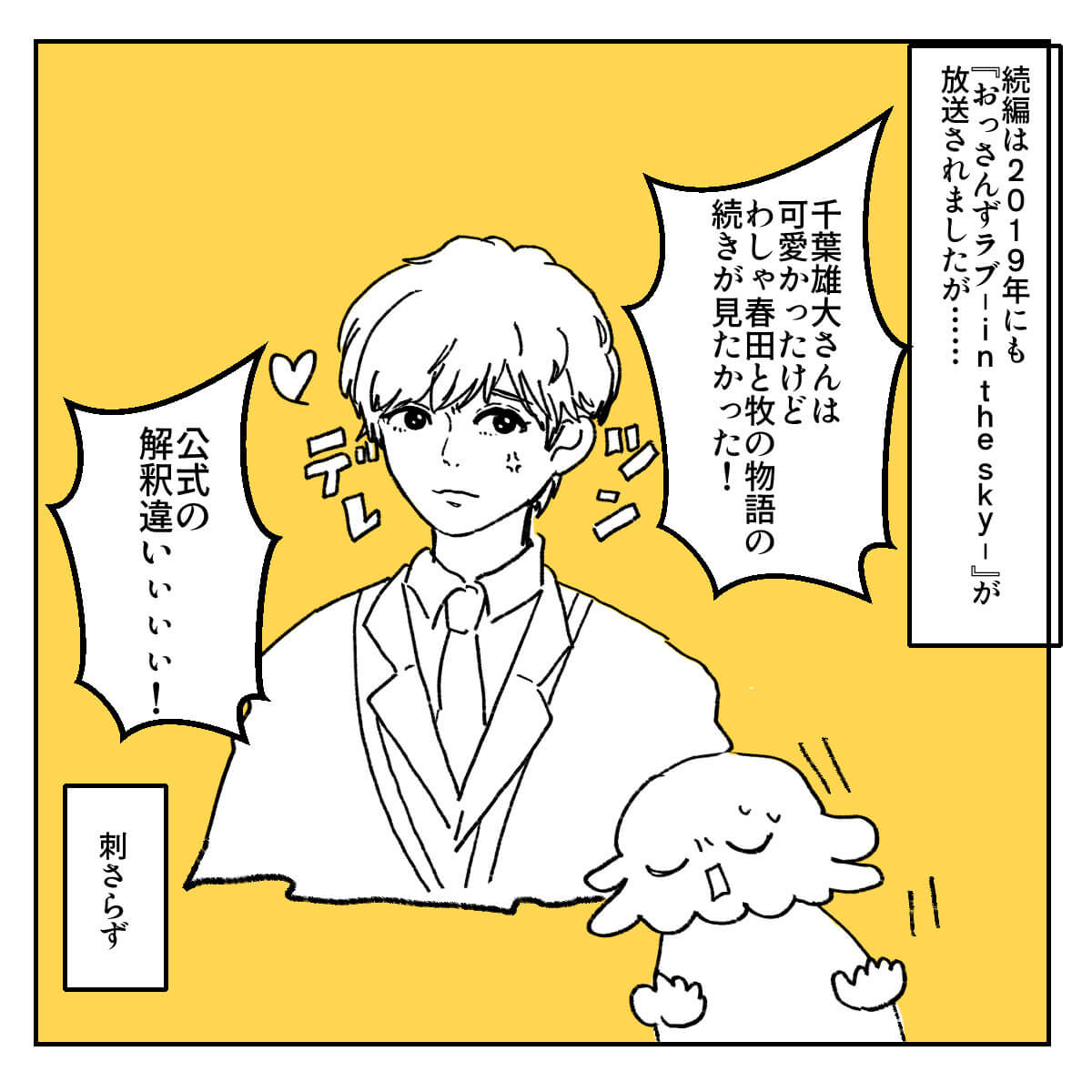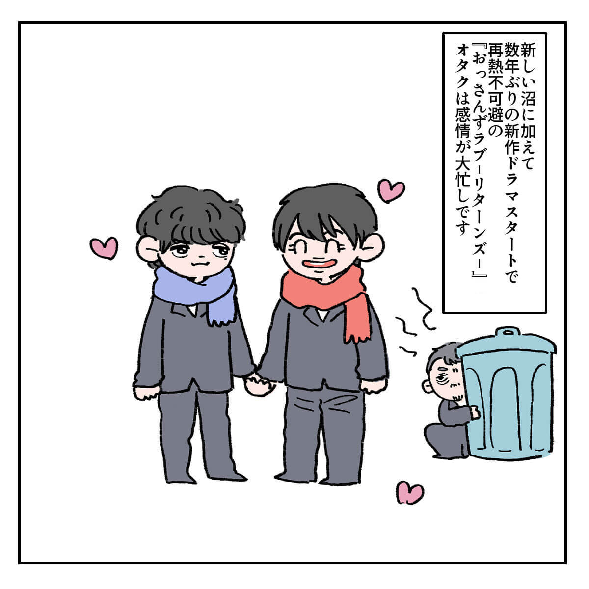 サイゾーウーマン男性アイドルSTARTO(旧ジャニーズ)『おっラブ』1話、春田&牧に大感激! 男性アイドル [ドルオタ漫画家・竜田トキヒロの“推し事”見聞録]vol.39(番外編) 『おっさんずラブ-リターンズ-』1話、ファンが求めていた春田&牧カップルに大感激! 2024/01/11 10:00 竜田トキヒロ(マンガ家) 竜田トキヒロの“推し事”見聞録STARTO ――Twitterで日々、STARTO ENTERTAINMENT(旧ジャニーズ事務所)のタレントをはじめとしたイラストを投稿中のドルオタ漫画家・竜田トキヒロが、現場レポートからドラマや映画、番組レビューまで、“推し事”の様子をお届け! 今回は、“番外編”として、1月5日よりスタートしたドラマ『おっさんずラブ-リターンズ-』(テレビ朝日系)第1話をレビュー! 『おっさんずラブ』は、主人公の会社員・春田創一(田中圭)と春田の上司である部長・黒澤武蔵(吉田鋼太郎)を中心に、男性同士のピュアな恋愛を描いたラブストーリー。2016年12月に単発ドラマが放送されました。 そして18年4月期に連ドラ化し、単発ドラマから引き続き春田と黒澤が登場したほか、エリートサラリーマンの牧凌太(林遣都)が新たに加わり三角関係を繰り広げ、人気が爆発。19年8月には、続編として映画『劇場版 おっさんずラブ ~LOVE or DEAD~』も公開されています。 その後、19年11~12月に連ドラのシーズン2となる『おっさんずラブ-in the sky-』も放送。これは、シーズン1や劇場版とは“別軸”の続編で、物語の舞台が不動産会社から航空会社に変更。春田と黒澤は田中と吉田が続投したものの、林が演じた牧は登場せず、新キャラクターの成瀬竜(千葉雄大)や四宮要(戸次重幸)らと四角関係のラブストーリーを展開しました。 今回の『おっさんずラブ-リターンズ-』では、約5年ぶりにファン待望のシーズン1&劇場版の続編が描かれるということで、春田&牧カップルのファンが大注目! 海外転勤を経て帰国した牧と春田が“新婚生活”を始めた第1話を、シリーズの大ファンである竜田トキヒロがイラストで振り返ります。 『おっさんずラブ-リターンズ-』1話、春田と牧の会話に大感激! 次のページ 『おっさんずラブ-リターンズ-』自堕落な春田にブチギレする牧に思わず共感! 123次のページ 関連記事 『おっさんずラブ』にハマって“73回”映画館に通った!? 『しくじり先生』おかずクラブ・オカリナの“ガチオタ”ぶりに「好感が持てる」の声【2019年映画レビュー】劇場版『おっさんずラブ』に学ぶ、LGBTを“線引き”しないということ『おっさんずラブ-in the sky-』最終回に「脚本がお粗末」「無理やりすぎる」と不満続出のワケSnow Man年越し生配信、「応援しよう」とファンに決意させた目黒蓮の“言葉”関ジャニ∞からSixTONES、Snow Man、ジュニアまで……2023年の現場回顧録