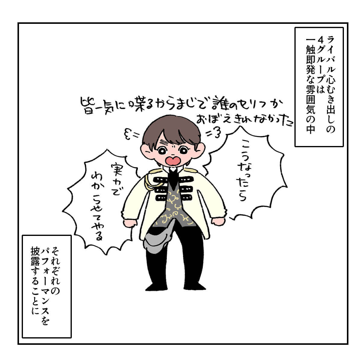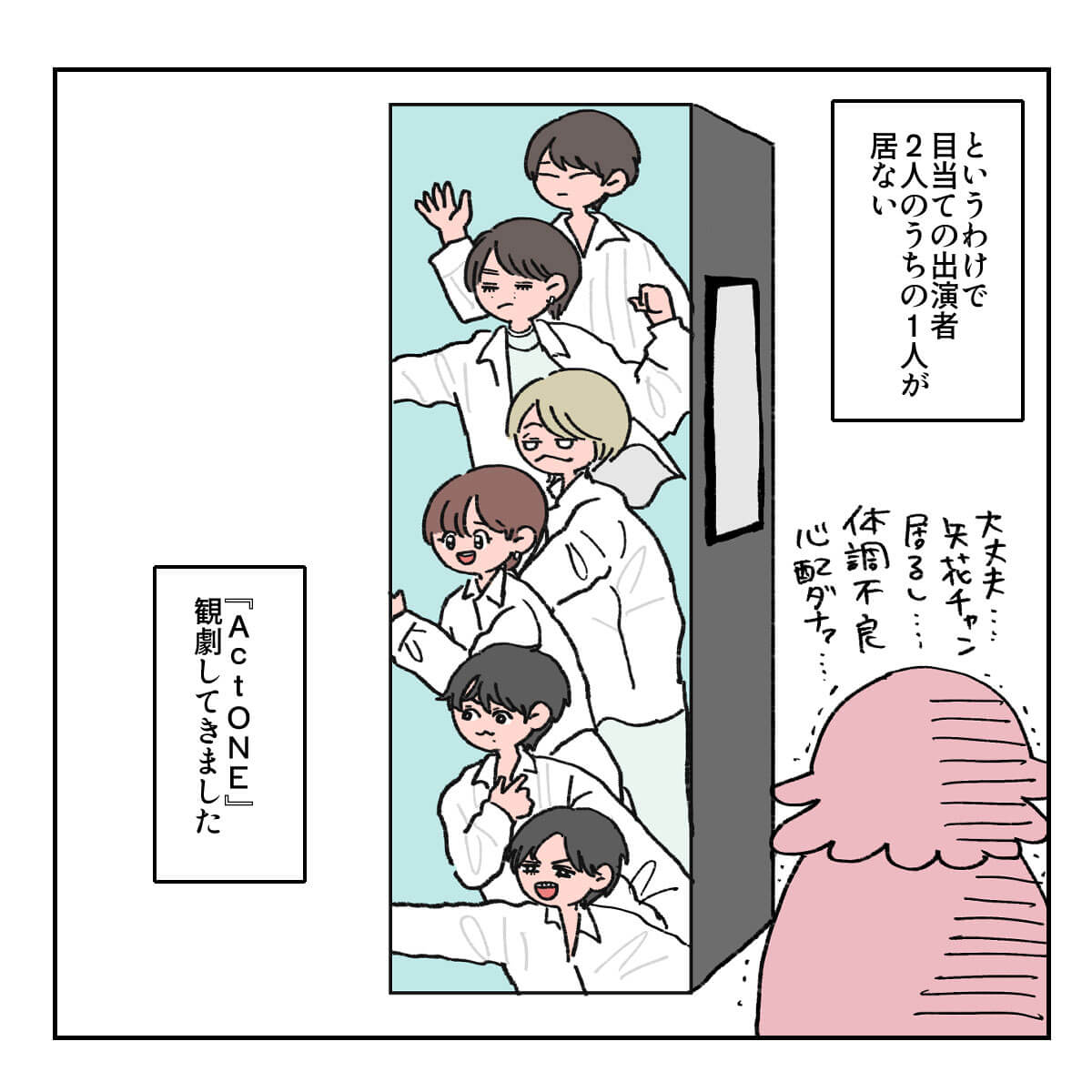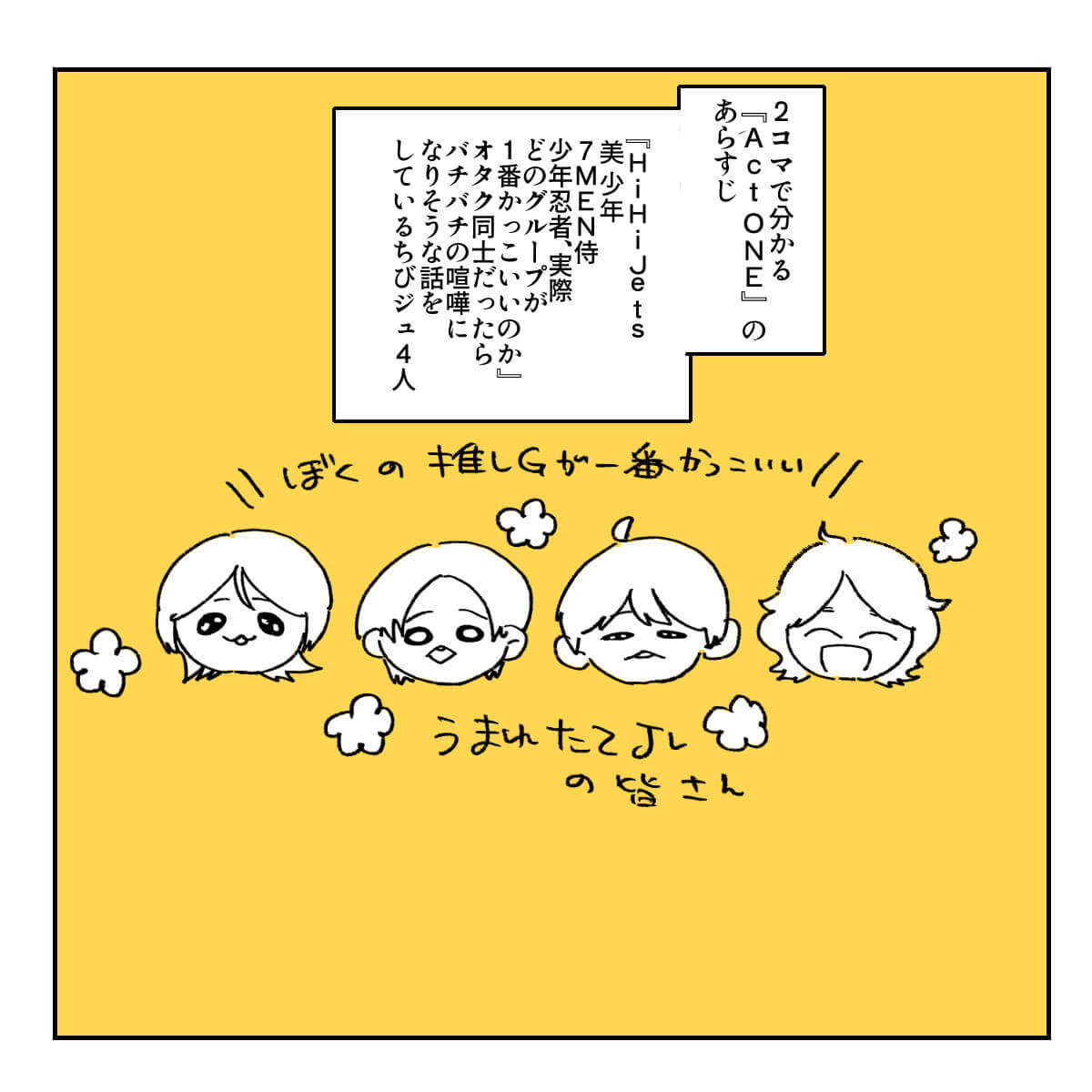 サイゾーウーマン男性アイドル舞台『Act ONE』観劇レポ 男性アイドル [ドルオタ漫画家・竜田トキヒロの“推し事”見聞録]vol.41 舞台『Act ONE』観劇イラストレポ! HiHi Jets・井上&作間のフライングがまるで宗教画 2024/01/25 16:30 竜田トキヒロ(マンガ家) 竜田トキヒロの“推し事”見聞録ジュニアSTARTO ――Twitterで日々、STARTO ENTERTAINMENT(旧ジャニーズ事務所)のタレントをはじめとしたイラストを投稿中のドルオタ漫画家・竜田トキヒロが、現場レポートからドラマや映画、番組レビューまで、“推し事”の様子をお届け! 今回は、 HiHi Jets、美 少年、7 MEN 侍、少年忍者らが東京・帝国劇場で上演中の舞台『Act ONE』をレポート! 今作は、帝国劇場が2025年2月、老朽化による建て替えで休館するまでに行われる記念公演の第1弾。各グループが20分のオムニバス形式でパフォーマンスを行っていくエンターテインメントショーで、林一敬、手島麗央、竹村実悟、阿達慶ら、ユニットに属さない無所属のジュニアも多数出演中です。 演出は出演者たちそれぞれが行い、“スーパーヴァイザー”としてKinKi Kids・堂本光一も携わっているそう。一体どんなステージなのか、イラストで紹介していきます。 舞台『Act ONE』のあらすじは? 次のページ 舞台『Act ONE』7 MEN 侍・矢花黎越しに見たバックジュニアに注目! 123次のページ 関連記事 EBiDANの地上波初冠レギュラー番組、超特急・カイのコメントが光る!『おっさんずラブ-リターンズ-』1話、ファンが求めていた春田&牧カップルに大感激!Snow Man年越し生配信、「応援しよう」とファンに決意させた目黒蓮の“言葉”関ジャニ∞からSixTONES、Snow Man、ジュニアまで……2023年の現場回顧録INIのパフォーマンスは新鮮! STARTOアーティストとの違いとは?