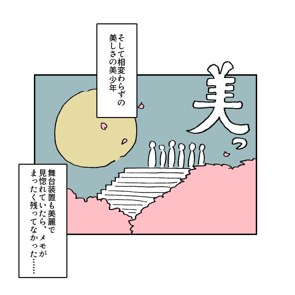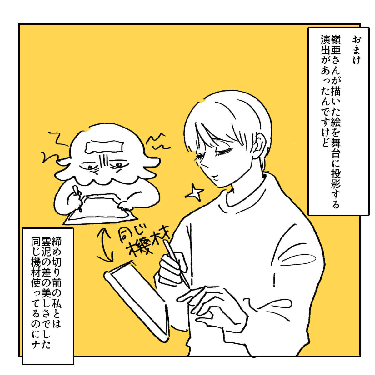 サイゾーウーマン男性アイドル舞台『Act ONE』観劇レポ 男性アイドル [ドルオタ漫画家・竜田トキヒロの“推し事”見聞録]vol.41 舞台『Act ONE』観劇イラストレポ! HiHi Jets・井上&作間のフライングがまるで宗教画 2024/01/25 16:30 竜田トキヒロ(マンガ家) 竜田トキヒロの“推し事”見聞録ジュニアSTARTO 舞台『Act ONE』少年忍者のド派手パフォーマンスは、まさにエンターテインメント! ★これまでの連載記事はこちらから Snow Man年越し生配信、「応援しよう」とファンに決意させた目黒蓮の“言葉”――Twitterで日々、STARTO ENTERTAINMENT(旧ジャニーズ事務所)のタレントをはじめとしたイラストを投稿中のドルオタ漫画家・竜田トキヒロが、現場レポー...サイゾーウーマン2024.01.06 関ジャニ∞からSixTONES、Snow Man、ジュニアまで……2023年の現場回顧録――Twitterで日々、STARTO ENTERTAINMENT(旧ジャニーズ事務所)のタレントをはじめとしたイラストを投稿中のドルオタ漫画家・竜田トキヒロが、現場レポー...サイゾーウーマン2024.01.05 【ジャニオタマンガ】神番組だった『ザ少年倶楽部』ベストパフォーマンスをプレイバック――Twitterで日々、ジャニーズタレントにまつわるイラストを投稿中のジャニオタ漫画家・竜田トキヒロが、現場レポートからドラマや映画、番組レビューまで、“推し事”の様子を...サイゾーウーマン2023.11.22 前のページ123 竜田トキヒロ(マンガ家) 漫画家、イラストレーター。育休中に執筆したエッセイ漫画でKADOKAWAコミックエッセイ大賞受賞。Ameba、ライブドア公式ブロガーを経たのち現在はインフルエンサーとしてエンタメ、オタクに特化した漫画やイラストや体験ルポ等幅広く執筆。著書『コミュ障母さんとごきげん娘』(KADOKAWA) X:@musumenuma 最終更新:2024/01/25 16:33 舞台は今月27日まで! 関連記事 EBiDANの地上波初冠レギュラー番組、超特急・カイのコメントが光る!『おっさんずラブ-リターンズ-』1話、ファンが求めていた春田&牧カップルに大感激!Snow Man年越し生配信、「応援しよう」とファンに決意させた目黒蓮の“言葉”関ジャニ∞からSixTONES、Snow Man、ジュニアまで……2023年の現場回顧録INIのパフォーマンスは新鮮! STARTOアーティストとの違いとは? 次の記事 推しの子実写化、注目集める原作者コメント >