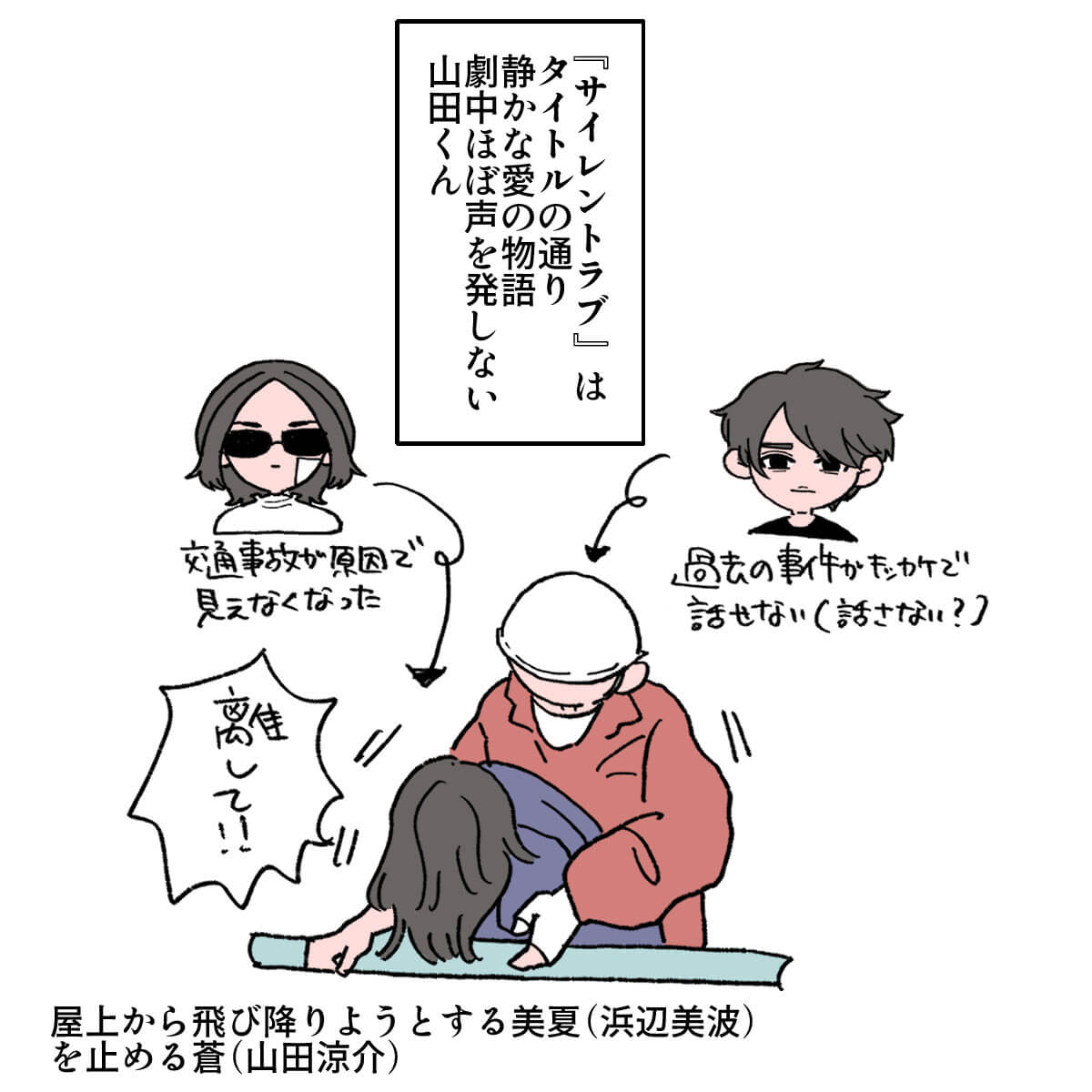 サイゾーウーマン男性アイドルSTARTO(旧ジャニーズ)Hey!Say!JUMP山田涼介山田涼介、『サイレントラブ』で“チベスナ顔” 男性アイドル [ドルオタ漫画家・竜田トキヒロの“推し事”見聞録]vol.43 映画『サイレントラブ』、山田涼介が“チベスナ顔”に!? 視線の演技に号泣 2024/02/14 21:45 竜田トキヒロ(マンガ家) Hey! Say! JUMP竜田トキヒロの“推し事”見聞録山田涼介 ――Twitterで日々、STARTO ENTERTAINMENT(旧ジャニーズ事務所)のタレントをはじめとしたイラストを投稿中のドルオタ漫画家・竜田トキヒロが、現場レポートからドラマや映画、番組レビューまで、“推し事”の様子をお届け! 今回は、現在公開中のHey!Say!JUMP・山田涼介主演映画『サイレントラブ』をレビュー! この映画は、2020年9月に公開された草なぎ剛主演映画『ミッドナイトスワン』でメガホンを取った内田英治氏が原案・脚本・監督を手掛けた「世界でいちばん静かなラブストーリー」(公式サイトより)。 ある出来事をきっかけに声を発することをやめた青年・沢田蒼(山田)と、不慮の事故で視力を失ったピアニスト志望の音大生・甚内美夏(浜辺美波)の恋模様を描いた物語で、野村周平、SWAY、吉村界人、古田新太、辰巳琢郎らも出演しています。 意外にも、今作がラブストーリー映画初主演作となった山田が、いったいどんな演技を見せているのか、イラストで紹介します。 ※本記事は映画『サイレントラブ』のネタバレを含みます。 映画『サイレントラブ』声を発しないHey!Say!JUMP・山田涼介が本気の“チベスナ顔”に 次のページ 映画『サイレントラブ』音大講師役の野村周平が悪手すぎる!? 123次のページ 関連記事 山田涼介主演映画『サイレントラブ』3位発進も……脚本がネット上で賛否両論のワケ【ジャニオタマンガ】山田涼介の美貌とコントが交互に! 賛否両論の映画『大怪獣のあとしまつ』レビューHey!Say!JUMP・山田涼介のかわいいショットが3位に! 生写真売り上げランキング【2024年1月ベスト5】Hey!Say!JUMP・山田涼介、「悔しさもある」発言が物議醸す中島健人は熱愛報道にコメント、山田涼介は「クソが」発言――STARTO新方針が影響?