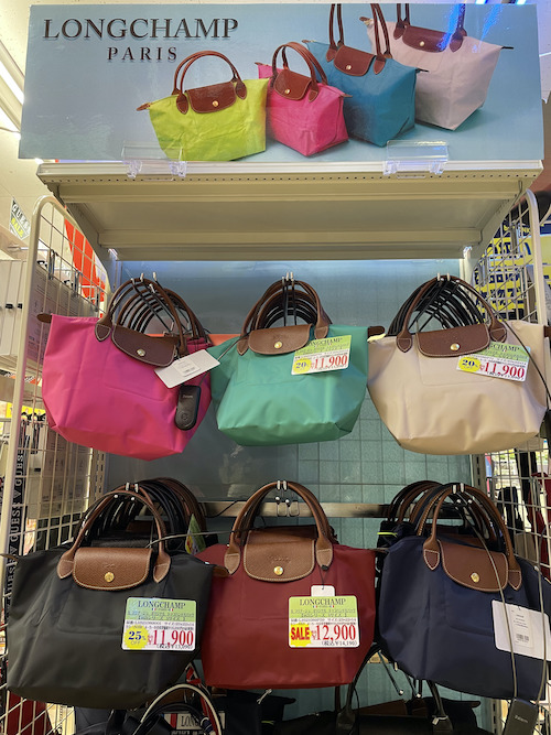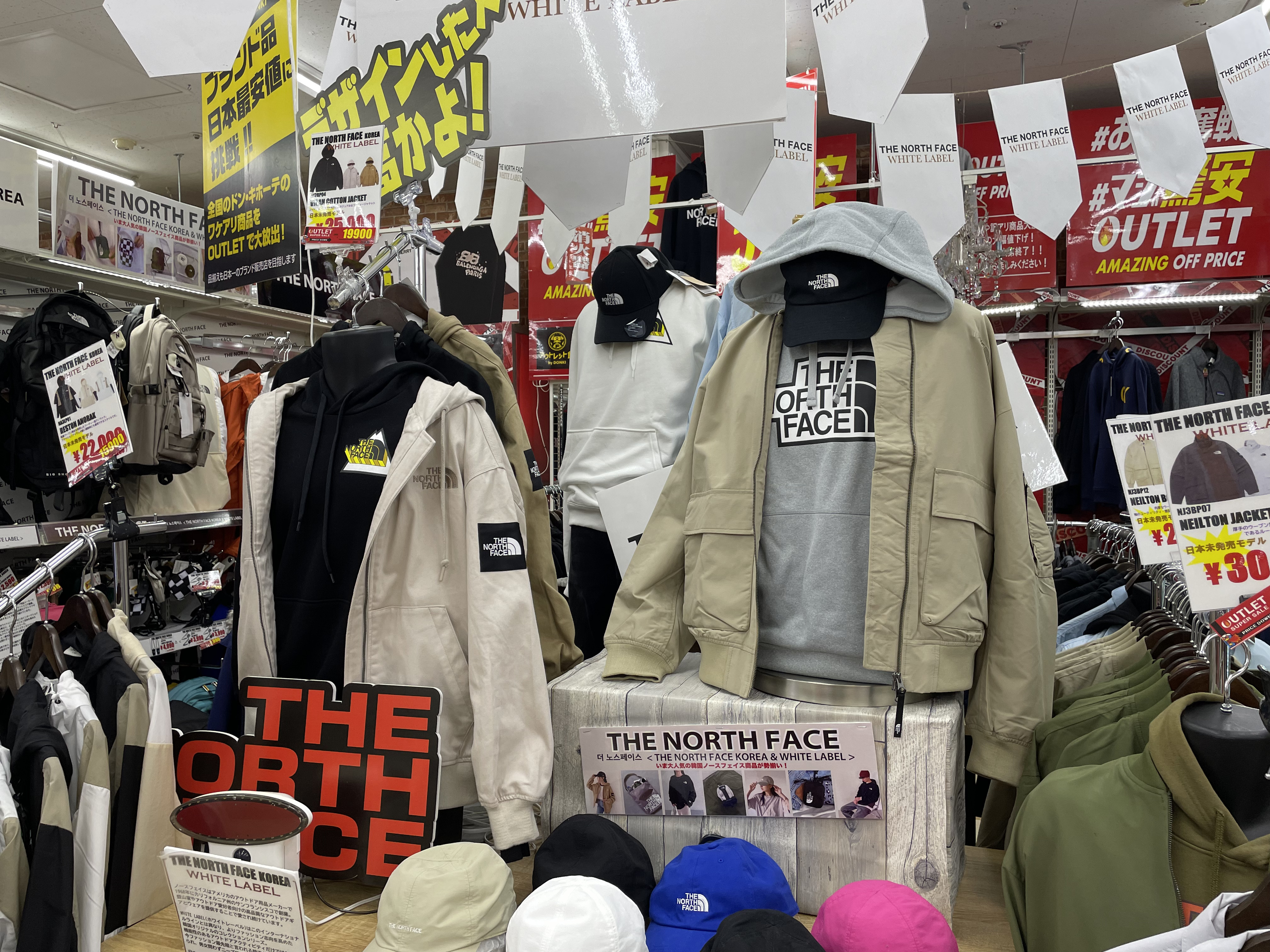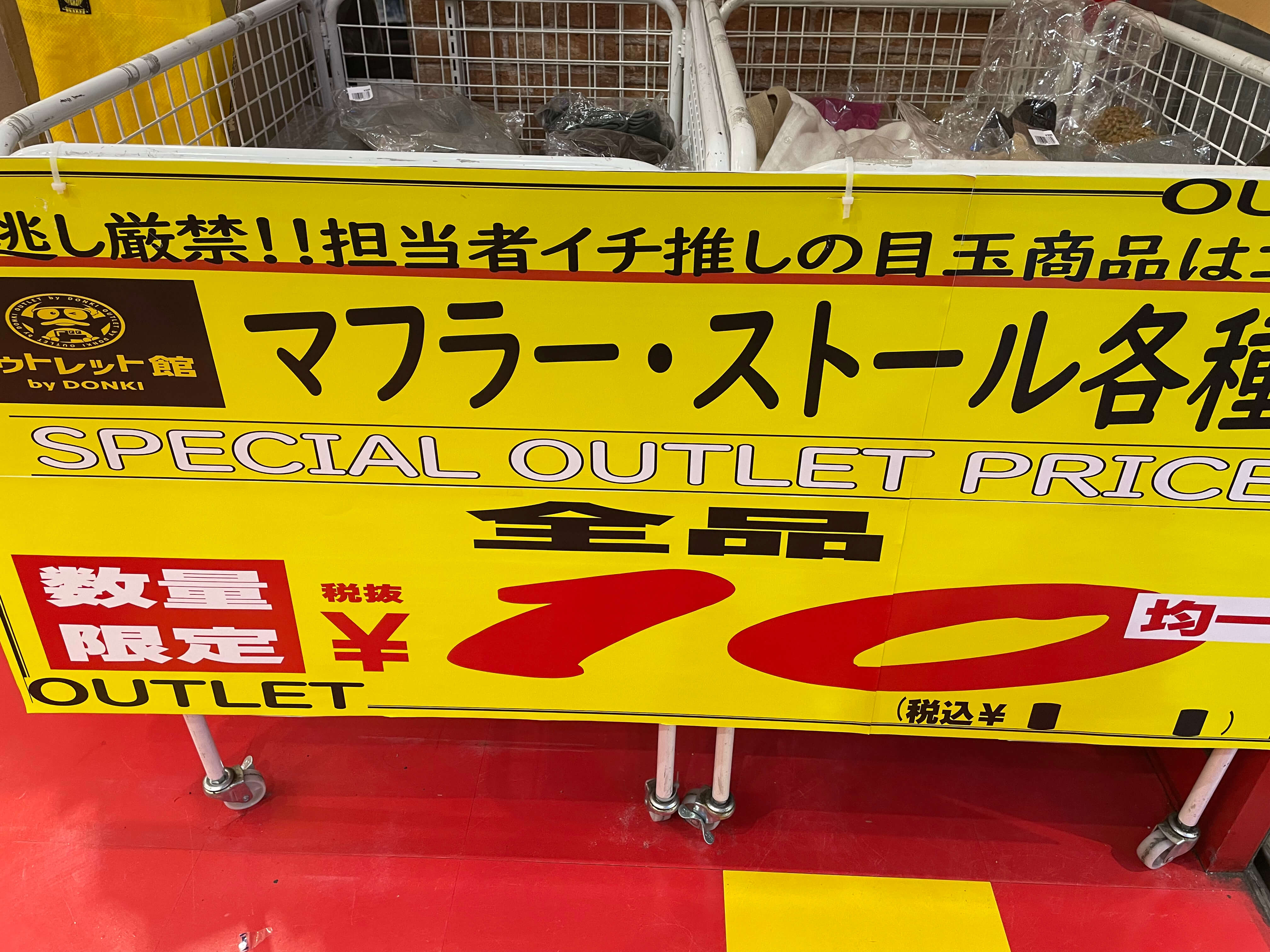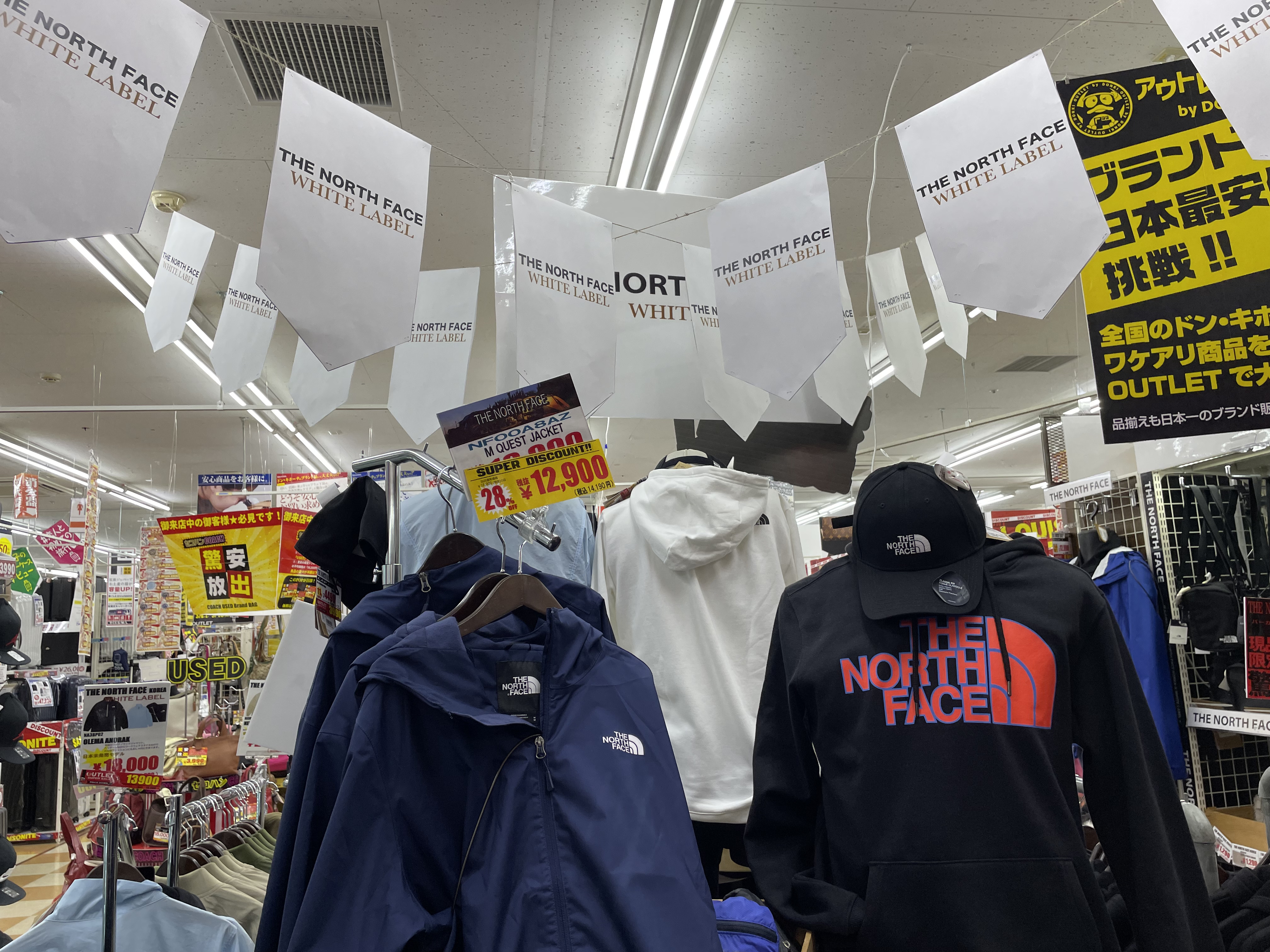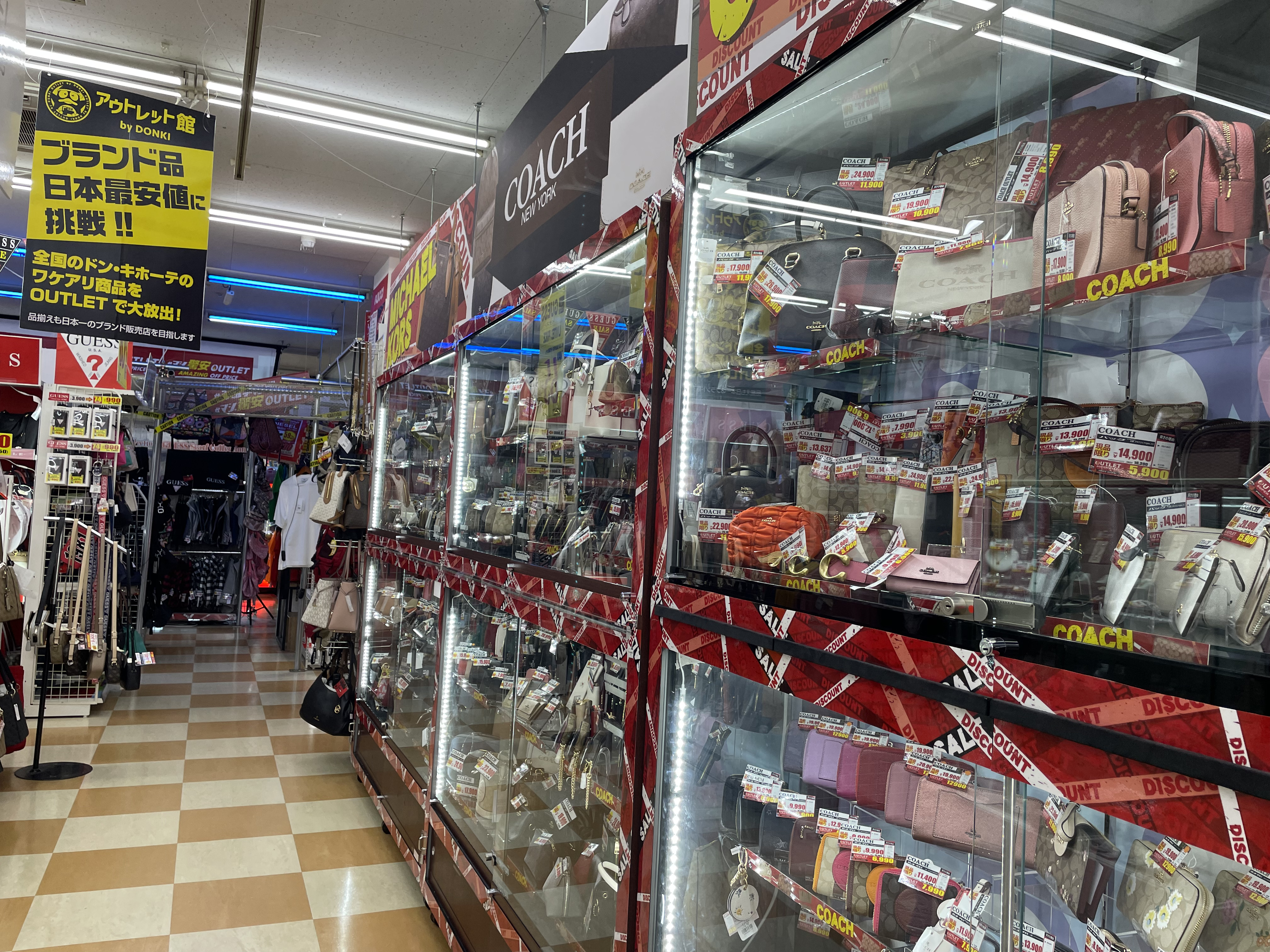 サイゾーウーマン暮らしトレンドドンキ【アウトレット館】カオスで最高 暮らし ドン・キホーテアウトレット館探訪 ドンキ初の【アウトレット館】に大興奮! エルメス「438万円ケリー」やドンペン氾濫のカオスだった【写真27点】 2024/02/21 18:00 サイゾーウーマン編集部 ドン・キホーテ ドンキホーテアウトレット館の外観(写真:サイゾーウーマン) 「驚安の殿堂」でおなじみ総合ディスカウントストアのドン・キホーテ。昨夏、渋谷・道玄坂に「ドミセ」をオープンしたのが話題になりましたよね。ドンキのPB「情熱価格」からよりすぐりの商品や、オリジナルブランドのアイテムを販売するショップで、一部にはまったく売れなかった「ドすべり商品」も激安で置いているとか。 一方で、ドン・キホーテのPBに限らず売れ残り品のみを扱う「アウトレット館」があるのはご存じでしょうか? 神奈川県厚木市にあるドンキ初の「アウトレット館」に行ったところ、想像を超えるドンキ濃度120%のカオス空間だったので写真たっぷりで紹介していきます! 目次 ・ドン・キホーテアウトレット館とは? ・GUCCIのTシャツ5,390円 ・ヴィトンもクロエもなんでもある ・顔とドンペンの氾濫! カラコンコーナーがカオス ・エルメスのケリーがまさかの399万円 ・韓国限定「THE NORTH FACE WHITE LABEL」が買える ドン・キホーテアウトレット館とは? ドンキ公式サイトでドン・キホーテのアウトレット館について調べてみましたが、なにを売っているのか、どんなコンセプトの店なのかといった情報は皆無。めぼしい情報はアクセス方法と営業時間(午前10時~午前3時)くらいです。 そこでネット上でリサーチしてみると、Googleのクチコミで以下の情報が見つかりました。 ・ブランド好きにはたまりません。現在ドンキ全般でブランドコーナー縮小・撤廃をしてるなかで、全国の品が此処に集まります ・メジャーブランドの商品で、数が少ないアウトレット品が並んでいます。 ・アウトレット価格で革靴も普段行ってる靴屋さんで買うよりも安く買える。 ・タバコのジャンルは多かった。種類自体は少ないものの通常の紙巻きタバコ、アイコス、手巻きタバコ、葉巻、パイプ等ありました。 ・品物が多くて安いです どうやら、全国のドンキからアウトレット品が集まっている場所で、ブランド品が格安で買えるのは間違いない様子。 ドン・キホーテアウトレット館なら、GUCCIのTシャツ5,390円 ドン・キホーテアウトレット館に到着。エントランスからかなりの歓迎ムード。 レインボーカラーのウェルカムと南国の花がアッパームード(写真:サイゾーウーマン) 店内フロアの入口前で販売されていたのは、10円のマフラー・ストール。ワゴン販売です。 見逃し厳禁!! と言われたら見るしかない(写真:サイゾーウーマン) 598円や398円のマフラーが10円になっているようです。 (写真:サイゾーウーマン) 店内に入ってすぐは、酒コーナー。人気のウイスキー「知多」がズラリと並んでいます。 価格は700ml、4,389円。350mlで2,189円。定価はそれぞれ4,400円、2,200円のためオトク感はないですが、知多は終売のうわさがあり、ネット上でも売り切れ続出の入手困難状態なので、購入できること自体がすごいかもしれません! 知多を探してる方は多そう(写真:サイゾーウーマン) 人気の響、山崎、白州も。「山崎25年 新」700mlは153万8900円! 軽自動車が新車で買える値段! 驚安商品を見に来たのに、全然安くないものばかりでテンションが上がりません。 高級酒コーナー(写真:サイゾーウーマン) と、思っていたら、唐突にGUCCIのTシャツ! 77%オフの5,500円からさらにプライスダウンで5,390円!? GUCCIのTシャツって定価2万2000円なんだな(写真:サイゾーウーマン) タグで衿口ビロビロ。GUCCIだろうが容赦ないところがドンキの長所! っていうか、GUCCIのTシャツって、ハンガーが透けて見えるほど生地が薄めなんですね。 GUCCIの洋服を気安く手に取れる(写真:サイゾーウーマン) ドンキのブランド品は本物か偽物か? なんて考えるのは実にナンセンス。「ドンキの価格は意味不明!」と興奮して楽しめばいいだと思います! 一応、公式サイトでは「取り扱っているブランド品に偽造品や不正商品は一切ございません」と断言してますよ。 >>>「ドンキのブランド品って大丈夫?」にお答えします。 「キュンプライス」(写真:サイゾーウーマン) ポール・スミスのマフラーやスカーフも「キュンプライス」の3,300円! ブランド品でも容赦なくプラスチックのハンガーで雑に並べるところがドンキっぽくていいですね! 「圧倒的価格」(写真:サイゾーウーマン) 大人気Supremeも3万7,400円。ラフィアトートバッグは、Supreme通販専門店では4万9,980円で販売されてました。「圧倒的価格に挑戦中」の言葉、間違いありません。 「ブランド品の最安値に挑戦!!」(写真:サイゾーウーマン) 店内は全体的に照明が暗めなんですが、ブランドコーナーだけやけに明るい蛍光灯で、そこにショーウインドウのネオン的な照明も加わり、値札を見てい