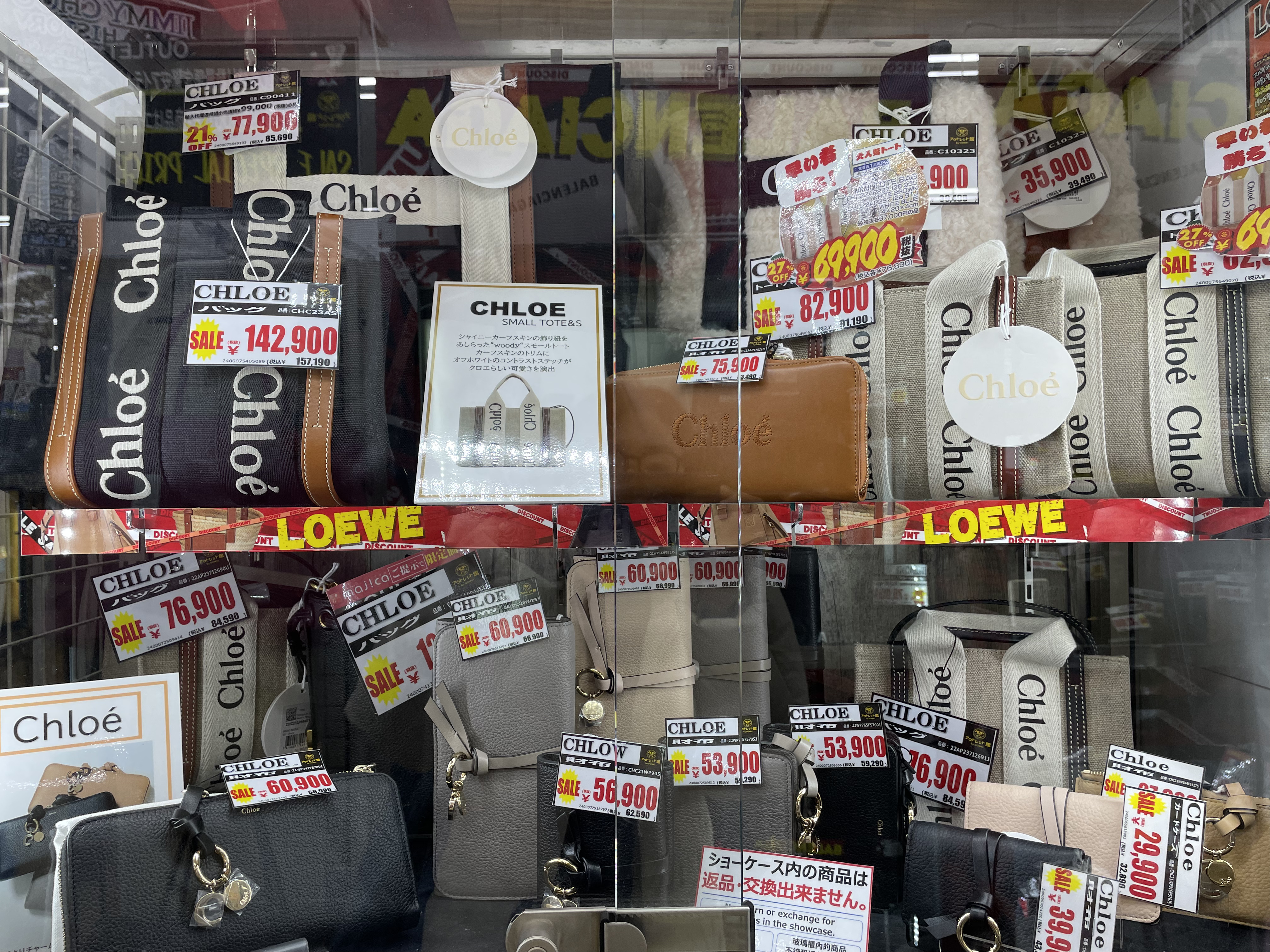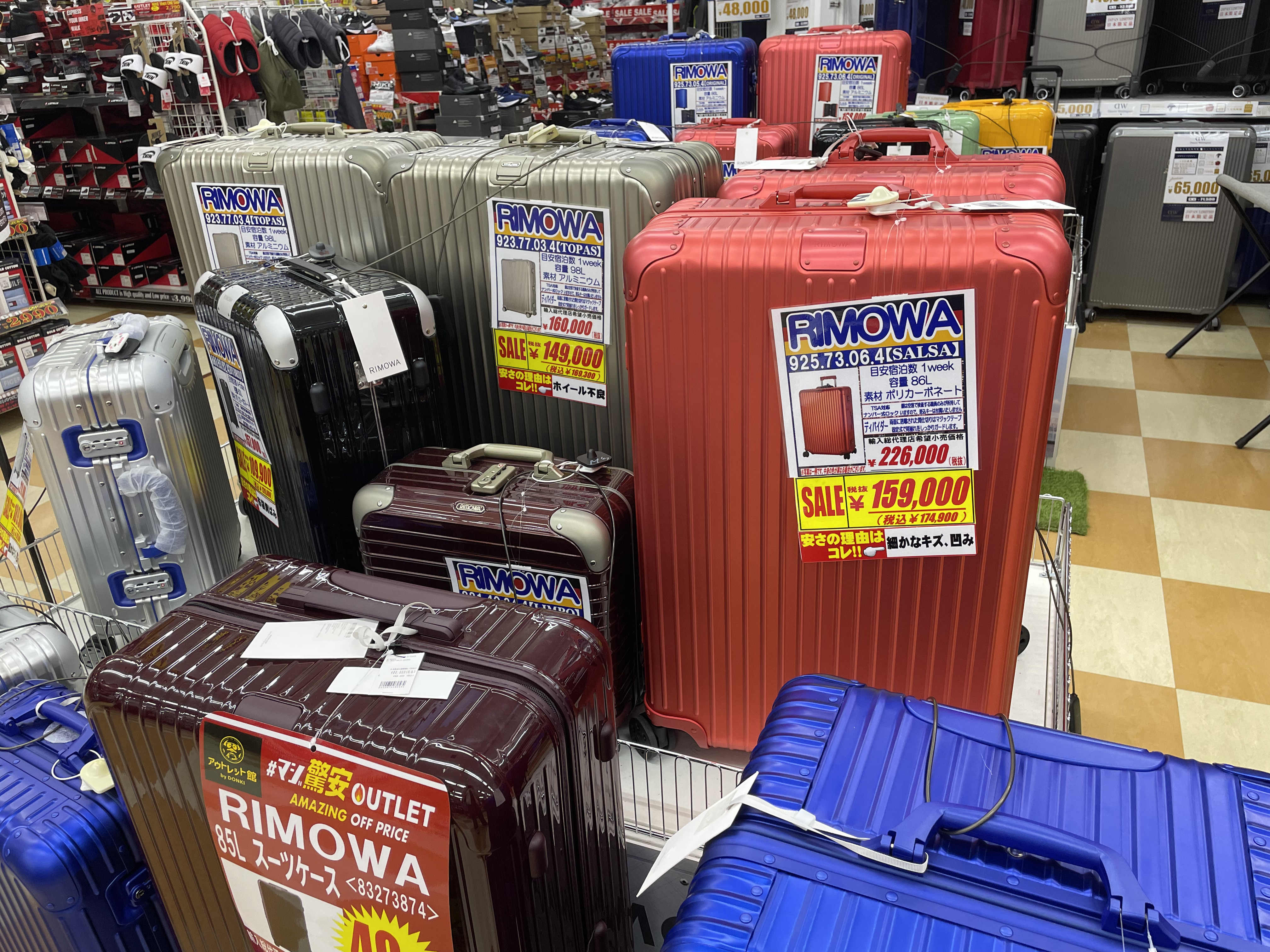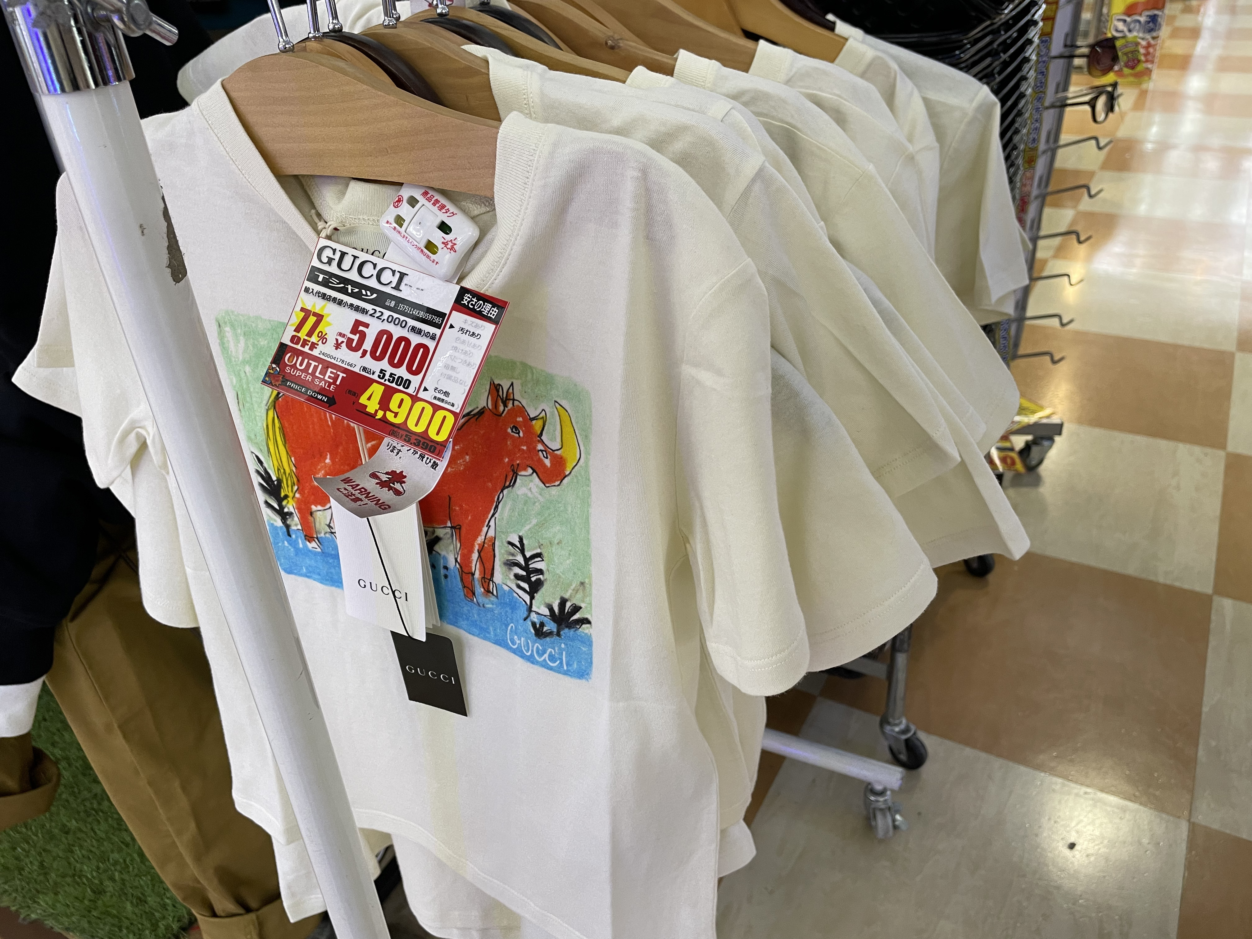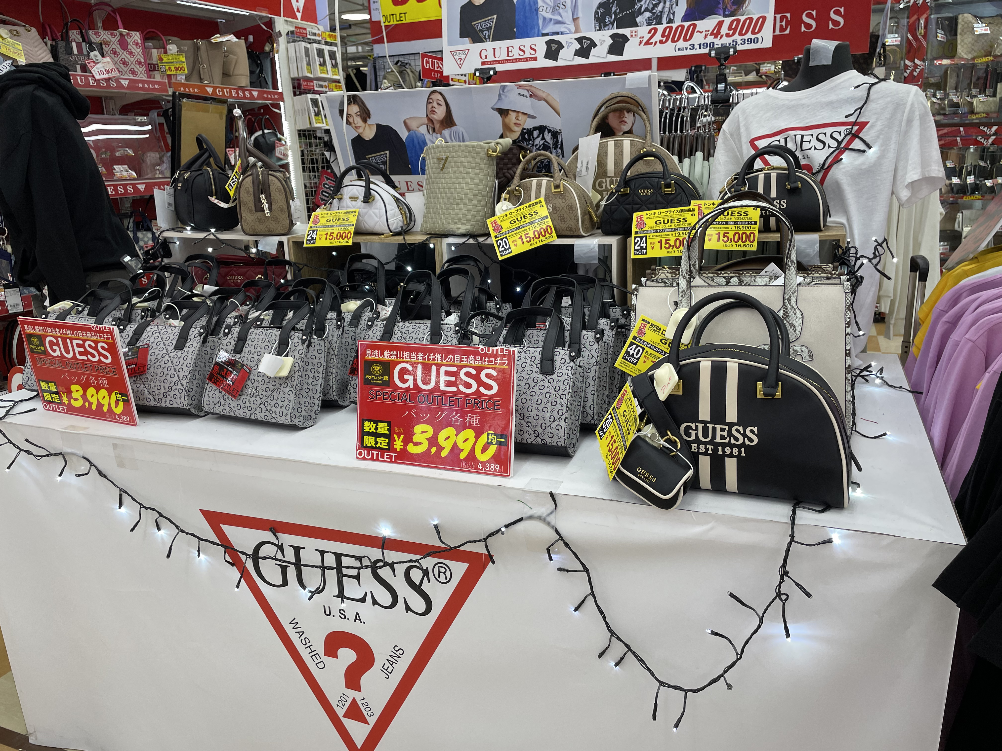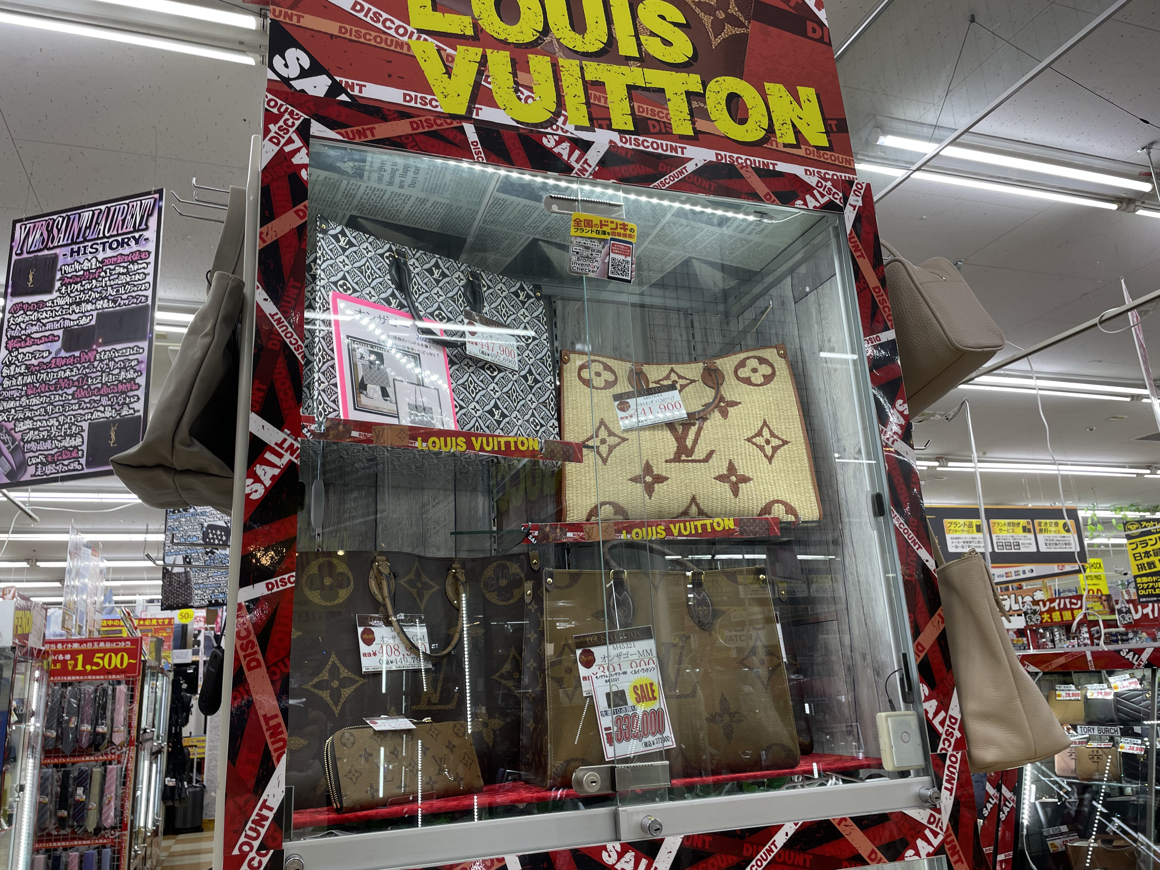 サイゾーウーマン暮らしトレンドドンキ【アウトレット館】カオスで最高 暮らし ドン・キホーテアウトレット館探訪 ドンキ初の【アウトレット館】に大興奮! エルメス「438万円ケリー」やドンペン氾濫のカオスだった【写真27点】 2024/02/21 18:00 サイゾーウーマン編集部 ドン・キホーテ ドンキホーテアウトレット館の外観(写真:サイゾーウーマン) 「驚安の殿堂」でおなじみ総合ディスカウントストアのドン・キホーテ。昨夏、渋谷・道玄坂に「ドミセ」をオープンしたのが話題になりましたよね。ドンキのPB「情熱価格」からよりすぐりの商品や、オリジナルブランドのアイテムを販売するショップで、一部にはまったく売れなかった「ドすべり商品」も激安で置いているとか。 一方で、ドン・キホーテのPBに限らず売れ残り品のみを扱う「アウトレット館」があるのはご存じでしょうか? 神奈川県厚木市にあるドンキ初の「アウトレット館」に行ったところ、想像を超えるドンキ濃度120%のカオス空間だったので写真たっぷりで紹介していきます! 目次 ・ドン・キホーテアウトレット館とは? ・GUCCIのTシャツ5,390円 ・ヴィトンもクロエもなんでもある ・顔とドンペンの氾濫! カラコンコーナーがカオス ・エルメスのケリーがまさかの399万円 ・韓国限定「THE NORTH FACE WHITE LABEL」が買える ドン・キホーテアウトレット館とは? ドンキ公式サイトでドン・キホーテのアウトレット館について調べてみましたが、なにを売っているのか、どんなコンセプトの店なのかといった情報は皆無。めぼしい情報はアクセス方法と営業時間(午前10時~午前3時)くらいです。 そこでネット上でリサーチしてみると、Googleのクチコミで以下の情報が見つかりました。 ・ブランド好きにはたまりません。現在ドンキ全般でブランドコーナー縮小・撤廃をしてるなかで、全国の品が此処に集まります ・メジャーブランドの商品で、数が少ないアウトレット品が並んでいます。 ・アウトレット価格で革靴も普段行ってる靴屋さんで買うよりも安く買える。 ・タバコのジャンルは多かった。種類自体は少ないものの通常の紙巻きタバコ、アイコス、手巻きタバコ、葉巻、パイプ等ありました。 ・品物が多くて安いです どうやら、全国のドンキからアウトレット品が集まっている場所で、ブランド品が格安で買えるのは間違いない様子。 ドン・キホーテアウトレット館なら、GUCCIのTシャツ5,390円 ドン・キホーテアウトレット館に到着。エントランスからかなりの歓迎ムード。 レインボーカラーのウェルカムと南国の花がアッパームード(写真:サイゾーウーマン) 店内フロアの入口前で販売されていたのは、10円のマフラー・ストール。ワゴン販売です。 見逃し厳禁!! と言われたら見るしかない(写真:サイゾーウーマン) 598円や398円のマフラーが10円になっているようです。 (写真:サイゾーウーマン) 店内に入ってすぐは、酒コーナー。人気のウイスキー「知多」がズラリと並んでいます。 価格は700ml、4,389円。350mlで2,189円。定価はそれぞれ4,400円、2,200円のためオトク感はないですが、知多は終売のうわさがあり、ネット上でも売り切れ続出の入手困難状態なので、購入できること自体がすごいかもしれません! 知多を探してる方は多そう(写真:サイゾーウーマン) 人気の響、山崎、白州も。「山崎25年 新」700mlは153万8900円! 軽自動車が新車で買える値段! 驚安商品を見に来たのに、全然安くないものばかりでテンションが上がりません。 高級酒コーナー(写真:サイゾーウーマン) と、思っていたら、唐突にGUCCIのTシャツ! 77%オフの5,500円からさらにプライスダウンで5,390円!? GUCCIのTシャツって定価2万2000円なんだな(写真:サイゾーウーマン) タグで衿口ビロビロ。GUCCIだろうが容赦ないところがドンキの長所! っていうか、GUCCIのTシャツって、ハンガーが透けて見えるほど生地が薄めなんですね。 GUCCIの洋服を気安く手に取れる(写真:サイゾーウーマン) ドンキのブランド品は本物か偽物か? なんて考えるのは実にナンセンス。「ドンキの価格は意味不明!」と興奮して楽しめばいいだと思います! 一応、公式サイトでは「取り扱っているブランド品に偽造品や不正商品は一切ございません」と断言してますよ。 >>>「ドンキのブランド品って大丈夫?」にお答えします。 「キュンプライス」(写真:サイゾーウーマン) ポール・スミスのマフラーやスカーフも「キュンプライス」の3,300円! ブランド品でも容赦なくプラスチックのハンガーで雑に並べるところがドンキっぽくていいですね! 「圧倒的価格」(写真:サイゾーウーマン) 大人気Supremeも3万7,400円。ラフィアトートバッグは、Supreme通販専門店では4万9,980円で販売されてました。「圧倒的価格に挑戦中」の言葉、間違いありません。 「ブランド品の最安値に挑戦!!」(写真:サイゾーウーマン) 店内は全体的に照明が暗めなんですが、ブランドコーナーだけやけに明るい蛍光灯で、そこにショーウインドウのネオン的な照明も加わり、値札を見てい