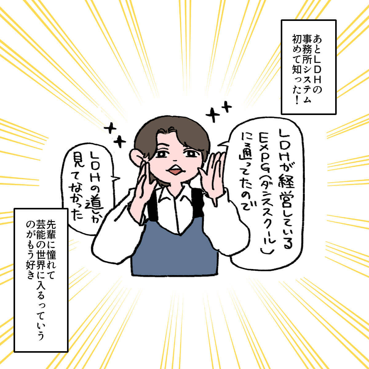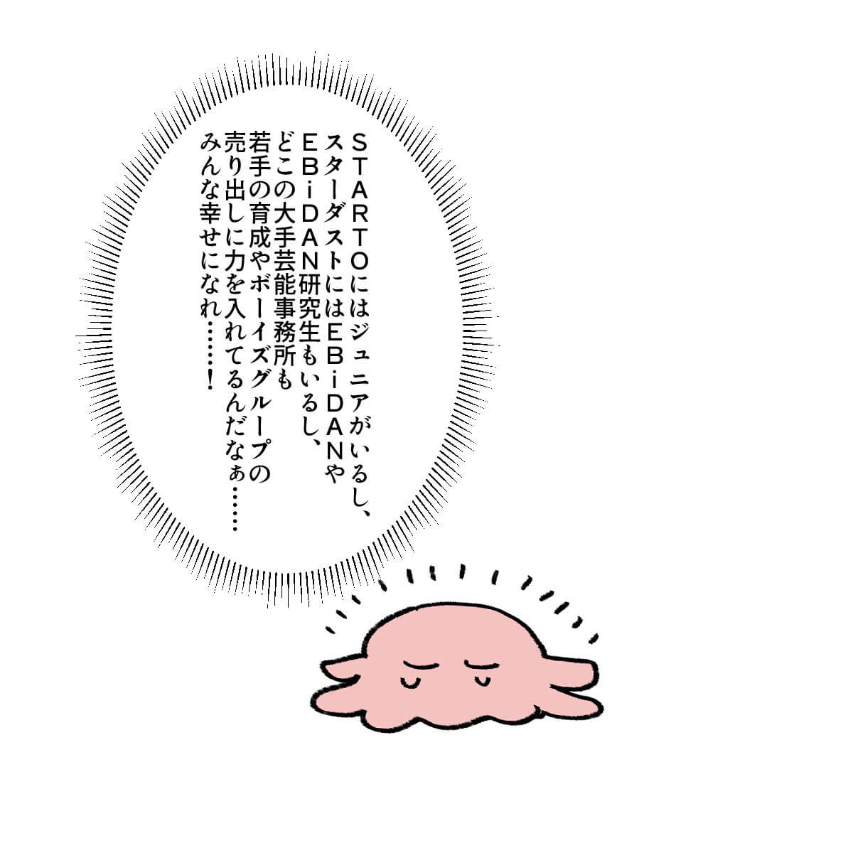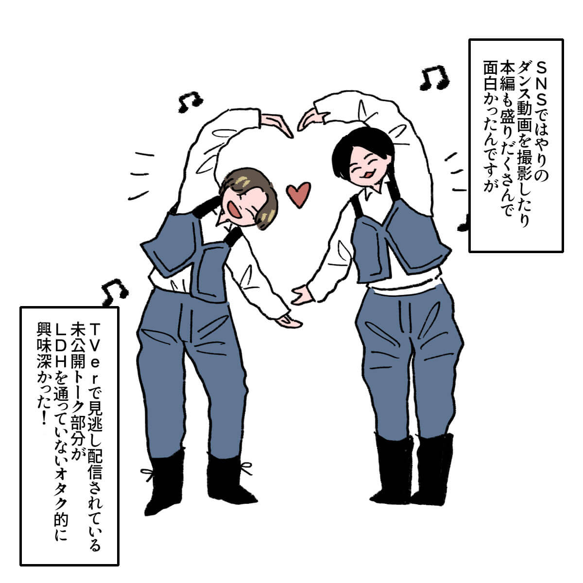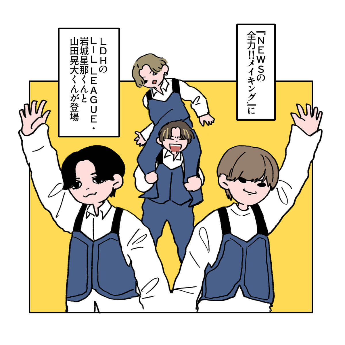 サイゾーウーマン男性アイドルSTARTO(旧ジャニーズ)NEWSNEWSとLIL LEAGUEの未公開トークが秀逸 男性アイドル [ドルオタ漫画家・竜田トキヒロの“推し事”見聞録]vol.45 NEWSの番組にLDH・LIL LEAGUE登場! 未公開トークでの“シゲアキの返し”が秀逸 2024/02/21 21:30 竜田トキヒロ(マンガ家) NEWS竜田トキヒロの“推し事”見聞録LDH ――Twitterで日々、STARTO ENTERTAINMENT(旧ジャニーズ事務所)のタレントをはじめとしたイラストを投稿中のドルオタ漫画家・竜田トキヒロが、現場レポートからドラマや映画、番組レビューまで、“推し事”の様子をお届け! 今回は、2月16日深夜放送されたNEWS・小山慶一郎&加藤シゲアキのレギュラー番組『NEWSの全力!!メイキング』(TBS系)をレビュー! 同番組は、小山と加藤が、「ゼロから作ったら面白そうなモノ」をゲストと共に、片っ端から自作していくDIYバラエティ。2021年4月30日深夜から放送を開始し、STARTO ENTERTAINMENTの後輩はもちろん、これまでさまざまな芸能人、タレントがゲスト出演しています。 また、近頃は他事務所のボーイズグループとの絡みも増えており、昨年12月15、22日放送回には、LDH所属のGENERATIONS from EXILE TRIBEの片寄涼太と関口メンディー、今年1月19、26日放送回には、同じくLDHからFANTASTICS from EXILE TRIBEの世界と中島颯太が登場。これまでなかなか見られなかった共演だけに、SNS上では双方のファンからさまざまな反響を集めました。 今回は、平均年齢16歳というLDHの最年少グループ・LIL LEAGUE from EXILE TRIBE(以下、LIL LEAGUE)の岩城星那と山田晃大が出演した、2月16日深夜放送回をプレイバック。初共演の4人が一体どんなやりとりを見せたのか、イラストで振り返っていきます。 目次 ・NEWSとLIL LEAGUEの年齢差に驚き ・未公開トークでの加藤シゲアキによる“秀逸な返し” 『NEWSの全力!!メイキング』にLIL LEAGUE登場! 20歳の年齢差に驚き 未公開トークで見せた、NEWS・加藤シゲアキによる“秀逸な返し”とは? ★これまでの連載記事はこちらから NEWS・増田貴久、THE RAMPAGE・陣の「兄貴分」? LDHとの飲み会が明らかに NEWS・増田貴久が、11月24日放送のラジオ番組『JUMP UP MELODIES』(TOKYO FM、毎週金曜午後12~14時)にゲスト出演。同番組のパーソナ...サイゾーウーマン2023.11.26 &TEAMとLIL LEAGUEがツートップ! 2024年、編集部員Nが推すボーイズグループ3組 サイゾーウーマン編集部員が週替わりで近況をつづっていく「編集部コラム」。半径1メートルの身近な話からジャニーズや芸能ニュースのネタまで縦横無尽に話題が飛び出します! ...サイゾーウーマン2024.01.05 【LDH|FANTASTICSら7組】2024年の活動予定まとめ(2024年1月15日時点) 数多くのアーティストや俳優、モデル、アスリートを抱える芸能プロダクション・LDH。EXILEをはじめとする男性グループを多数擁し、昨年は新たに「LIL LEAGU...サイゾーウーマン2024.01.15 竜田トキヒロ(マンガ家) 漫画家、イラストレーター。育休中に執筆したエッセイ漫画でKADOKAWAコミックエッセイ大賞受賞。Ameba、ライブドア公式ブロガーを経たのち現在はインフルエンサーとしてエンタメ、オタクに特化した漫画やイラストや体験ルポ等幅広く執筆。著書『コミュ障母さんとごきげん娘』(KADOKAWA) X:@musumenuma 最終更新:2024/02/21 21:30 LDHとの共演、本当に増えたね 関連記事 NEWS・加藤シゲアキ、嵐・大野智と“超最近”に会ったエピソード告白! 交わした“約束”明かすNEWS・増田貴久、THE RAMPAGE・陣の「兄貴分」? LDHとの飲み会が明らかに&TEAMとLIL LEAGUEがツートップ! 2024年、編集部員Nが推すボーイズグループ3組Kis-My-Ft2・千賀健永、八木勇征とも交流アリ! LDH勢との幅広い交友関係明らかに【LDH|FANTASTICSら7組】2024年の活動予定まとめ(2024年1月15日時点) 次の記事 Snow Manが圧倒的トップ、前週1位OWVは? >