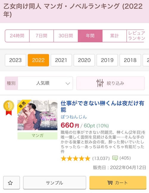 サイゾーウーマンカルチャー漫画レビュー過激セックスがすごいエロ漫画 カルチャー TLレビュー 過激セックスがすごいエロ漫画『続・仕事ができない榊くんは夜だけ有能』、TLマニアが熱狂レビュー! 2024/03/08 17:00 踊る毒林檎(TL原作者) (C)サイゾーウーマン TL漫画の原作や小説、シナリオ等を手掛ける踊る毒林檎さんが、大人気エロ漫画『続・仕事ができない榊くんは夜だけ有能』をレビューします。 目次 ・超超超大ヒット作品『仕事ができない榊くんは夜だけ有能』とは? ・『続・仕事ができない榊くんは夜だけ有能』、見どころは? ・自分まで榊くんに溺愛されている「先輩」になっていた! 超超超大ヒット作品『仕事ができない榊くんは夜だけ有能』とは? 初めましての方は初めまして、お馴染みの方はいつもありがとうございます。踊る毒林檎です。普段は主にTL漫画の原作や小説、シナリオ等のお仕事をさせていただいております。 趣味と実益を兼ねて、原稿を書いていない時間はひたすらTL漫画を読み漁っているTLマニアなのですが、そんな本日ご紹介するのはあの! ぽつねんじん大先生の『仕事ができない榊くんは夜だけ有能』の続編です(やったー!!)! その前に、前作『仕事ができない榊くんは夜だけ有能』のおさらいからはじめましょう。前作はDLsiteユーザーなら知らぬ者はいない、超超超大ヒット作品。24時間ランキング、年間ランキング、累計ランキング1位を総ナメした殿堂入りTL漫画になります。 2022年の年間ランキング1位の殿堂入りTL『仕事ができない榊くんは夜だけ有能』 DLsiteさんで販売されているTL漫画は、主に一次創作の「同人作品」で、何から何までフリーダムなのが特徴です。商業作品のようなレーベルカラーもレギュレーションもへったくれもないので、より過激で、より幅広いプレイが展開され、とにかくえっちなんですよ! モザイクも少なくて、「こんなところまで見せちゃって良いんですか!?」と、本業エロ書きの私が思わず目元を手で覆ってしまうほど。 『榊くん』も例に漏れず、商業では許されない体位や、過激な台詞、男性向けに多い断面図、榊くんのお尻や◎◎、△までバッチリ描かれていて、本当に、本当にすごいんです(語彙力低下中)!! そんなDLsiteユーザー待望の続編『続・仕事ができない榊くんは夜だけ有能』ですが、夜は5回、朝は1回と、相変わらず榊くんの夜(セックス)はすごかった(にっこり)!! 『続・仕事ができない榊くんは夜だけ有能』、見どころは「嫉妬えっち」 『続・仕事ができない榊くんは夜だけ有能』 前作。前髪で顔が隠れた、THE陰キャ! といった風貌で登場した榊くん。しかし榊くんは、先輩と付き合うことで、オタク味あふれるチェックのシャツを脱ぎ、まるで別人のように垢抜けていきます。そんな彼のBefore,Afterに、そして夜とのギャップに全読者が熱狂した記憶も新しいかと思われます。 今回は、そんな榊くんの前に、しごでき・お洒落・イケメン・陽キャの先輩の元カレが登場します。垢抜けてイケメン化しても、中身は残念男子のまま、根は陰キャな榊くん(かわいい)は、自分とはある意味正反対の元カレに嫉妬します。 そしてみんな大好き、嫉妬えっちに突入するのですが――濡れ場はもちろん、先輩とすれ違い、また陰キャに戻ってしまう榊くんも今作の見どころです。この辺り、恋愛初心者のぴゅあぴゅあさを眩しく思いつつも、夜とのギャップに戸惑うこと必至。 夜はあんなにイケイケなのに!! 先輩にえっちな言葉攻めしちゃうくせに!! ちん〇とか言わせちゃうくせに!! それなのにいつまでたっても抜けきらない、この童貞臭。まあ、そこが榊くんの魅力で、榊くんを榊くんたらしめているゆえんなのですが。よくよく見てみるとケンカ中の服や、エプロンが以前の陰キャ使用になっているんですよね、個人的にそこもツボでした。 自分まで榊くんに溺愛されている「先輩」になっていた! 次に、前回語り尽くせなかった「先輩」というヒロインの魅力を語らせてください。先輩って、つくづく嫌味がない大人女子で、とても共感しやすいキャラクターなんですよ。榊くんが恋しちゃうのも納得の性格の良さと美貌。スタイルも抜群。それなのに実は初心で、そんなギャップがとても可愛いんです。 続編を読んで改めて思いましたが、ぽつねんじん先生のすごいところは、いつの間にか読者をヒロインに共感させ、憑依させてしまうところです。気が付いた時、すっかり私はこの世界に入り込んでいて、自分まで美人で、仕事ができて、榊くんに溺愛されている「先輩」になっていた(笑)。 絶倫すぎる榊くんに「24歳の男の子の性欲ってあれが普通なの?」と悩み、怯える先輩。先輩と一緒に怯えながらも(憑依中)、頭の隅で、素の自分が「大丈夫です先輩。24歳なんてそんなもんです」とつっこみを入れたり(忙しい)。 そんな感じで読み進めて、ふと思いました。榊くんのような顔良し、体良し、性格良し、竿良し、持久力あり、テクあり、perfect! な激