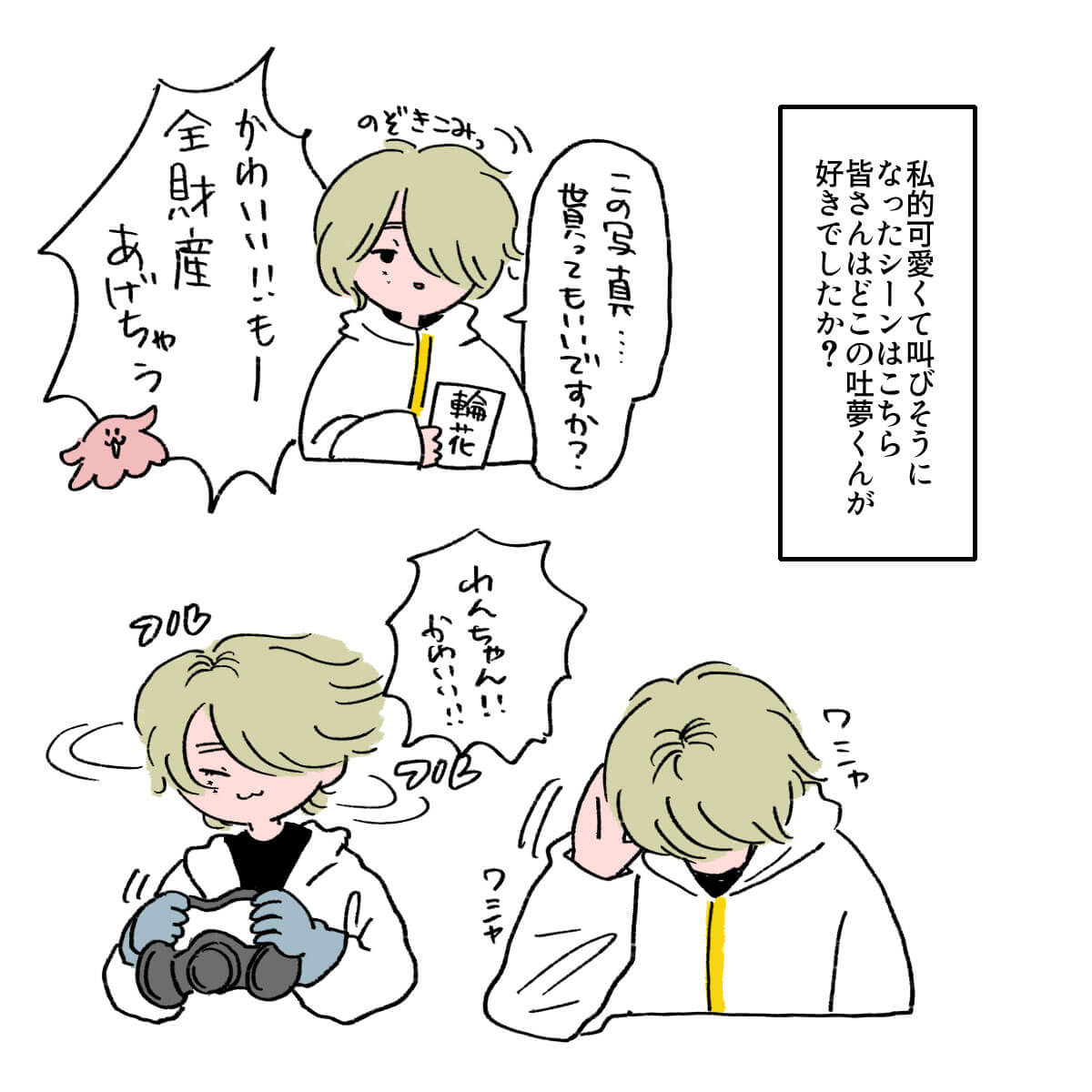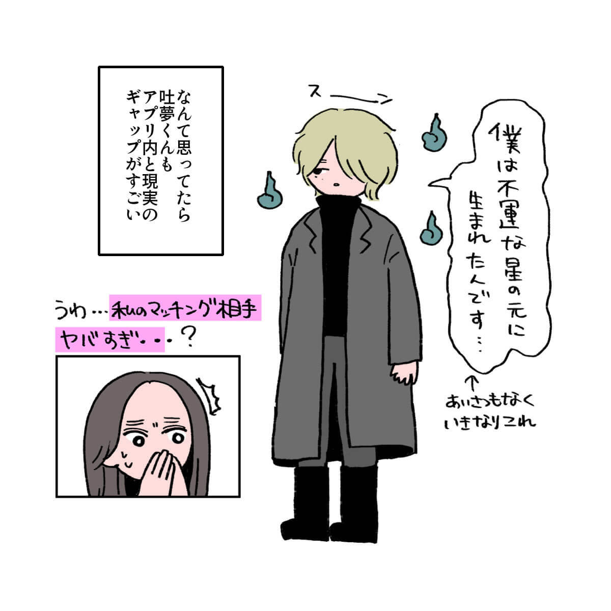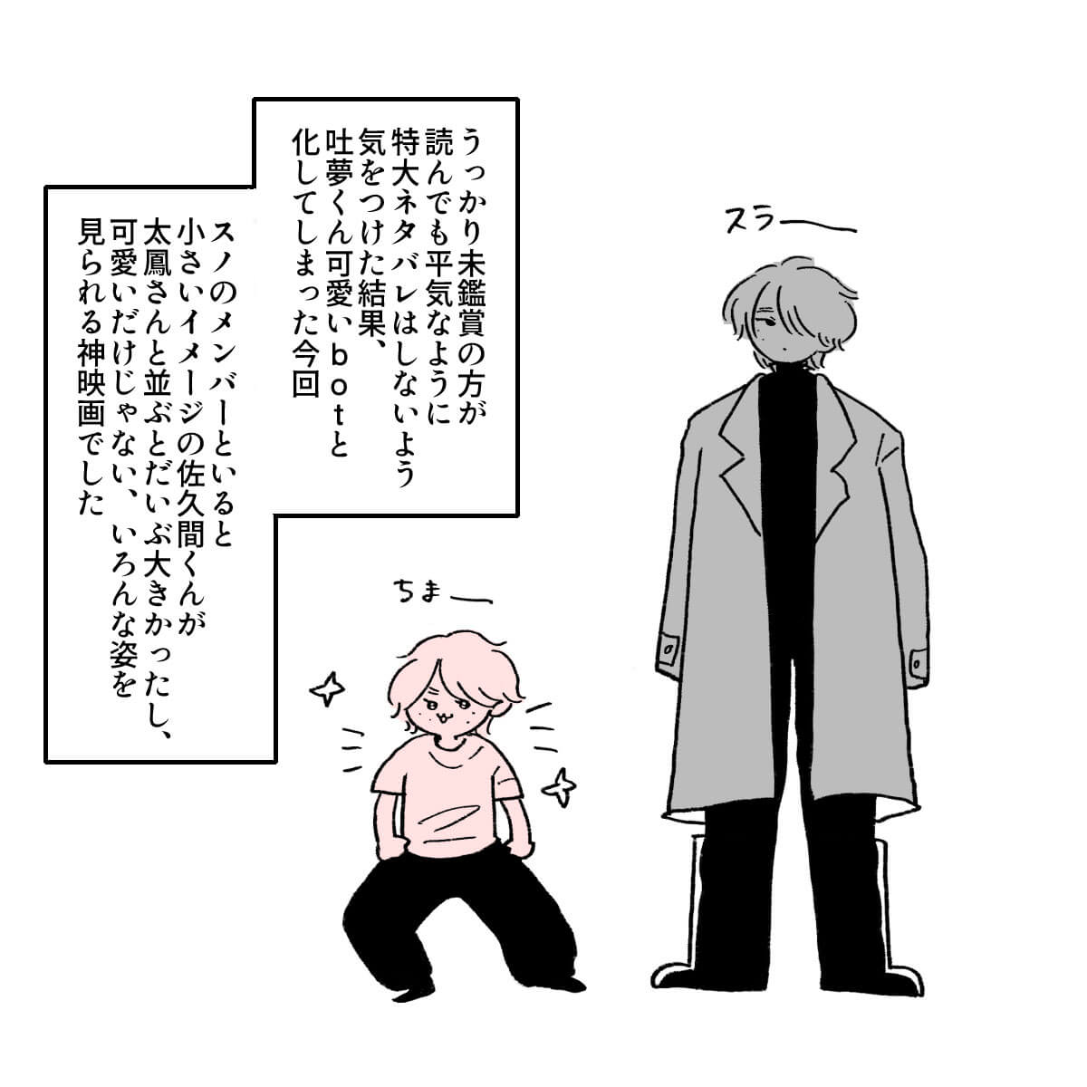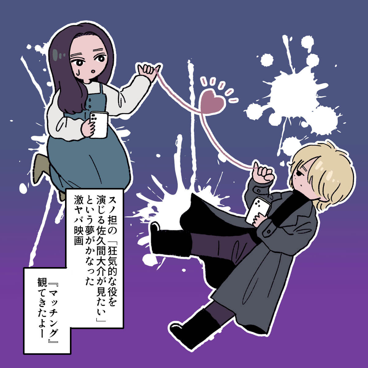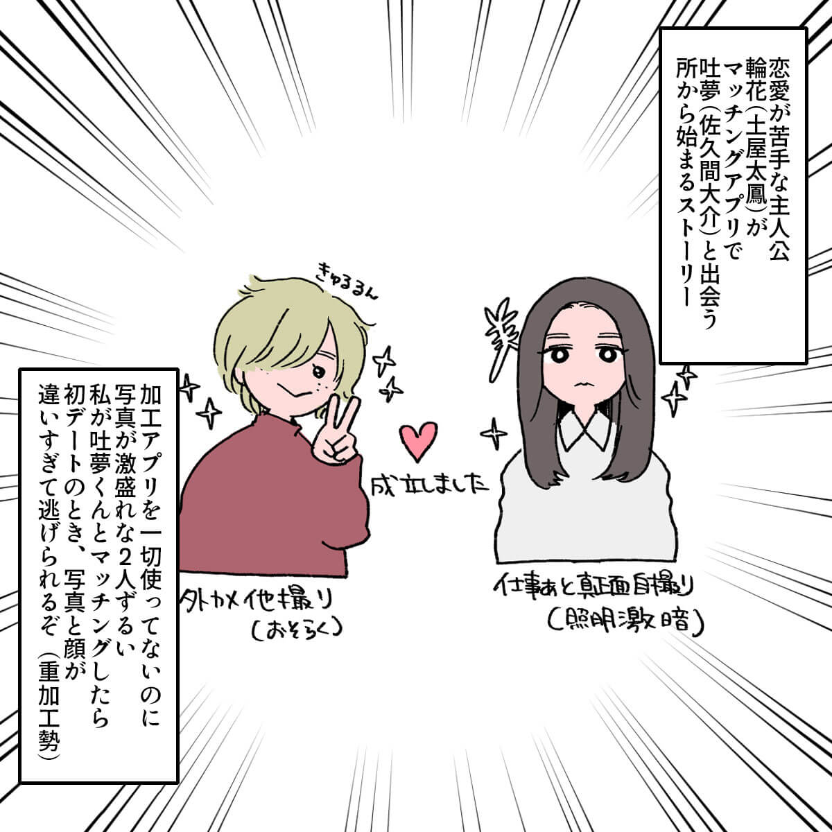 サイゾーウーマン男性アイドルSTARTO(旧ジャニーズ)Snow Man佐久間大介『マッチング』で佐久間が可愛いシーンとは? 男性アイドル [ドルオタ漫画家・竜田トキヒロの“推し事”見聞録]vol.47 映画『マッチング』、Snow Man・佐久間大介ファンが「可愛くて叫びそうになった」シーンとは? 2024/03/06 21:15 竜田トキヒロ(マンガ家) 佐久間大介竜田トキヒロの“推し事”見聞録Snow Man ――Twitterで日々、STARTO ENTERTAINMENT(旧ジャニーズ事務所)のタレントをはじめとしたイラストを投稿中のドルオタ漫画家・竜田トキヒロが、現場レポートからドラマや映画、番組レビューまで、“推し事”の様子をお届け! 今回は、土屋太鳳主演、Snow Man・佐久間大介出演映画『マッチング』をレビュー! この映画は、草なぎ剛主演映画『ミッドナイトスワン』(2020年9月25日公開)やHey!Say!JUMP・山田涼介主演の『サイレントラブ』(24年1月26日公開)を手掛けた内田英治氏が原作・脚本・監督を務めた完全オリジナルの新感覚サスペンス・スリラー作品。 マッチングアプリを題材に、“出会い”の裏に仕掛けられた恐怖を描いた物語で、ウェディングプランナーとして働く傍ら、プライベートでは恋愛音痴な主人公・唯島輪花を土屋太鳳が演じています。 また佐久間は、輪花とアプリでマッチングする狂気のストーカー・永山吐夢役で出演。そのほか、ロックバンド・RIZEのドラマーで俳優・金子ノブアキをはじめ、片山萌美、真飛聖、杉本哲太、斉藤由貴ら実力派キャスト陣が脇を固めています。 予告映像が解禁された時点から、ネット上では「こういう佐久間くんが見たかった!」「公開が待ち遠しい」と期待の声が上がっていた今作。実際に劇場に足を運んだ人からは「佐久間くんの演技がよかった」「吐夢に惹きつけられた」などと好意的な感想が寄せられており、映画レビューサイト「Filmarks」では「星3.7」と、まずまずの評価を得ています(3月6日午後7時時点)。 この記事では、佐久間が劇中でどんな演技を見せていたのか、イラストで紹介していきます! ※以下、映画のネタバレを含みますのでご注意ください。 目次 ・Snow Man・佐久間大介のギャップがすごい ・佐久間大介の演技と脚本が「マッチング大成功」! ・佐久間担的、吐夢の可愛いシーン Snow Man・佐久間大介、マッチングアプリ内と現実のギャップがすごい Snow Man・佐久間大介の演技と内田監督の脚本が「マッチング大成功」! 佐久間担的、吐夢が「可愛くて叫びそうになった」シーンとは? ★これまでの連載記事はこちらから Snow Man・佐久間大介出演『マッチング』、今年のSTARTO勢映画4作でトップに 女優・土屋太鳳が主演を務め、Snow Manの佐久間大介がメインキャストの1人として出演している映画『マッチング』が、2月23日に公開初日を迎えた。26日発表の国...サイゾーウーマン2024.02.27 Snow Man年越し生配信、「応援しよう」とファンに決意させた目黒蓮の“言葉”――Twitterで日々、STARTO ENTERTAINMENT(旧ジャニーズ事務所)のタレントをはじめとしたイラストを投稿中のドルオタ漫画家・竜田トキヒロが、現場レポー...サイゾーウーマン2024.01.06 竜田トキヒロ(マンガ家) 漫画家、イラストレーター。育休中に執筆したエッセイ漫画でKADOKAWAコミックエッセイ大賞受賞。Ameba、ライブドア公式ブロガーを経たのち現在はインフルエンサーとしてエンタメ、オタクに特化した漫画やイラストや体験ルポ等幅広く執筆。著書『コミュ障母さんとごきげん娘』(KADOKAWA) X:@musumenuma 最終更新:2024/03/06 21:15 気になった方はぜひ劇場へ 関連記事 Snow Man・岩本照&佐久間大介、「服につけてる」互いの“匂い”の印象語る嵐・松本潤は「すっごい褒めてくれた」――Snow Man・佐久間大介ら後輩がエピソード披露宮舘涼太の完璧な「マツケンサンバ」、佐久間大介の“残像”――『それスノ』ダンス企画プレイバックSnow Man・佐久間大介出演『マッチング』、今年のSTARTO勢映画4作でトップにSnow Man・佐久間大介、VTuber・星街すいせいとの“交際疑惑”否定もファン幻滅 次の記事 シゲアキの“プロ意識”に称賛の声上がるワケ >