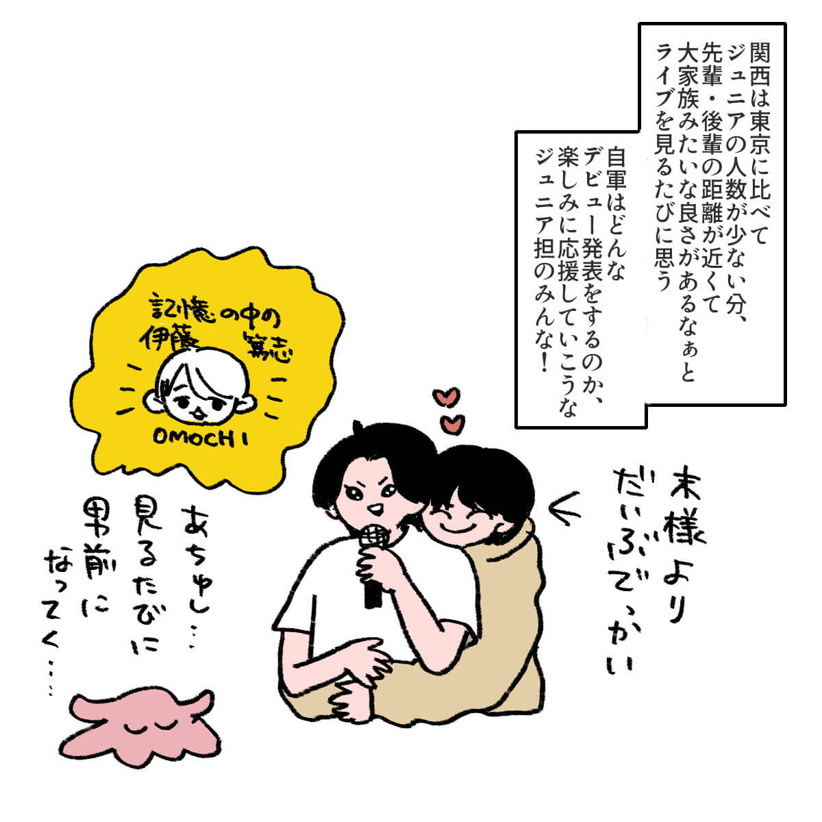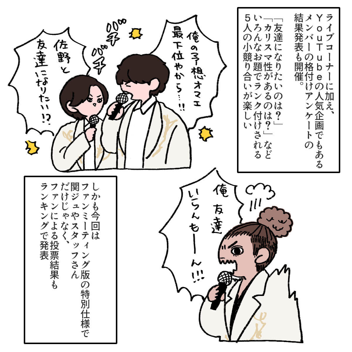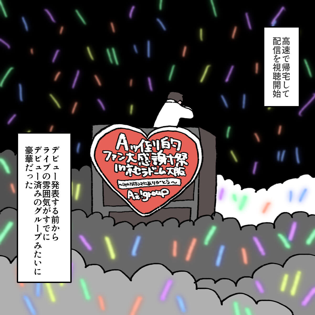 サイゾーウーマン男性アイドルSTARTO(旧ジャニーズ)Aぇ! groupAぇファンミのイラストレポ 男性アイドル [ドルオタ漫画家・竜田トキヒロの“推し事”見聞録]vol.49 Aぇ! group『Aッ倒的ファン大感謝祭』イラストレポ、関西ジュニアはまるで“大家族”! 2024/03/27 21:00 竜田トキヒロ(マンガ家) Aぇ! group竜田トキヒロの“推し事”見聞録ジュニア ――Twitterで日々、STARTO ENTERTAINMENT(旧ジャニーズ事務所)のタレントをはじめとしたイラストを投稿中のドルオタ漫画家・竜田トキヒロが、現場レポートからドラマや映画、番組レビューまで、“推し事”の様子をお届け! 今回は、3月16、17日に京セラドーム大阪で開催され、16日には「FAMILY CLUB online」で生配信も実施された、関西ジュニア・Aぇ! groupの単独イベント『Aぇ! group Aッ倒的ファン大感謝祭 in 京セラドーム大阪』に注目! デビュー前のジュニアが単独でドームイベントや公演を行うのは、2006年にCDデビュー前のアーティストとして史上初の東京ドーム公演を開催したKAT-TUN以来ということで、何らかの発表があるのではないかと、開催前からファンが期待を寄せていたこのイベント。 その思いに応えるかのごとく、16日の公演中、メンバーの口から5月15日に「《A》BEGINNING」という楽曲で、ユニバーサルミュージックからCDデビューすることが明かされました。 この記事では、そんなメモリアルな公演の様子を、イラストで振り返ります! 目次 ・Aぇ! group、ライブの雰囲気がデビュー組みたい!? ・デビューのお祝い動画で感じた関西の絆 ・“大家族”関西ジュニアの距離の近さ Aぇ! group、ファンミーティングのライブの雰囲気がデビュー組みたい!? なにわ男子にWEST.、SUPER EIGHTも……Aぇ! groupへのデビューのお祝い動画で感じた関西の絆 Aぇ! groupのファンミーティングに見た、“大家族”関西ジュニアの距離の近さ ★これまでの連載記事はこちらから 【ジャニオタマンガ】Aぇ! groupは「高スキル集団」! キャラの濃い6人の個性とは?――Twitterで日々、ジャニーズタレントにまつわるイラストを投稿中のジャニオタ漫画家・竜田トキヒロが、現場レポートからドラマや映画、番組レビューまで、“推し事”の様子を...サイゾーウーマン2023.07.05 竜田トキヒロ(マンガ家) 漫画家、イラストレーター。育休中に執筆したエッセイ漫画でKADOKAWAコミックエッセイ大賞受賞。Ameba、ライブドア公式ブロガーを経たのち現在はインフルエンサーとしてエンタメ、オタクに特化した漫画やイラストや体験ルポ等幅広く執筆。著書『コミュ障母さんとごきげん娘』(KADOKAWA) X:@musumenuma 最終更新:2024/03/27 21:00 関連記事 【ジャニオタマンガ】Aぇ! groupは「高スキル集団」! キャラの濃い6人の個性とは?Aぇ! group『Aッ倒的ファン大感謝祭』レポ――オタクの涙腺が壊れた瞬間とは?ジュニア公式TikTok「いいね」数ランキング、11~20位! Aぇ! groupが伯井太陽を上回る【2024年3月最新】Aぇ! group、福本大晴と“決別”? 配信舞台でのエールに賛否両論西川貴教、Aぇ! group・福本大晴の脱退に言及? ラジオで「全力で応援する」とエール 次の記事 『大奥』が描かない、倫子の幸福だった史実 >