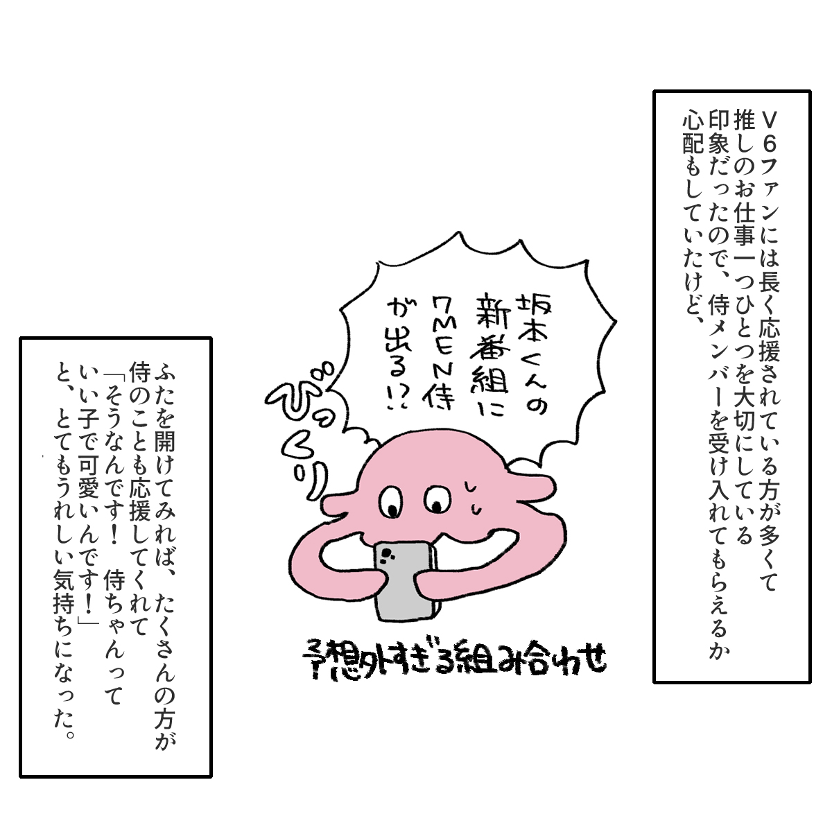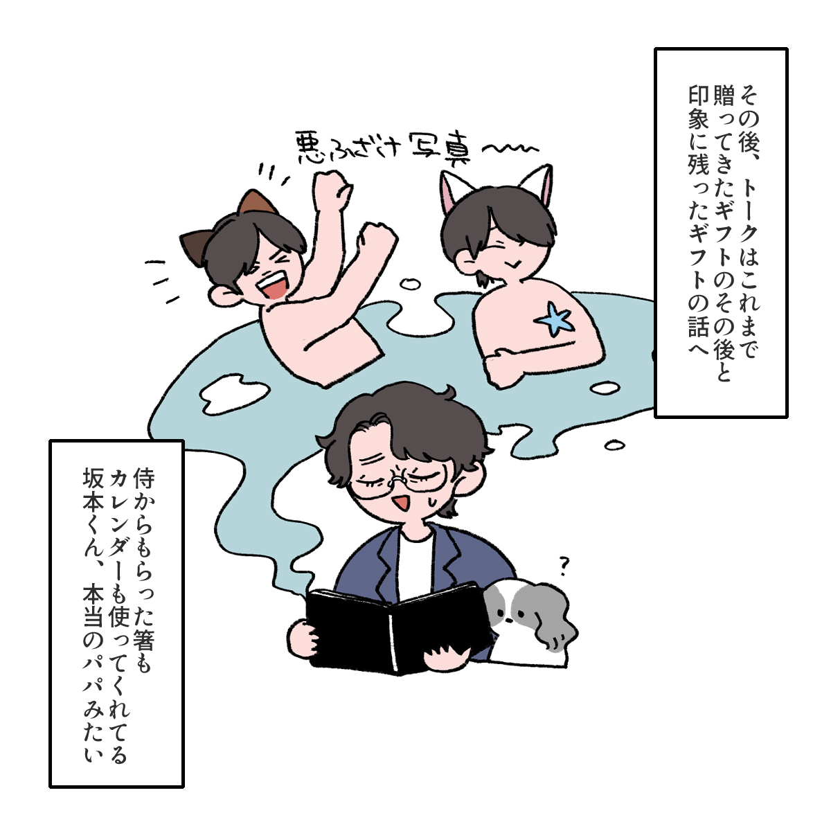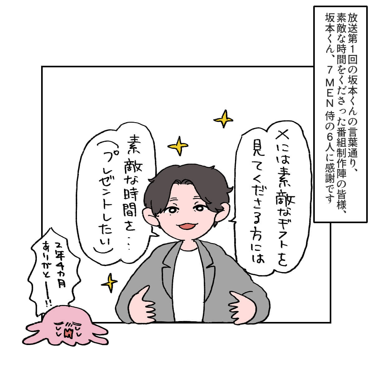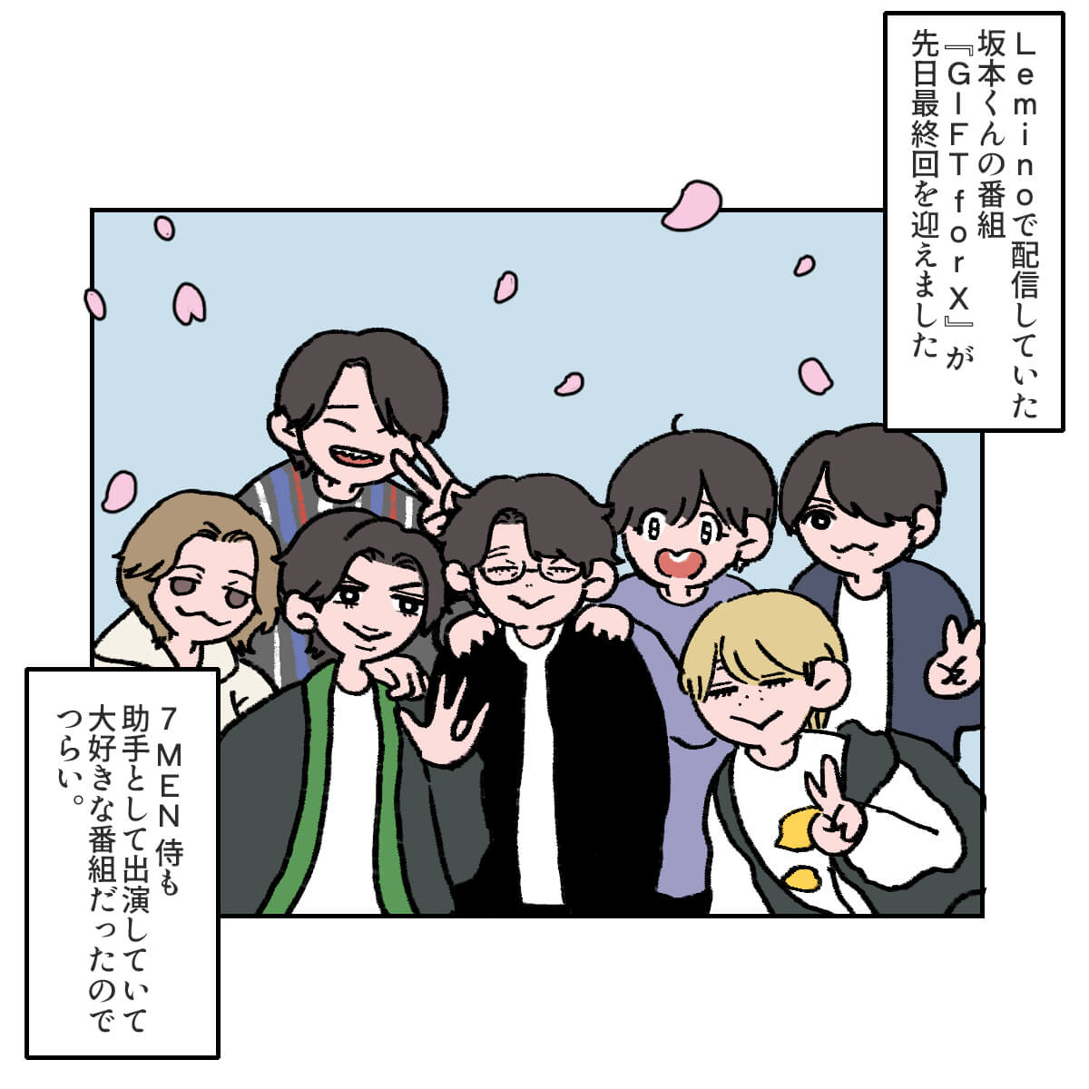 サイゾーウーマン男性アイドルSTARTO(旧ジャニーズ)ジュニア7 MEN 侍坂本が7 MENに送った“褒め言葉”とは 男性アイドル [ドルオタ漫画家・竜田トキヒロの“推し事”見聞録]vol.50 坂本昌行が7 MEN 侍に送った“何よりの褒め言葉”とは? 『GIFT for X』最終回イラストレポ 2024/04/03 21:00 竜田トキヒロ(マンガ家) 坂本昌行7 MEN 侍竜田トキヒロの“推し事”見聞録 ――Twitterで日々、STARTO ENTERTAINMENT(旧ジャニーズ事務所)のタレントをはじめとしたイラストを投稿中のドルオタ漫画家・竜田トキヒロが、現場レポートからドラマや映画、番組レビューまで、“推し事”の様子をお届け! 今回は、3月をもって終了した、20th Century・坂本昌行の冠バラエティ番組『坂本昌行 GIFT for X』SEASON 2(映像配信サービス・Leminoにて配信)をプレイバック! 同番組は、坂本が今ギフトをあげたいゲスト(X)のために、事務所の後輩であるジュニア内ユニット・7 MEN 侍の中村嶺亜、菅田琳寧、本高(正しくははしごだか)克樹、佐々木大光、今野大輝、矢花黎の6人と一緒にギフトを手作りするというコンセプトで、2021年11月9日から映像配信サービス・ひかりTVで先行配信がスタート。同28日から22年3月20日までテレビ東京系でも地上波放送されました。 そして、昨年4月より、映像配信サービス・Leminoで『SEASON 2』が配信されていましたが、3月19、26日の2週にわたって放送された最終回スペシャルをもって、番組は完結。 この記事では、7 MEN 侍ファンが、最終回の模様と番組終了を迎えた今の気持ちを、イラストで紹介していきます。 目次 ・『坂本昌行 GIFT for X』2年半の歴史に涙 ・坂本昌行&7 MEN 侍、食事会は3人だけ!? ・坂本昌行が7 MEN 侍へ送った、“何よりの褒め言葉” 『坂本昌行 GIFT for X』最終回スぺシャルで、2年半の歴史に涙 坂本昌行&7 MEN 侍、食事会は3人だけで開催!? 坂本昌行が7 MEN 侍へ送った、“何よりの褒め言葉” ★これまでの連載記事はこちらから 【ジャニオタマンガ】坂本昌行と7 MEN 侍がまるで“親鳥とヒヨコ”! 『GIFT for X』の見どころ――Twitterで日々、ジャニーズタレントにまつわるイラストを投稿中のジャニオタ漫画家・竜田トキヒロが、現場レポートからドラマや映画、番組レビューまで、“推し事”の様子を...サイゾーウーマン2023.10.11 【ジャニオタマンガ】井ノ原快彦社長に思わず感謝? ジャニーズJr.・7 MEN 侍『サマパラ』レポ――Twitterで日々、ジャニーズタレントにまつわるイラストを投稿中のジャニオタ漫画家・竜田トキヒロが、現場レポートからドラマや映画、番組レビューまで、“推し事”の様子を...サイゾーウーマン2023.08.02 【ジャニオタマンガ】中村嶺亜は「不動の皇帝」矢花黎は「軍師」! 7 MEN 侍ステマシート――Twitterで日々、ジャニーズタレントにまつわるイラストを投稿中のジャニオタ漫画家・竜田トキヒロが、現場レポートからドラマや映画、番組レビューまで、“推し事”の様子を...サイゾーウーマン2023.09.06 竜田トキヒロ(マンガ家) 漫画家、イラストレーター。育休中に執筆したエッセイ漫画でKADOKAWAコミックエッセイ大賞受賞。Ameba、ライブドア公式ブロガーを経たのち現在はインフルエンサーとしてエンタメ、オタクに特化した漫画やイラストや体験ルポ等幅広く執筆。著書『コミュ障母さんとごきげん娘』(KADOKAWA) X:@musumenuma 最終更新:2024/04/03 21:00 アーカイブはLeminoでまだ見られるよ 関連記事 【ジャニオタマンガ】坂本昌行と7 MEN 侍がまるで“親鳥とヒヨコ”! 『GIFT for X』の見どころ【ジャニオタマンガ】中村嶺亜は「不動の皇帝」矢花黎は「軍師」! 7 MEN 侍ステマシート【ジャニオタマンガ】井ノ原快彦社長に思わず感謝? ジャニーズJr.・7 MEN 侍『サマパラ』レポAぇ! group『Aッ倒的ファン大感謝祭』イラストレポ、関西ジュニアはまるで“大家族”!Snow Man・向井康二との絆に感動、『木7◎×部』に元関西ジュニア・金内柊真登場! 次の記事 【イオン】異色すぎるディスカウントストア「パレッテ」 >