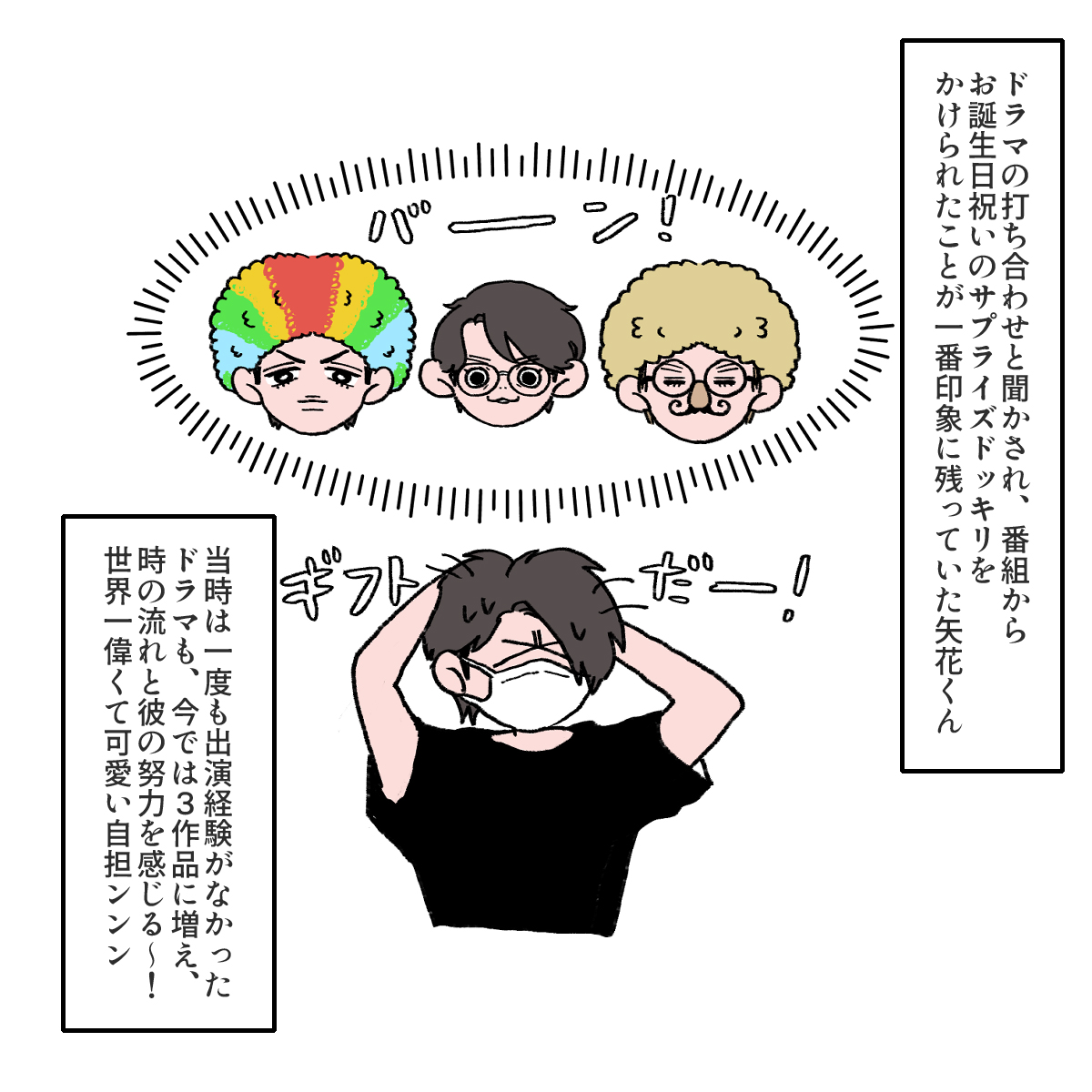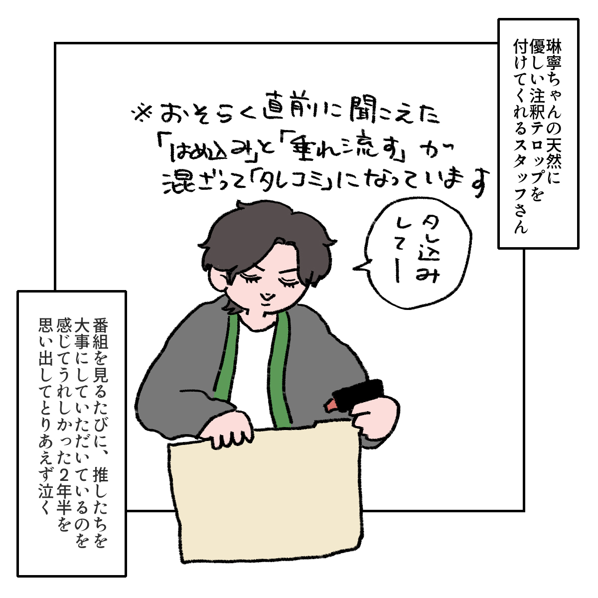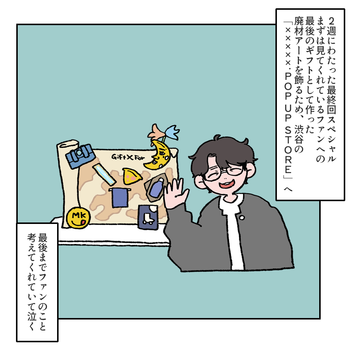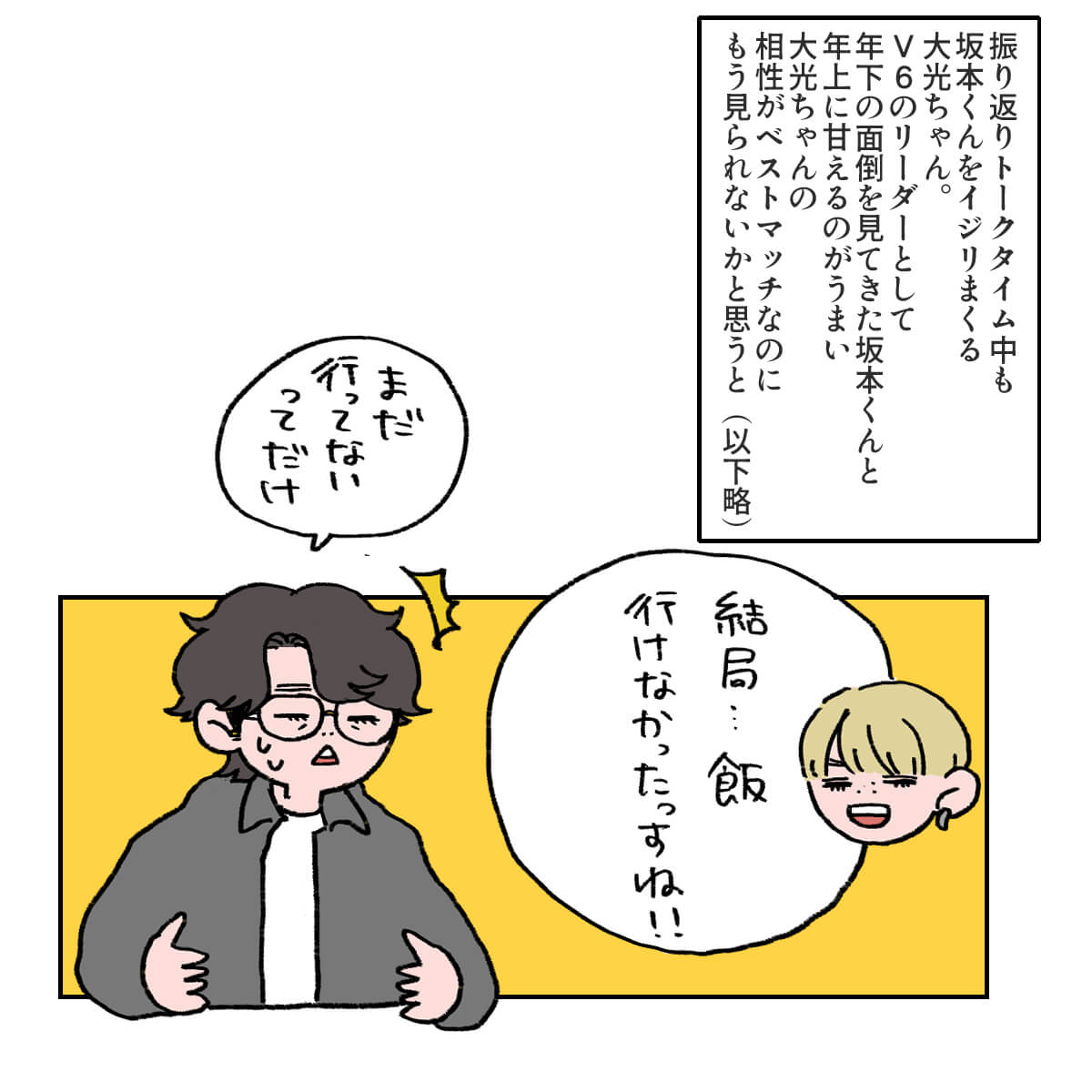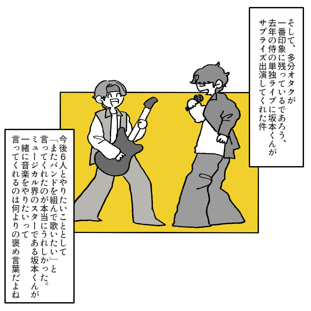 サイゾーウーマン男性アイドルSTARTO(旧ジャニーズ)ジュニア7 MEN 侍坂本が7 MENに送った“褒め言葉”とは 男性アイドル [ドルオタ漫画家・竜田トキヒロの“推し事”見聞録]vol.50 坂本昌行が7 MEN 侍に送った“何よりの褒め言葉”とは? 『GIFT for X』最終回イラストレポ 2024/04/03 21:00 竜田トキヒロ(マンガ家) 坂本昌行7 MEN 侍竜田トキヒロの“推し事”見聞録 ――Twitterで日々、STARTO ENTERTAINMENT(旧ジャニーズ事務所)のタレントをはじめとしたイラストを投稿中のドルオタ漫画家・竜田トキヒロが、現場レポートからドラマや映画、番組レビューまで、“推し事”の様子をお届け! 今回は、3月をもって終了した、20th Century・坂本昌行の冠バラエティ番組『坂本昌行 GIFT for X』SEASON 2(映像配信サービス・Leminoにて配信)をプレイバック! 同番組は、坂本が今ギフトをあげたいゲスト(X)のために、事務所の後輩であるジュニア内ユニット・7 MEN 侍の中村嶺亜、菅田琳寧、本高(正しくははしごだか)克樹、佐々木大光、今野大輝、矢花黎の6人と一緒にギフトを手作りするというコンセプトで、2021年11月9日から映像配信サービス・ひかりTVで先行配信がスタート。同28日から22年3月20日までテレビ東京系でも地上波放送されました。 そして、昨年4月より、映像配信サービス・Leminoで『SEASON 2』が配信されていましたが、3月19、26日の2週にわたって放送された最終回スペシャルをもって、番組は完結。 この記事では、7 MEN 侍ファンが、最終回の模様と番組終了を迎えた今の気持ちを、イラストで紹介していきます。 目次 ・『坂本昌行 GIFT for X』2年半の歴史に涙 ・坂本昌行&7 MEN 侍、食事会は3人だけ!? ・坂本昌行が7 MEN 侍へ送った、“何よりの褒め言葉” 『坂本昌行 GIFT for X』最終回スぺシャルで、2年半の歴史に涙 坂本昌行&7 MEN 侍、食事会は3人だけで開催!? 坂本昌行が7 MEN 侍へ送った、“何よりの褒め言葉” ★これまでの連載記事はこちらから 【ジャニオタマンガ】坂本昌行と7 MEN 侍がまるで“親鳥とヒヨコ”! 『GIFT for X』の見どころ――Twitterで日々、ジャニーズタレントにまつわるイラストを投稿中のジャニオタ漫画家・竜田トキヒロが、現場レポートからドラマや映画、番組レビューまで、“推し事”の様子を...サイゾーウーマン2023.10.11 【ジャニオタマンガ】井ノ原快彦社長に思わず感謝? ジャニーズJr.・7 MEN 侍『サマパラ』レポ――Twitterで日々、ジャニーズタレントにまつわるイラストを投稿中のジャニオタ漫画家・竜田トキヒロが、現場レポートからドラマや映画、番組レビューまで、“推し事”の様子を...サイゾーウーマン2023.08.02 【ジャニオタマンガ】中村嶺亜は「不動の皇帝」矢花黎は「軍師」! 7 MEN 侍ステマシート――Twitterで日々、ジャニーズタレントにまつわるイラストを投稿中のジャニオタ漫画家・竜田トキヒロが、現場レポートからドラマや映画、番組レビューまで、“推し事”の様子を...サイゾーウーマン2023.09.06 竜田トキヒロ(マンガ家) 漫画家、イラストレーター。育休中に執筆したエッセイ漫画でKADOKAWAコミックエッセイ大賞受賞。Ameba、ライブドア公式ブロガーを経たのち現在はインフルエンサーとしてエンタメ、オタクに特化した漫画やイラストや体験ルポ等幅広く執筆。著書『コミュ障母さんとごきげん娘』(KADOKAWA) X:@musumenuma 最終更新:2024/04/03 21:00 アーカイブはLeminoでまだ見られるよ 関連記事 【ジャニオタマンガ】坂本昌行と7 MEN 侍がまるで“親鳥とヒヨコ”! 『GIFT for X』の見どころ【ジャニオタマンガ】中村嶺亜は「不動の皇帝」矢花黎は「軍師」! 7 MEN 侍ステマシート【ジャニオタマンガ】井ノ原快彦社長に思わず感謝? ジャニーズJr.・7 MEN 侍『サマパラ』レポAぇ! group『Aッ倒的ファン大感謝祭』イラストレポ、関西ジュニアはまるで“大家族”!Snow Man・向井康二との絆に感動、『木7◎×部』に元関西ジュニア・金内柊真登場! 次の記事 【イオン】異色すぎるディスカウントストア「パレッテ」 >