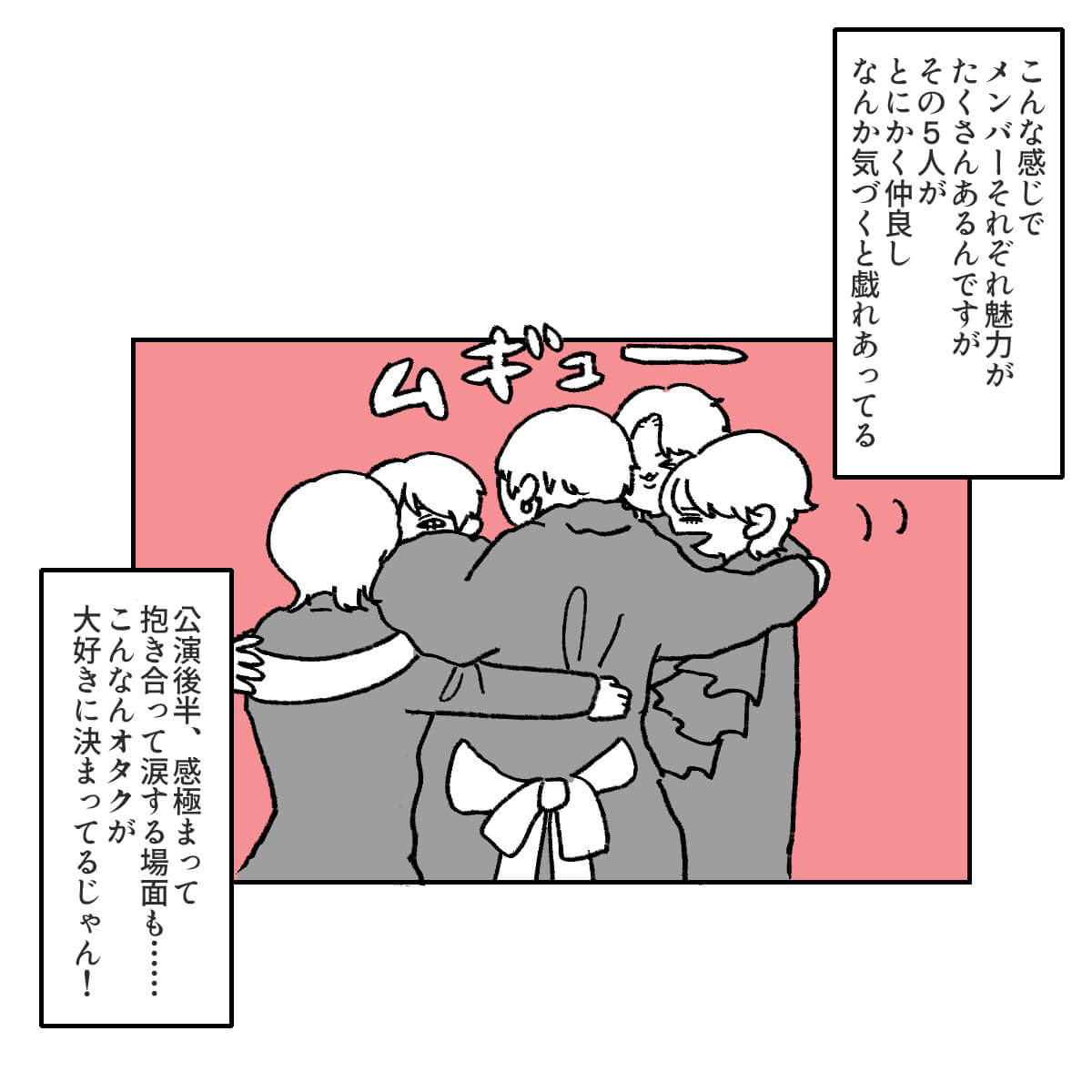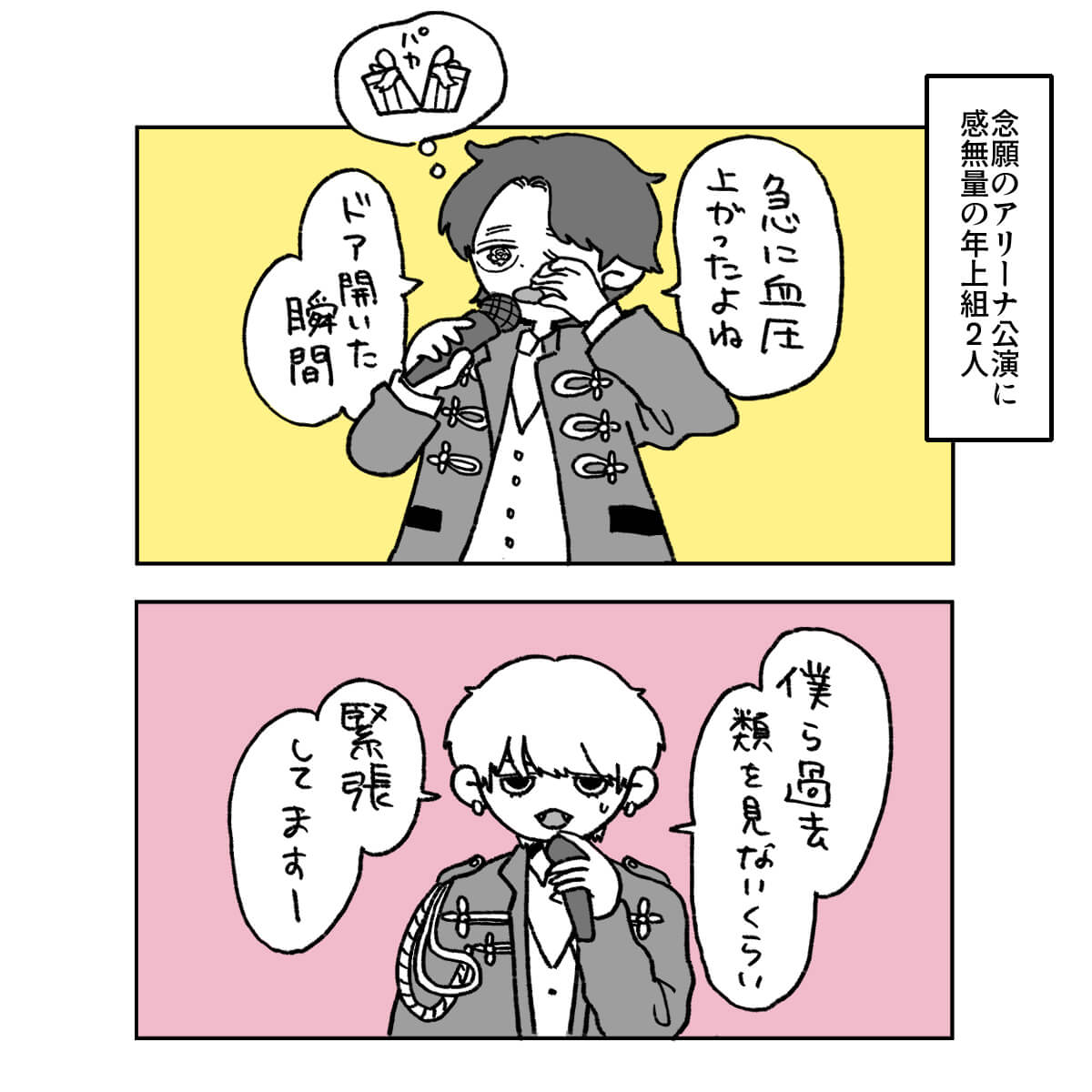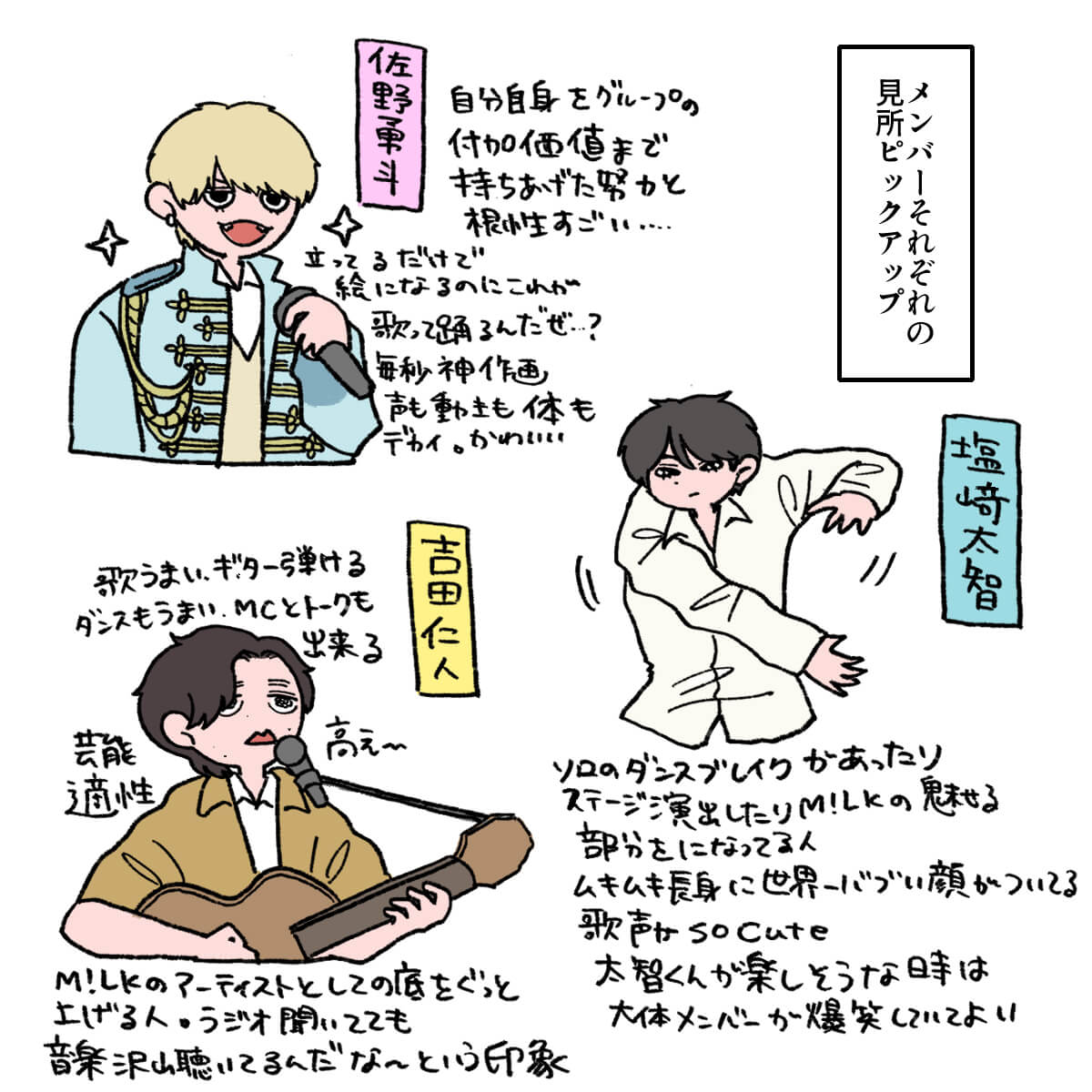 サイゾーウーマン男性アイドルM!LK、初アリーナ公演ライブ映像レビュー 男性アイドル [ドルオタ漫画家・竜田トキヒロの“推し事”見聞録]vol.52 M!LK・佐野勇斗の涙は5億で売れる! 初アリーナ公演ライブ映像レビュー 2024/04/17 21:00 竜田トキヒロ(マンガ家) BE:FIRST竜田トキヒロの“推し事”見聞録 ――Twitterで日々、STARTO ENTERTAINMENT(旧ジャニーズ事務所)のタレントをはじめとしたイラストを投稿中のドルオタ漫画家・竜田トキヒロが、現場レポートからドラマや映画、番組レビューまで、“推し事”の様子をお届け! 今回は、動画配信サービス・U-NEXTで配信されている5人組ダンスボーカルグループ・M!LKのライブ映像『M!LK 1st ARENA “HAPPY! HAPPY! HAPPY!”』レビュー! スターダストプロモーションに所属する佐野勇斗、塩﨑太智、曽野舜太、山中柔太朗、吉田仁人からなるM!LK。新人、若手男性俳優、タレントで構成されたアーティスト集団、演劇集団の「EBiDAN」(エビダン、恵比寿学園男子部の略)の一員としても活動中です。 『M!LK 1st ARENA “HAPPY! HAPPY! HAPPY!”』は、昨年10月22日に行われた彼らにとって初の単独アリーナ公演で、チケットは即日完売。約1万2千人の観客を沸かせた、メンバーにとってもファンにとっても思い入れのある公演となりました。 この記事では、ライブでのメンバー5人の魅力をイラストでご紹介していきます! 目次 ・M!LK初のアリーナ公演が「乙女ゲーム」!? ・新規ファンが一番好きなパフォーマンス ・とにかく仲良しな、メンバー5人の魅力 M!LK初のアリーナ公演、オープニングが「乙女ゲーム」みたい!? MilKの新規ファンが一番好きなパフォーマンスとは? とにかく仲良しな、メンバー5人の魅力とは? ★これまでの連載記事はこちらから 『冒険少年』M!LK・佐野勇斗の“めめ担”ムーブに、Snow Man・向井康二がマウント?――Twitterで日々、STARTO ENTERTAINMENT(旧ジャニーズ事務所)のタレントをはじめとしたイラストを投稿中のドルオタ漫画家・竜田トキヒロが、現場レポー...サイゾーウーマン2024.02.07 EBiDANの地上波初冠レギュラー番組、超特急・カイのコメントが光る!――Twitterで日々、STARTO ENTERTAINMENT(旧ジャニーズ事務所)のタレントをはじめとしたイラストを投稿中のドルオタ漫画家・竜田トキヒロが、現場レポー...サイゾーウーマン2024.01.17 竜田トキヒロ(マンガ家) 漫画家、イラストレーター。育休中に執筆したエッセイ漫画でKADOKAWAコミックエッセイ大賞受賞。Ameba、ライブドア公式ブロガーを経たのち現在はインフルエンサーとしてエンタメ、オタクに特化した漫画やイラストや体験ルポ等幅広く執筆。著書『コミュ障母さんとごきげん娘』(KADOKAWA) X:@musumenuma 最終更新:2024/04/17 21:00 気になった方はぜひU-NEXTへ! 関連記事 『冒険少年』M!LK・佐野勇斗の“めめ担”ムーブに、Snow Man・向井康二がマウント?EBiDANの地上波初冠レギュラー番組、超特急・カイのコメントが光る!BE:FIRST・SOTAに天使と悪魔が同居!? ライブドキュメンタリー『BE:the ONE』レビュー坂本昌行が7 MEN 侍に送った“何よりの褒め言葉”とは? 『GIFT for X』最終回イラストレポAぇ! group『Aッ倒的ファン大感謝祭』イラストレポ、関西ジュニアはまるで“大家族”! 次の記事 「BE:FIRSTと嵐は違う」ファン公言の大島美幸、“推し活スタイル”の違い語り反響 >