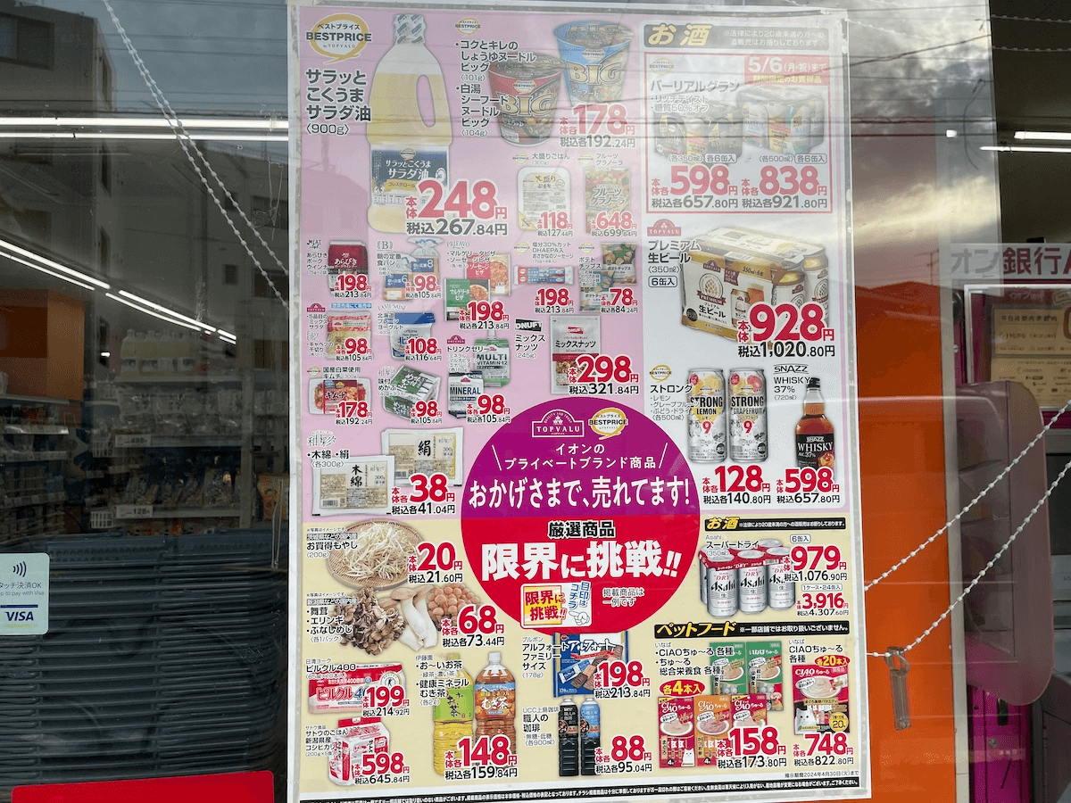 サイゾーウーマン暮らしトレンド閉店ラッシュ【イオン】系列ストア「アコレ」 暮らし 話題のスーパー探訪 閉店ラッシュ【イオン】ディスカウントストア「アコレ」、買い物してわかった弱点とは? 2024/04/23 19:00 サイゾーウーマン編集部 イオン 外観がとても控えめなアコレ(写真:サイゾーウーマン) 2024年4月現在、96店舗を展開するディスカウントストア「アコレ」。イオングループのストアですが、このところ閉店が相次いでいます。実際に店舗に行って、理由を考察してきました。 目次 ・【アコレ】とは? ・【アコレ】実際に買い物してみた ・【アコレ】「ビッグ・エー」に置き換わっていく? 【アコレ】とは? イオングループの株式会社ビッグ・エーが運営する小型のディスカウントストア「アコレ」。08年9月に1号店をオープンし、21年3月にディスカウントストアを運営する株式会社ビッグ・エーへ店舗事業が承継されました。 アコレの公式サイトはなく、ビッグ・エーの公式サイトが兼任しているよう。同サイトを確認すると「ビッグ・エーのコンセプト」は、「安全・新鮮な美味しさをいつでもお安く!」「日本の農業・漁業 畜産業を応援」「ビッグ・エー独自の商品開発で高品質と低価格を両立」とのこと。 アコレはこのところ各地で閉店が続いていて、ネット上でも閉店ラッシュとにわかにささやかれています。 【アコレ】実際に利用してみた アコレの外観(写真:サイゾーウーマン) 大手企業イオンの系列にありながら、なぜ閉店が相次いでいるのか? 実際に店舗を訪れてみました。 土曜の夕方4時に行くと、子連れの親子、大学生風の男性、高齢者の姿などにぎわっています。店内は若干照明が暗めに感じましたが、まったく問題ない程度。店内の広さは、やや大きめのコンビニといった印象です。 売り場や陳列の様子などを含め、イオン系列で絶好調の小型スーパー「まいばすけっと」と重なります。 イオンのディスカウントストア用PBが豊富! 売り場には、イオンのPB「トップバリュ」商品はもちろんのこと、イオンのディスカウントストア(DS)でしか見かけないPB「和日彩々」も。 「和日彩々」は同じくイオンのDS「ザ・ビッグ」や「パレッテ」でも流通しています。 同PBの小粒納豆は62.64円(40g×3個、たれ・からし抜き)で、「トップバリュ」の極小粒納豆73.44円(50g×3個)より10円以上も安価! 同じく「和日彩々」の絹豆腐73.44円(150g×3個)はよく売れていました。 同PBの味付めかぶは105.84円(40g×3個)。売れ筋の商品のようだったので購入しましたが、おいしかったです。 和日彩々の味付けめかぶ105.84円(40g×3個)(写真:サイゾーウーマン) このほか、「TASEAS」もイオンのDS専用PBかと思われます。「TASEAS」の「4種のサラダ豆」は95.04円、製造は日本レトルトフーズ株式会社。 4種のサラダ豆95.04円(写真:サイゾーウーマン) そのほか、DSのPB「Easy to Use」のレトルトカレーや冷凍ほうれん草、同じくDSのPB「LA VIE SAINE」の牛乳(181.44円)はトップバリュの牛乳も並ぶ中でよく売れていました。 トップバリュのキムチが人気で品薄 チルドコーナーはトップバリュ商品が豊富。売れ筋の様子だったトップバリュのかに風味かまぼこ105.84円も、実際に食べてみたところ、おいしかったです。見た目よりボリューム感がありました。 かに風味かまぼこ105.84円(写真:サイゾーウーマン) トップバリュのスモークタン切り落とし235.44円は、コンビニで買うスモークタンより量が多く、味も遜色なくて満足度◎。 スモークタン切り落とし235.44円(写真:サイゾーウーマン) そのほか、トップバリュの「国産白菜使用キムチ」192.24円はかなり人気のようで、他メーカーのキムチが並ぶ中でも明らかに品薄でした! 「限界に挑戦!!」のもやしは21.60円 野菜は総じて普通価格で、例えばミニトマトのパックが278.64円、ピーマン袋入りが159.84円。バナナは106.92円。入店すぐに展開されていたゴールドキウイはバラ170.64円です。目を引いたのは、「限界に挑戦!!」と赤い字で強調されていた「お買い得もやし」21.60円。安いものもあれば、一般的なものもあるといったところでしょうか。 魚の種類はかなり少なく、まいばすけっとで販売されているのと同じようなマグロの刺し身、サバの切り身など。肉は意外にもトップバリュの「うまみ和豚」の扱いがありませんでしたが、時間帯によるのかもしれません。 冷凍コーナーは、まいばすけっとやザ・ビッグと同じようにアイスが格安です。 「イトーパン」の総菜パンが豊富 総菜コーナーは一人用サイズの中華サラダやひじき煮やお弁当など、まいばすけっとによく似たラインナップと価格。店内調理はしていません。 パンは「イトーパン」の総菜パンが棚を占めていたのが印象的。ウインナーパン(ケチャップ)105.84円をはじめ、どれも手頃です。 【アコレ】「ビッグ・エー」に置き換わっていく? 店頭に張り出されたチラシ(写真:サイゾーウーマン) 今回、アコレを初利用して思ったのは、「ザ・ビッグかビッグ・エーでよ