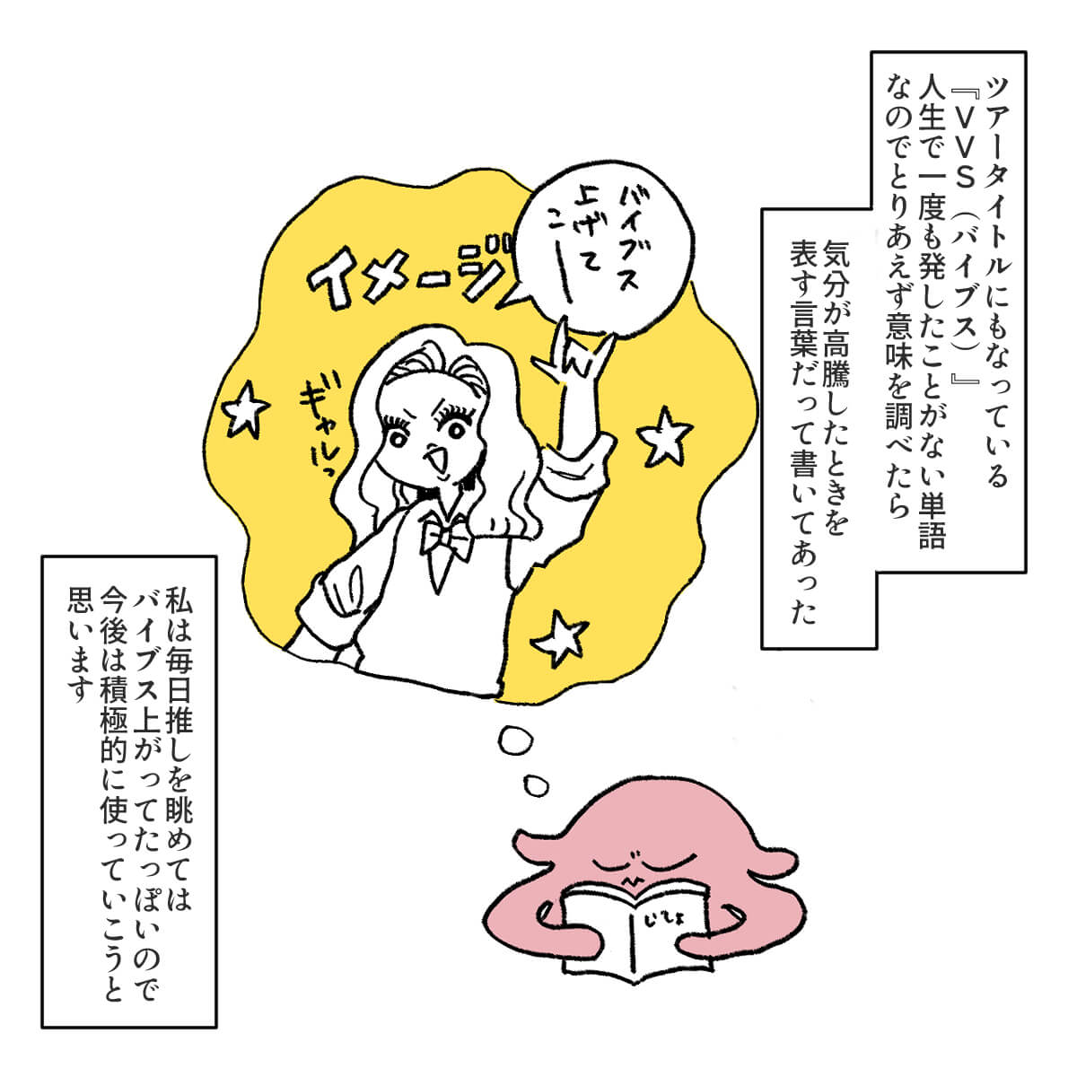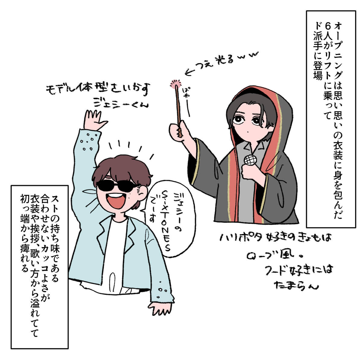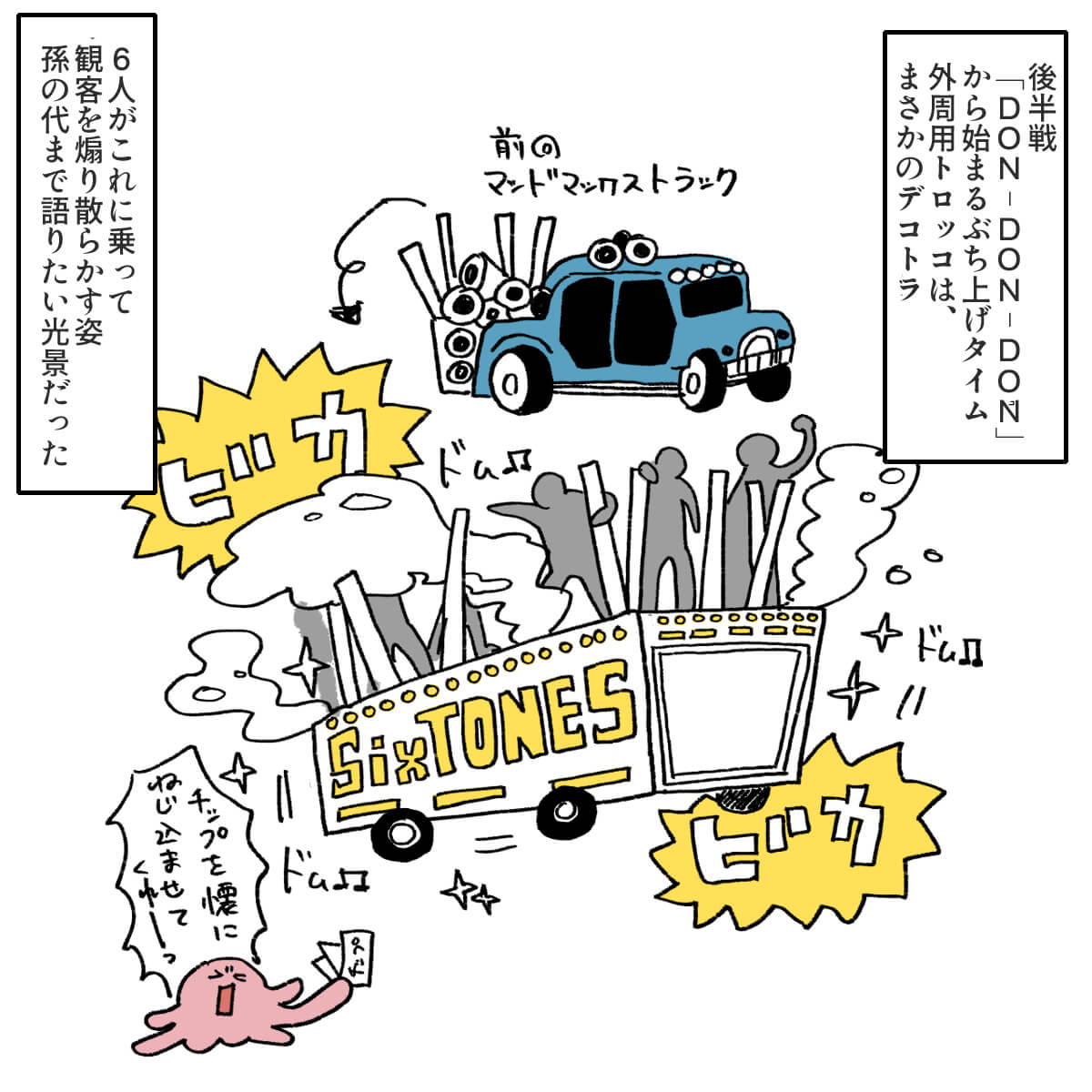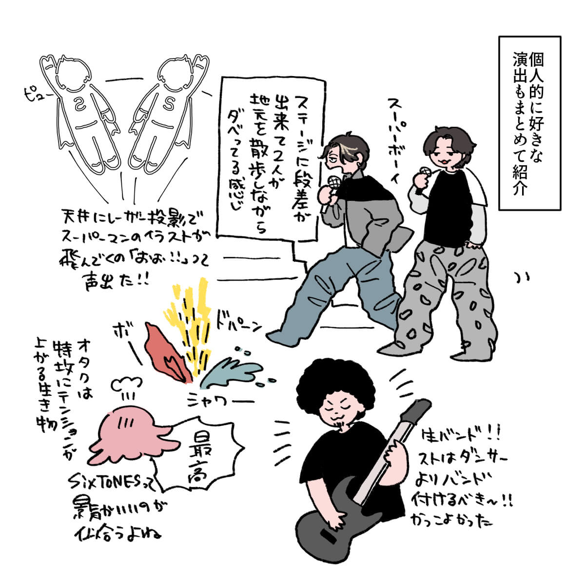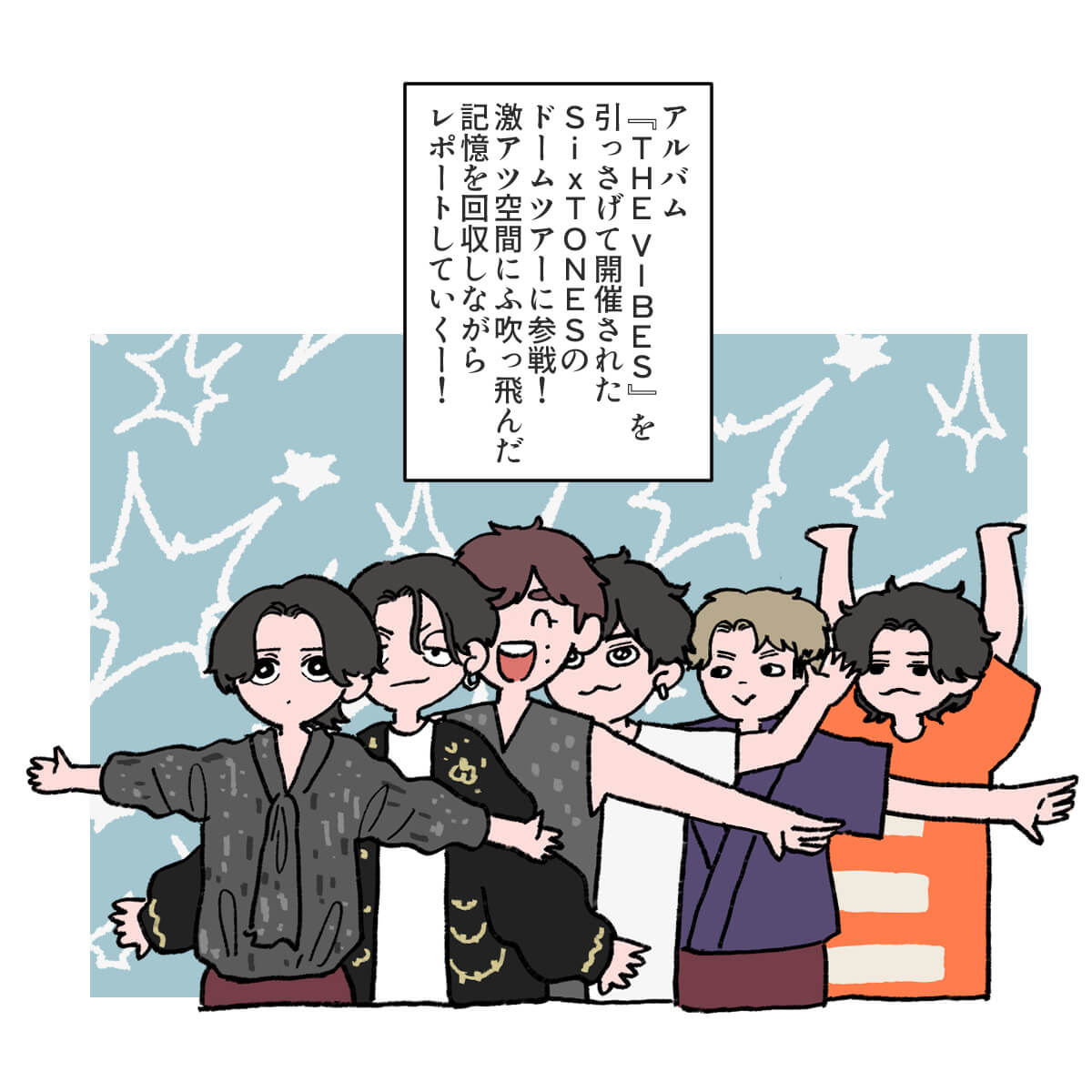 サイゾーウーマンSixTONESドーム公演『VVS』イラストレポ その他 [ドルオタ漫画家・竜田トキヒロの“推し事”見聞録]vol.53 田中樹の“ファンサ”に沼る!? SixTONESドーム公演『VVS』レポート 2024/04/24 21:00 竜田トキヒロ(マンガ家) SixTONES竜田トキヒロの“推し事”見聞録 ――Twitterで日々、STARTO ENTERTAINMENT(旧ジャニーズ事務所)のタレントをはじめとしたイラストを投稿中のドルオタ漫画家・竜田トキヒロが、現場レポートからドラマや映画、番組レビューまで、“推し事”の様子をお届け! 今回は、4月20~22日に東京ドームで行われたSixTONESのコンサート『SixTONES LIVE TOUR 2024 VVS』をレポート! SixTONESは、今年1月に4枚目アルバム『THE VIBES』をリリースし、同作を引っ提げ、2月からスタートした初の4大ドームツアーは、大阪、福岡、名古屋をまわり、今月20からの3日間は、最後の会場となる東京ドームにて公演を実施。 360度ステージで生バンドの演奏もあり、『THE VIBES』収録の新曲やユニット曲、ジュニア時代から歌われてきたものを含めた人気曲など、全33曲を披露しました。 いったいどんな内容になっていたのか、この記事では、メンバー6人の印象に残ったシーンなどをイラストでご紹介していきます! 目次 ・森本慎太郎に「バイブス上がってる」 ・田中樹に「沼る」“ファンサ”とは? ・「孫の代まで語りたい」メンバー6人の姿 ・SixTONESドーム公演で感じた“確信” SixTONES・森本慎太郎に「バイブス上がってる」と感じたワケ SixTONES・田中樹に「沼る」“ファンサ”とは? 「孫の代まで語りたい」SixTONESメンバー6人の姿 思わず泣きそうに? SixTONESドーム公演で感じた“確信” ★これまでの連載記事はこちらから 【ジャニオタマンガ】SixTONESが初ドームでマッドマックス化? 『慣声の法則』参戦レポ――Twitterで日々、ジャニーズタレントにまつわるイラストを投稿中のジャニオタ漫画家・竜田トキヒロが、現場レポートからドラマや映画、番組レビューまで、“推し事”の様子を...サイゾーウーマン2023.04.26 【ジャニオタマンガ】SixTONES・ジェシーの悪役が怖すぎる!? 映画『リボルバー・リリー』レビュー――Twitterで日々、ジャニーズタレントにまつわるイラストを投稿中のジャニオタ漫画家・竜田トキヒロが、現場レポートからドラマや映画、番組レビューまで、“推し事”の様子を...サイゾーウーマン2023.08.16 【ジャニオタマンガ】Snow Man&SixTONES『少クラ』卒業回をプレイバック!――Twitterで日々、ジャニーズタレントにまつわるイラストを投稿中のジャニオタ漫画家・竜田トキヒロが、現場レポートからドラマや映画、番組レビューまで、“推し事”の様子を...サイゾーウーマン2023.04.12 竜田トキヒロ(マンガ家) 漫画家、イラストレーター。育休中に執筆したエッセイ漫画でKADOKAWAコミックエッセイ大賞受賞。Ameba、ライブドア公式ブロガーを経たのち現在はインフルエンサーとしてエンタメ、オタクに特化した漫画やイラストや体験ルポ等幅広く執筆。著書『コミュ障母さんとごきげん娘』(KADOKAWA) X:@musumenuma 最終更新:2024/04/24 21:42 公演中におにぎりを食べるの、斬新すぎ 関連記事 【ジャニオタマンガ】SixTONES・ジェシーの悪役が怖すぎる!? 映画『リボルバー・リリー』レビュー【ジャニオタマンガ】SixTONESが初ドームでマッドマックス化? 『慣声の法則』参戦レポ【ジャニオタマンガ】Snow Man&SixTONES『少クラ』卒業回をプレイバック!SixTONES、ドーム公演でNumber_i「GOAT」披露も「配慮がない」? ネットで賛否両論SixTONES・田中樹は「大変だった」? ドーム公演で『ハマダ歌謡祭』公開収録に賛否 次の記事 ビーファ、MVの考察でファン白熱 >
