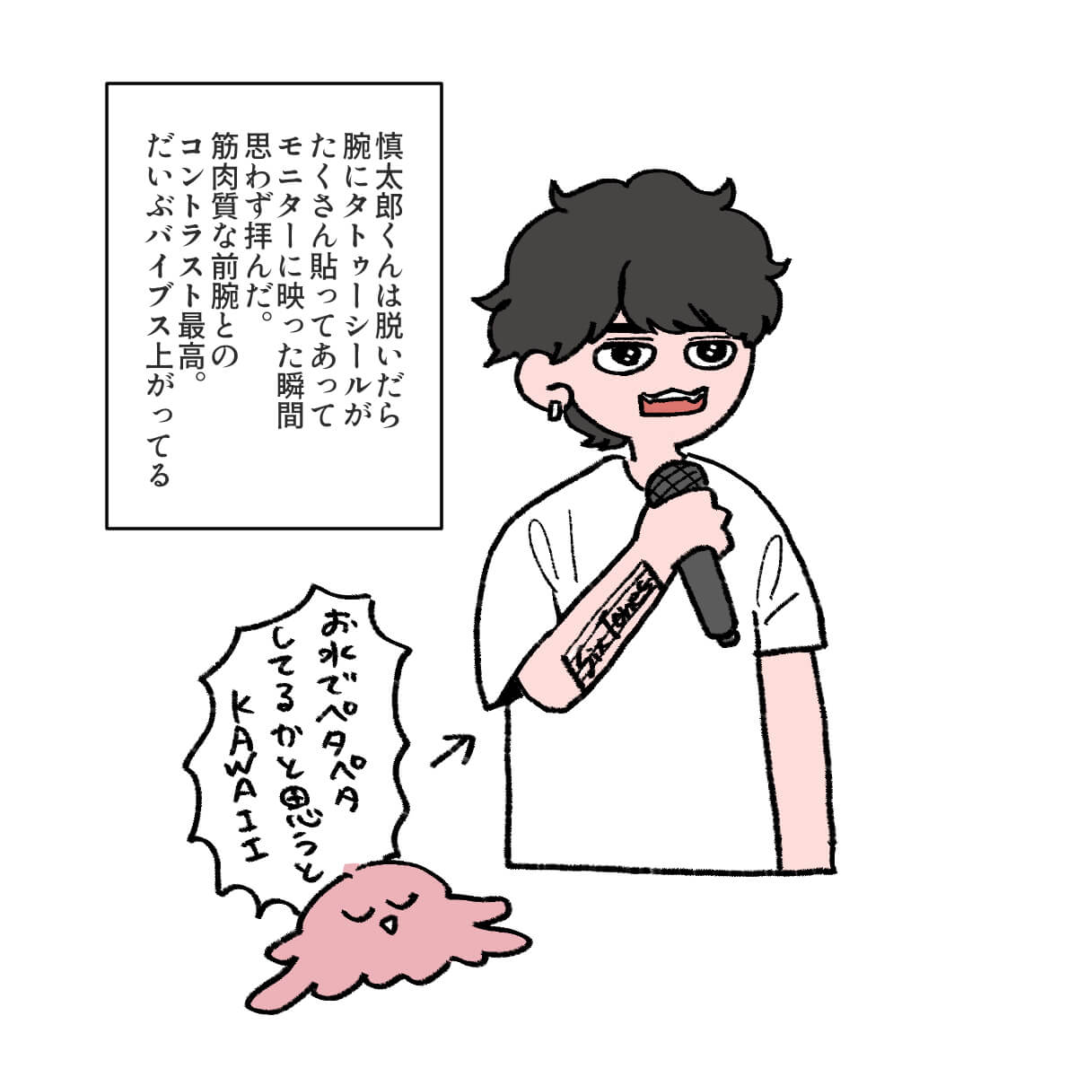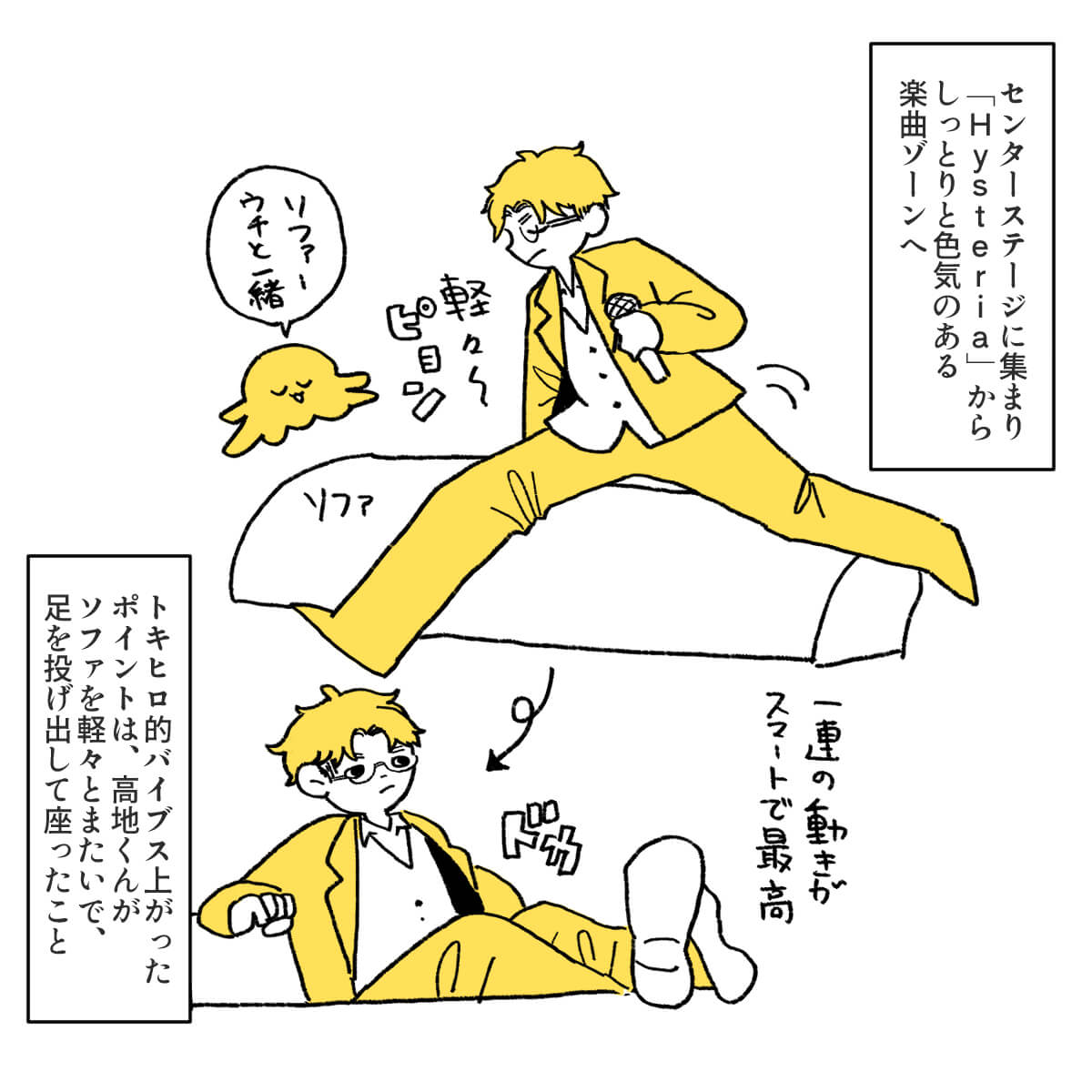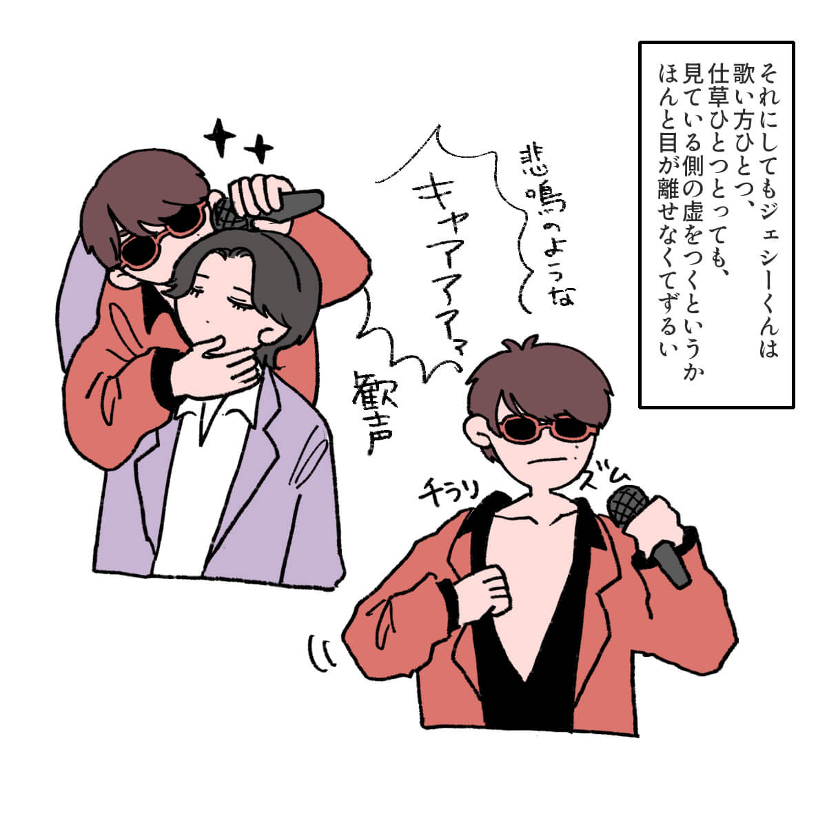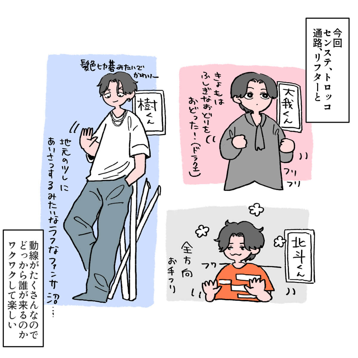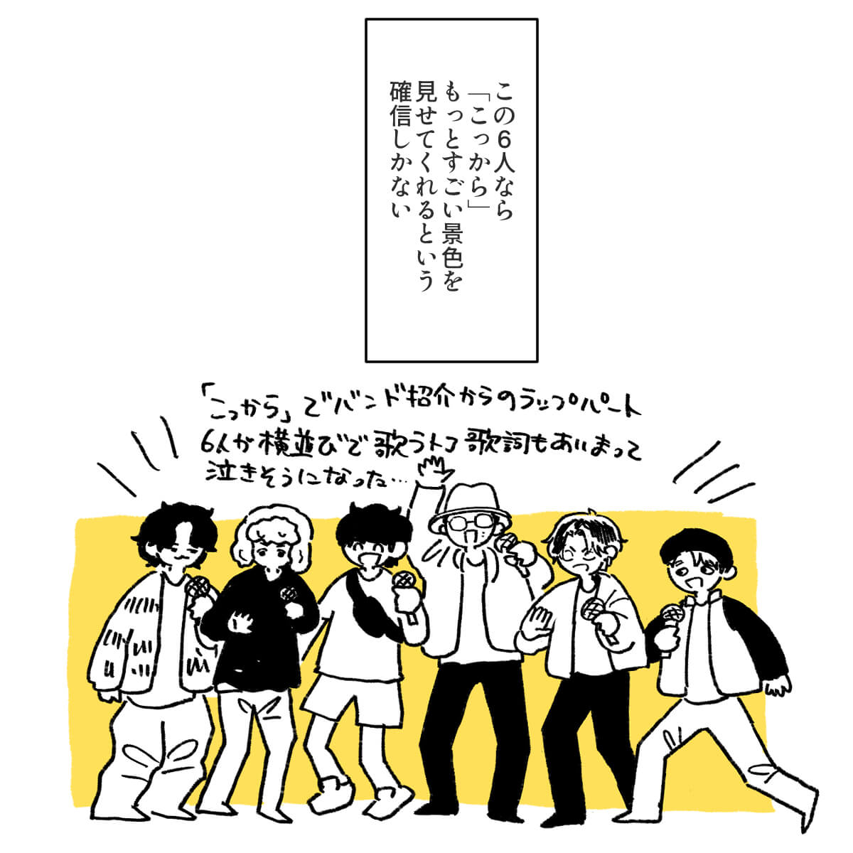 サイゾーウーマンSixTONESドーム公演『VVS』イラストレポ その他 [ドルオタ漫画家・竜田トキヒロの“推し事”見聞録]vol.53 田中樹の“ファンサ”に沼る!? SixTONESドーム公演『VVS』レポート 2024/04/24 21:00 竜田トキヒロ(マンガ家) SixTONES竜田トキヒロの“推し事”見聞録 ――Twitterで日々、STARTO ENTERTAINMENT(旧ジャニーズ事務所)のタレントをはじめとしたイラストを投稿中のドルオタ漫画家・竜田トキヒロが、現場レポートからドラマや映画、番組レビューまで、“推し事”の様子をお届け! 今回は、4月20~22日に東京ドームで行われたSixTONESのコンサート『SixTONES LIVE TOUR 2024 VVS』をレポート! SixTONESは、今年1月に4枚目アルバム『THE VIBES』をリリースし、同作を引っ提げ、2月からスタートした初の4大ドームツアーは、大阪、福岡、名古屋をまわり、今月20からの3日間は、最後の会場となる東京ドームにて公演を実施。 360度ステージで生バンドの演奏もあり、『THE VIBES』収録の新曲やユニット曲、ジュニア時代から歌われてきたものを含めた人気曲など、全33曲を披露しました。 いったいどんな内容になっていたのか、この記事では、メンバー6人の印象に残ったシーンなどをイラストでご紹介していきます! 目次 ・森本慎太郎に「バイブス上がってる」 ・田中樹に「沼る」“ファンサ”とは? ・「孫の代まで語りたい」メンバー6人の姿 ・SixTONESドーム公演で感じた“確信” SixTONES・森本慎太郎に「バイブス上がってる」と感じたワケ SixTONES・田中樹に「沼る」“ファンサ”とは? 「孫の代まで語りたい」SixTONESメンバー6人の姿 思わず泣きそうに? SixTONESドーム公演で感じた“確信” ★これまでの連載記事はこちらから 【ジャニオタマンガ】SixTONESが初ドームでマッドマックス化? 『慣声の法則』参戦レポ――Twitterで日々、ジャニーズタレントにまつわるイラストを投稿中のジャニオタ漫画家・竜田トキヒロが、現場レポートからドラマや映画、番組レビューまで、“推し事”の様子を...サイゾーウーマン2023.04.26 【ジャニオタマンガ】SixTONES・ジェシーの悪役が怖すぎる!? 映画『リボルバー・リリー』レビュー――Twitterで日々、ジャニーズタレントにまつわるイラストを投稿中のジャニオタ漫画家・竜田トキヒロが、現場レポートからドラマや映画、番組レビューまで、“推し事”の様子を...サイゾーウーマン2023.08.16 【ジャニオタマンガ】Snow Man&SixTONES『少クラ』卒業回をプレイバック!――Twitterで日々、ジャニーズタレントにまつわるイラストを投稿中のジャニオタ漫画家・竜田トキヒロが、現場レポートからドラマや映画、番組レビューまで、“推し事”の様子を...サイゾーウーマン2023.04.12 竜田トキヒロ(マンガ家) 漫画家、イラストレーター。育休中に執筆したエッセイ漫画でKADOKAWAコミックエッセイ大賞受賞。Ameba、ライブドア公式ブロガーを経たのち現在はインフルエンサーとしてエンタメ、オタクに特化した漫画やイラストや体験ルポ等幅広く執筆。著書『コミュ障母さんとごきげん娘』(KADOKAWA) X:@musumenuma 最終更新:2024/04/24 21:42 公演中におにぎりを食べるの、斬新すぎ 関連記事 【ジャニオタマンガ】SixTONES・ジェシーの悪役が怖すぎる!? 映画『リボルバー・リリー』レビュー【ジャニオタマンガ】SixTONESが初ドームでマッドマックス化? 『慣声の法則』参戦レポ【ジャニオタマンガ】Snow Man&SixTONES『少クラ』卒業回をプレイバック!SixTONES、ドーム公演でNumber_i「GOAT」披露も「配慮がない」? ネットで賛否両論SixTONES・田中樹は「大変だった」? ドーム公演で『ハマダ歌謡祭』公開収録に賛否 次の記事 ビーファ、MVの考察でファン白熱 >